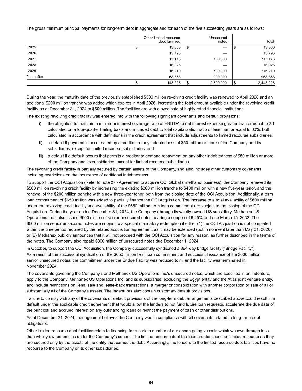 The gross minimum principal payments for long-term debt in aggregate and for each of the five succeeding years are as follows: Other limited recourse debt facilities Unsecured notes Total 2025 $ 13,660 $ — $ 13,660 2026 13,796 — 13,796 2027 15,173 700,000 715,173 2028 16,026 — 16,026 2029 16,210 700,000 716,210 Thereafter 68,363 900,000 968,363 $ 143,228 $ 2,300,000 $ 2,443,228 During the year, the maturity date of the previously established $300 million revolving credit facility was renewed to April 2028 and an additional $200 million tranche was added which expires in April 2026, increasing the total amount available under the revolving credit facility as at December 31, 2024 to $500 million. The facilities are with a syndicate of highly rated financial institutions. The existing revolving credit facility was entered into with the following significant covenants and default provisions: i) the obligation to maintain a minimum interest coverage ratio of EBITDA to net interest expense greater than or equal to 2:1 calculated on a four-quarter trailing basis and a funded debt to total capitalization ratio of less than or equal to 60%, both calculated in accordance with definitions in the credit agreement that include adjustments to limited recourse subsidiaries, ii) a default if payment is accelerated by a creditor on any indebtedness of $50 million or more of the Company and its subsidiaries, except for limited recourse subsidiaries, and iii) a default if a default occurs that permits a creditor to demand repayment on any other indebtedness of $50 million or more of the Company and its subsidiaries, except for limited recourse subsidiaries. The revolving credit facility is partially secured by certain assets of the Company, and also includes other customary covenants including restrictions on the incurrence of additional indebtedness. To support the OCI Acquisition (Refer to note 27 - Agreement to acquire OCI Global's methanol business), the Company renewed its $500 million revolving credit facility by increasing the existing $300 million tranche to $400 million with a new five-year tenor, and the renewal of the $200 million tranche with a new three-year tenor, both from the closing date of the OCI Acquisition. Additionally, a term loan commitment of $650 million was added to partially finance the OCI Acquisition. The increase to a total availability of $600 million under the revolving credit facility and availability of the $650 million term loan commitment are subject to the closing of the OCI Acquisition. During the year ended December 31, 2024, the Company (through its wholly-owned US subsidiary, Methanex US Operations Inc.) also issued $600 million of senior unsecured notes bearing a coupon of 6.25% and due March 15, 2032. The $600 million senior unsecured notes are subject to a special mandatory redemption if either (1) the OCI Acquisition is not completed within the time period required by the related acquisition agreement, as it may be extended (but in no event later than May 31, 2026) or (2) Methanex publicly announces that it will not proceed with the OCI Acquisition for any reason, as further described in the terms of the notes. The Company also repaid $300 million of unsecured notes due December 1, 2024. In October, to support the OCI Acquisition, the Company successfully syndicated a 364-day bridge facility (“Bridge Facility”). As a result of the successful syndication of the $650 million term loan commitment and successful issuance of the $600 million senior unsecured notes, the commitment under the Bridge Facility was reduced to nil and the facility was terminated in November 2024. The covenants governing the Company’s and Methanex US Operations Inc.'s unsecured notes, which are specified in an indenture, apply to the Company, Methanex US Operations Inc. and its subsidiaries, excluding the Egypt entity and the Atlas joint venture entity, and include restrictions on liens, sale and lease-back transactions, a merger or consolidation with another corporation or sale of all or substantially all of the Company’s assets. The indentures also contain customary default provisions. Failure to comply with any of the covenants or default provisions of the long-term debt arrangements described above could result in a default under the applicable credit agreement that would allow the lenders to not fund future loan requests, accelerate the due date of the principal and accrued interest on any outstanding loans or restrict the payment of cash or other distributions. As at December 31, 2024, management believes the Company was in compliance with all covenants related to long-term debt obligations. Other limited recourse debt facilities relate to financing for a certain number of our ocean going vessels which we own through less than wholly-owned entities under the Company's control. The limited recourse debt facilities are described as limited recourse as they are secured only by the assets of the entity that carries the debt. Accordingly, the lenders to the limited recourse debt facilities have no recourse to the Company or its other subsidiaries. 64