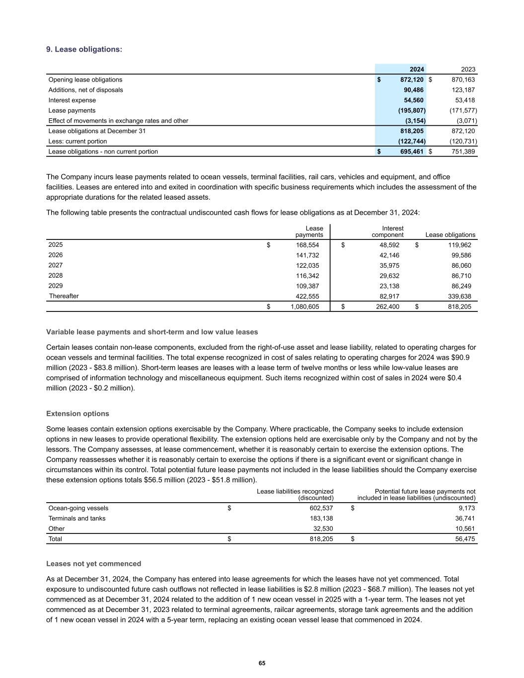 9. Lease obligations: 2024 2023 Opening lease obligations $ 872,120 $ 870,163 Additions, net of disposals 90,486 123,187 Interest expense 54,560 53,418 Lease payments (195,807) (171,577) Effect of movements in exchange rates and other (3,154) (3,071) Lease obligations at December 31 818,205 872,120 Less: current portion (122,744) (120,731) Lease obligations - non current portion $ 695,461 $ 751,389 The Company incurs lease payments related to ocean vessels, terminal facilities, rail cars, vehicles and equipment, and office facilities. Leases are entered into and exited in coordination with specific business requirements which includes the assessment of the appropriate durations for the related leased assets. The following table presents the contractual undiscounted cash flows for lease obligations as at December 31, 2024: Lease payments Interest component Lease obligations 2025 $ 168,554 $ 48,592 $ 119,962 2026 141,732 42,146 99,586 2027 122,035 35,975 86,060 2028 116,342 29,632 86,710 2029 109,387 23,138 86,249 Thereafter 422,555 82,917 339,638 $ 1,080,605 $ 262,400 $ 818,205 Variable lease payments and short-term and low value leases Certain leases contain non-lease components, excluded from the right-of-use asset and lease liability, related to operating charges for ocean vessels and terminal facilities. The total expense recognized in cost of sales relating to operating charges for 2024 was $90.9 million (2023 - $83.8 million). Short-term leases are leases with a lease term of twelve months or less while low-value leases are comprised of information technology and miscellaneous equipment. Such items recognized within cost of sales in 2024 were $0.4 million (2023 - $0.2 million). Extension options Some leases contain extension options exercisable by the Company. Where practicable, the Company seeks to include extension options in new leases to provide operational flexibility. The extension options held are exercisable only by the Company and not by the lessors. The Company assesses, at lease commencement, whether it is reasonably certain to exercise the extension options. The Company reassesses whether it is reasonably certain to exercise the options if there is a significant event or significant change in circumstances within its control. Total potential future lease payments not included in the lease liabilities should the Company exercise these extension options totals $56.5 million (2023 - $51.8 million). Lease liabilities recognized (discounted) Potential future lease payments not included in lease liabilities (undiscounted) Ocean-going vessels $ 602,537 $ 9,173 Terminals and tanks 183,138 36,741 Other 32,530 10,561 Total $ 818,205 $ 56,475 Leases not yet commenced As at December 31, 2024, the Company has entered into lease agreements for which the leases have not yet commenced. Total exposure to undiscounted future cash outflows not reflected in lease liabilities is $2.8 million (2023 - $68.7 million). The leases not yet commenced as at December 31, 2024 related to the addition of 1 new ocean vessel in 2025 with a 1-year term. The leases not yet commenced as at December 31, 2023 related to terminal agreements, railcar agreements, storage tank agreements and the addition of 1 new ocean vessel in 2024 with a 5-year term, replacing an existing ocean vessel lease that commenced in 2024. 65
