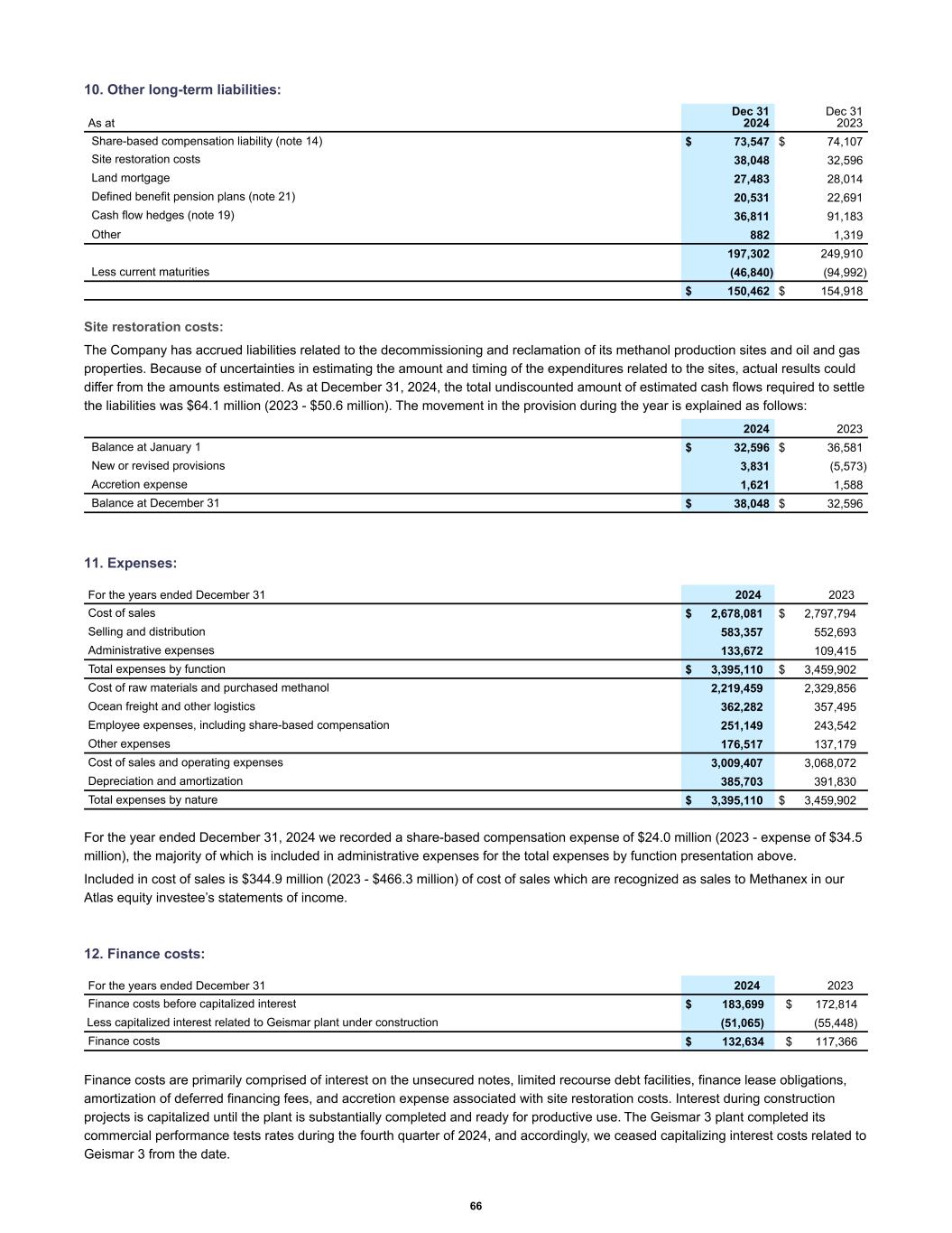 10. Other long-term liabilities: Share-based compensation liability (note 14) $ 73,547 $ 74,107 Site restoration costs 38,048 32,596 Land mortgage 27,483 28,014 Defined benefit pension plans (note 21) 20,531 22,691 Cash flow hedges (note 19) 36,811 91,183 Other 882 1,319 197,302 249,910 Less current maturities (46,840) (94,992) $ 150,462 $ 154,918 As at Dec 31 2024 Dec 31 2023 Site restoration costs: The Company has accrued liabilities related to the decommissioning and reclamation of its methanol production sites and oil and gas properties. Because of uncertainties in estimating the amount and timing of the expenditures related to the sites, actual results could differ from the amounts estimated. As at December 31, 2024, the total undiscounted amount of estimated cash flows required to settle the liabilities was $64.1 million (2023 - $50.6 million). The movement in the provision during the year is explained as follows: Balance at January 1 $ 32,596 $ 36,581 New or revised provisions 3,831 (5,573) Accretion expense 1,621 1,588 Balance at December 31 $ 38,048 $ 32,596 2024 2023 11. Expenses: Cost of sales $ 2,678,081 $ 2,797,794 Selling and distribution 583,357 552,693 Administrative expenses 133,672 109,415 Total expenses by function $ 3,395,110 $ 3,459,902 Cost of raw materials and purchased methanol 2,219,459 2,329,856 Ocean freight and other logistics 362,282 357,495 Employee expenses, including share-based compensation 251,149 243,542 Other expenses 176,517 137,179 Cost of sales and operating expenses 3,009,407 3,068,072 Depreciation and amortization 385,703 391,830 Total expenses by nature $ 3,395,110 $ 3,459,902 For the years ended December 31 2024 2023 For the year ended December 31, 2024 we recorded a share-based compensation expense of $24.0 million (2023 - expense of $34.5 million), the majority of which is included in administrative expenses for the total expenses by function presentation above. Included in cost of sales is $344.9 million (2023 - $466.3 million) of cost of sales which are recognized as sales to Methanex in our Atlas equity investee’s statements of income. 12. Finance costs: For the years ended December 31 2024 2023 Finance costs before capitalized interest $ 183,699 $ 172,814 Less capitalized interest related to Geismar plant under construction (51,065) (55,448) Finance costs $ 132,634 $ 117,366 Finance costs are primarily comprised of interest on the unsecured notes, limited recourse debt facilities, finance lease obligations, amortization of deferred financing fees, and accretion expense associated with site restoration costs. Interest during construction projects is capitalized until the plant is substantially completed and ready for productive use. The Geismar 3 plant completed its commercial performance tests rates during the fourth quarter of 2024, and accordingly, we ceased capitalizing interest costs related to Geismar 3 from the date. 66