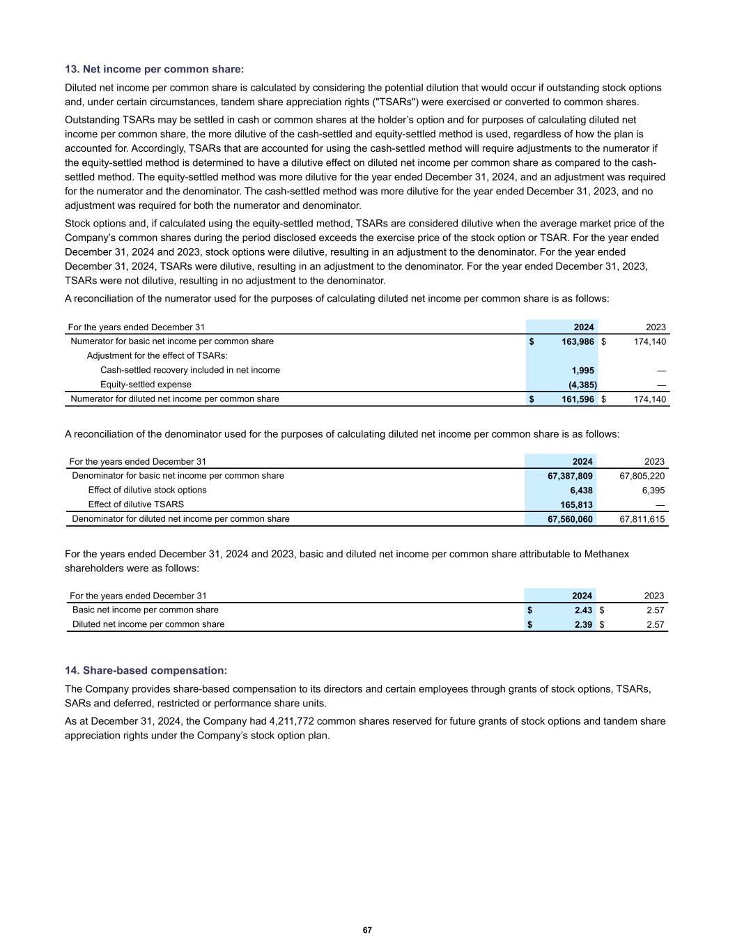 13. Net income per common share: Diluted net income per common share is calculated by considering the potential dilution that would occur if outstanding stock options and, under certain circumstances, tandem share appreciation rights ("TSARs") were exercised or converted to common shares. Outstanding TSARs may be settled in cash or common shares at the holder’s option and for purposes of calculating diluted net income per common share, the more dilutive of the cash-settled and equity-settled method is used, regardless of how the plan is accounted for. Accordingly, TSARs that are accounted for using the cash-settled method will require adjustments to the numerator if the equity-settled method is determined to have a dilutive effect on diluted net income per common share as compared to the cash- settled method. The equity-settled method was more dilutive for the year ended December 31, 2024, and an adjustment was required for the numerator and the denominator. The cash-settled method was more dilutive for the year ended December 31, 2023, and no adjustment was required for both the numerator and denominator. Stock options and, if calculated using the equity-settled method, TSARs are considered dilutive when the average market price of the Company’s common shares during the period disclosed exceeds the exercise price of the stock option or TSAR. For the year ended December 31, 2024 and 2023, stock options were dilutive, resulting in an adjustment to the denominator. For the year ended December 31, 2024, TSARs were dilutive, resulting in an adjustment to the denominator. For the year ended December 31, 2023, TSARs were not dilutive, resulting in no adjustment to the denominator. A reconciliation of the numerator used for the purposes of calculating diluted net income per common share is as follows: For the years ended December 31 2024 2023 Numerator for basic net income per common share $ 163,986 $ 174,140 Adjustment for the effect of TSARs: Cash-settled recovery included in net income 1,995 — Equity-settled expense (4,385) — Numerator for diluted net income per common share $ 161,596 $ 174,140 A reconciliation of the denominator used for the purposes of calculating diluted net income per common share is as follows: Denominator for basic net income per common share 67,387,809 67,805,220 Effect of dilutive stock options 6,438 6,395 Effect of dilutive TSARS 165,813 — Denominator for diluted net income per common share 67,560,060 67,811,615 For the years ended December 31 2024 2023 For the years ended December 31, 2024 and 2023, basic and diluted net income per common share attributable to Methanex shareholders were as follows: Basic net income per common share $ 2.43 $ 2.57 Diluted net income per common share $ 2.39 $ 2.57 For the years ended December 31 2024 2023 14. Share-based compensation: The Company provides share-based compensation to its directors and certain employees through grants of stock options, TSARs, SARs and deferred, restricted or performance share units. As at December 31, 2024, the Company had 4,211,772 common shares reserved for future grants of stock options and tandem share appreciation rights under the Company’s stock option plan. 67