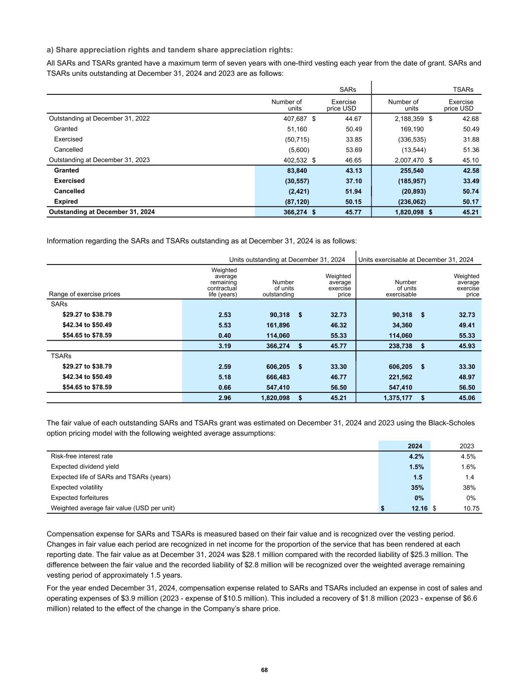 a) Share appreciation rights and tandem share appreciation rights: All SARs and TSARs granted have a maximum term of seven years with one-third vesting each year from the date of grant. SARs and TSARs units outstanding at December 31, 2024 and 2023 are as follows: Number of units Exercise price USD Number of units Exercise price USD Outstanding at December 31, 2022 407,687 $ 44.67 2,188,359 $ 42.68 Granted 51,160 50.49 169,190 50.49 Exercised (50,715) 33.85 (336,535) 31.88 Cancelled (5,600) 53.69 (13,544) 51.36 Outstanding at December 31, 2023 402,532 $ 46.65 2,007,470 $ 45.10 Granted 83,840 43.13 255,540 42.58 Exercised (30,557) 37.10 (185,957) 33.49 Cancelled (2,421) 51.94 (20,893) 50.74 Expired (87,120) 50.15 (236,062) 50.17 Outstanding at December 31, 2024 366,274 $ 45.77 1,820,098 $ 45.21 SARs TSARs Information regarding the SARs and TSARs outstanding as at December 31, 2024 is as follows: Range of exercise prices Weighted average remaining contractual life (years) Number of units outstanding Weighted average exercise price Number of units exercisable Weighted average exercise price SARs $29.27 to $38.79 2.53 90,318 $ 32.73 90,318 $ 32.73 $42.34 to $50.49 5.53 161,896 46.32 34,360 49.41 $54.65 to $78.59 0.40 114,060 55.33 114,060 55.33 3.19 366,274 $ 45.77 238,738 $ 45.93 TSARs $29.27 to $38.79 2.59 606,205 $ 33.30 606,205 $ 33.30 $42.34 to $50.49 5.18 666,483 46.77 221,562 48.97 $54.65 to $78.59 0.66 547,410 56.50 547,410 56.50 2.96 1,820,098 $ 45.21 1,375,177 $ 45.06 Units outstanding at December 31, 2024 Units exercisable at December 31, 2024 The fair value of each outstanding SARs and TSARs grant was estimated on December 31, 2024 and 2023 using the Black-Scholes option pricing model with the following weighted average assumptions: Risk-free interest rate 4.2 % 4.5 % Expected dividend yield 1.5 % 1.6 % Expected life of SARs and TSARs (years) 1.5 1.4 Expected volatility 35 % 38 % Expected forfeitures 0 % 0 % Weighted average fair value (USD per unit) $ 12.16 $ 10.75 2024 2023 Compensation expense for SARs and TSARs is measured based on their fair value and is recognized over the vesting period. Changes in fair value each period are recognized in net income for the proportion of the service that has been rendered at each reporting date. The fair value as at December 31, 2024 was $28.1 million compared with the recorded liability of $25.3 million. The difference between the fair value and the recorded liability of $2.8 million will be recognized over the weighted average remaining vesting period of approximately 1.5 years. For the year ended December 31, 2024, compensation expense related to SARs and TSARs included an expense in cost of sales and operating expenses of $3.9 million (2023 - expense of $10.5 million). This included a recovery of $1.8 million (2023 - expense of $6.6 million) related to the effect of the change in the Company’s share price. 68
