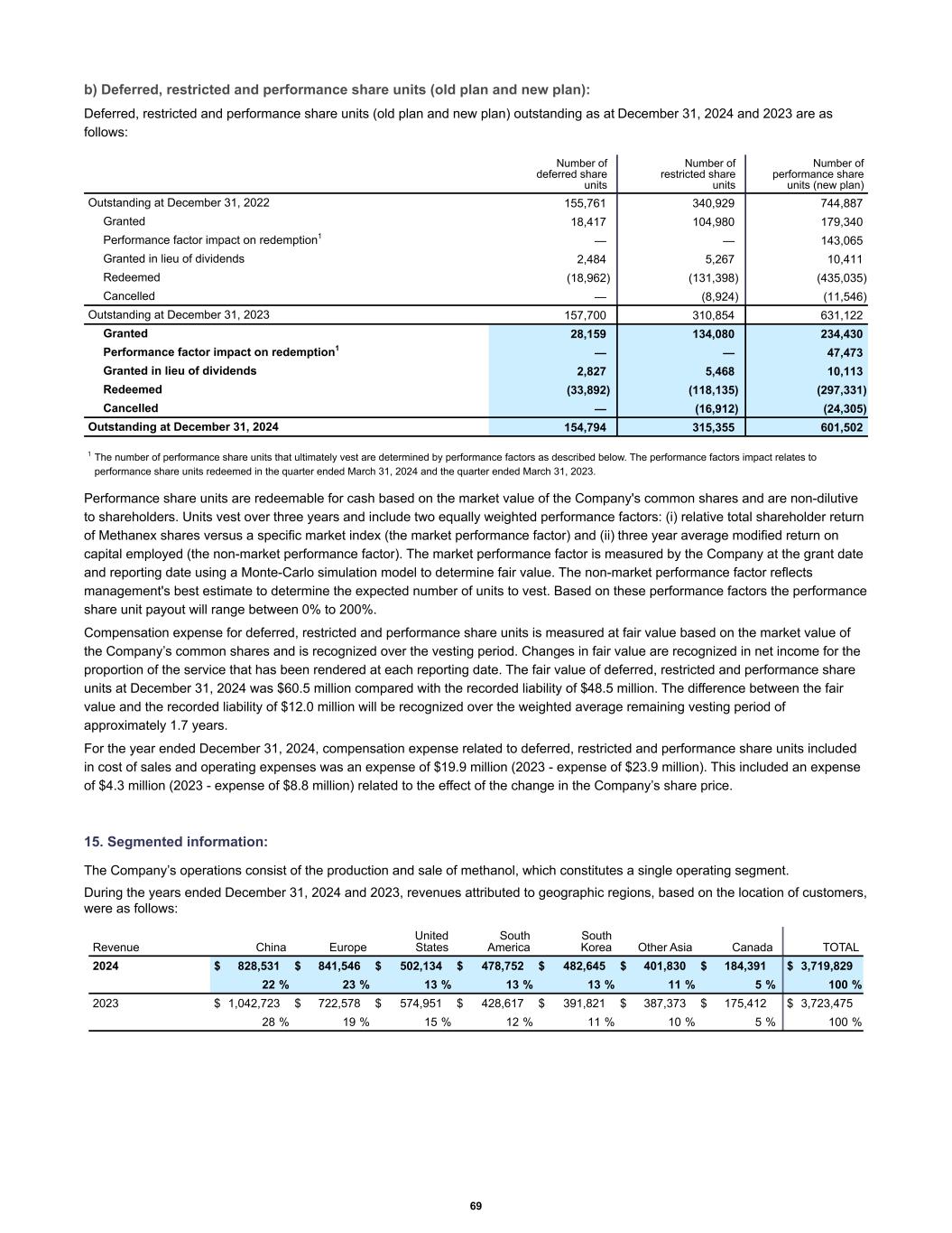 b) Deferred, restricted and performance share units (old plan and new plan): Deferred, restricted and performance share units (old plan and new plan) outstanding as at December 31, 2024 and 2023 are as follows: Outstanding at December 31, 2022 155,761 340,929 744,887 Granted 18,417 104,980 179,340 Performance factor impact on redemption1 — — 143,065 Granted in lieu of dividends 2,484 5,267 10,411 Redeemed (18,962) (131,398) (435,035) Cancelled — (8,924) (11,546) Outstanding at December 31, 2023 157,700 310,854 631,122 Granted 28,159 134,080 234,430 Performance factor impact on redemption1 — — 47,473 Granted in lieu of dividends 2,827 5,468 10,113 Redeemed (33,892) (118,135) (297,331) Cancelled — (16,912) (24,305) Outstanding at December 31, 2024 154,794 315,355 601,502 Number of deferred share units Number of restricted share units Number of performance share units (new plan) 1 The number of performance share units that ultimately vest are determined by performance factors as described below. The performance factors impact relates to performance share units redeemed in the quarter ended March 31, 2024 and the quarter ended March 31, 2023. Performance share units are redeemable for cash based on the market value of the Company's common shares and are non-dilutive to shareholders. Units vest over three years and include two equally weighted performance factors: (i) relative total shareholder return of Methanex shares versus a specific market index (the market performance factor) and (ii) three year average modified return on capital employed (the non-market performance factor). The market performance factor is measured by the Company at the grant date and reporting date using a Monte-Carlo simulation model to determine fair value. The non-market performance factor reflects management's best estimate to determine the expected number of units to vest. Based on these performance factors the performance share unit payout will range between 0% to 200%. Compensation expense for deferred, restricted and performance share units is measured at fair value based on the market value of the Company’s common shares and is recognized over the vesting period. Changes in fair value are recognized in net income for the proportion of the service that has been rendered at each reporting date. The fair value of deferred, restricted and performance share units at December 31, 2024 was $60.5 million compared with the recorded liability of $48.5 million. The difference between the fair value and the recorded liability of $12.0 million will be recognized over the weighted average remaining vesting period of approximately 1.7 years. For the year ended December 31, 2024, compensation expense related to deferred, restricted and performance share units included in cost of sales and operating expenses was an expense of $19.9 million (2023 - expense of $23.9 million). This included an expense of $4.3 million (2023 - expense of $8.8 million) related to the effect of the change in the Company’s share price. 15. Segmented information: The Company’s operations consist of the production and sale of methanol, which constitutes a single operating segment. During the years ended December 31, 2024 and 2023, revenues attributed to geographic regions, based on the location of customers, were as follows: 2024 $ 828,531 $ 841,546 $ 502,134 $ 478,752 $ 482,645 $ 401,830 $ 184,391 $ 3,719,829 22 % 23 % 13 % 13 % 13 % 11 % 5 % 100 % 2023 $ 1,042,723 $ 722,578 $ 574,951 $ 428,617 $ 391,821 $ 387,373 $ 175,412 $ 3,723,475 28 % 19 % 15 % 12 % 11 % 10 % 5 % 100 % Revenue China Europe United States South America South Korea Other Asia Canada TOTAL 69