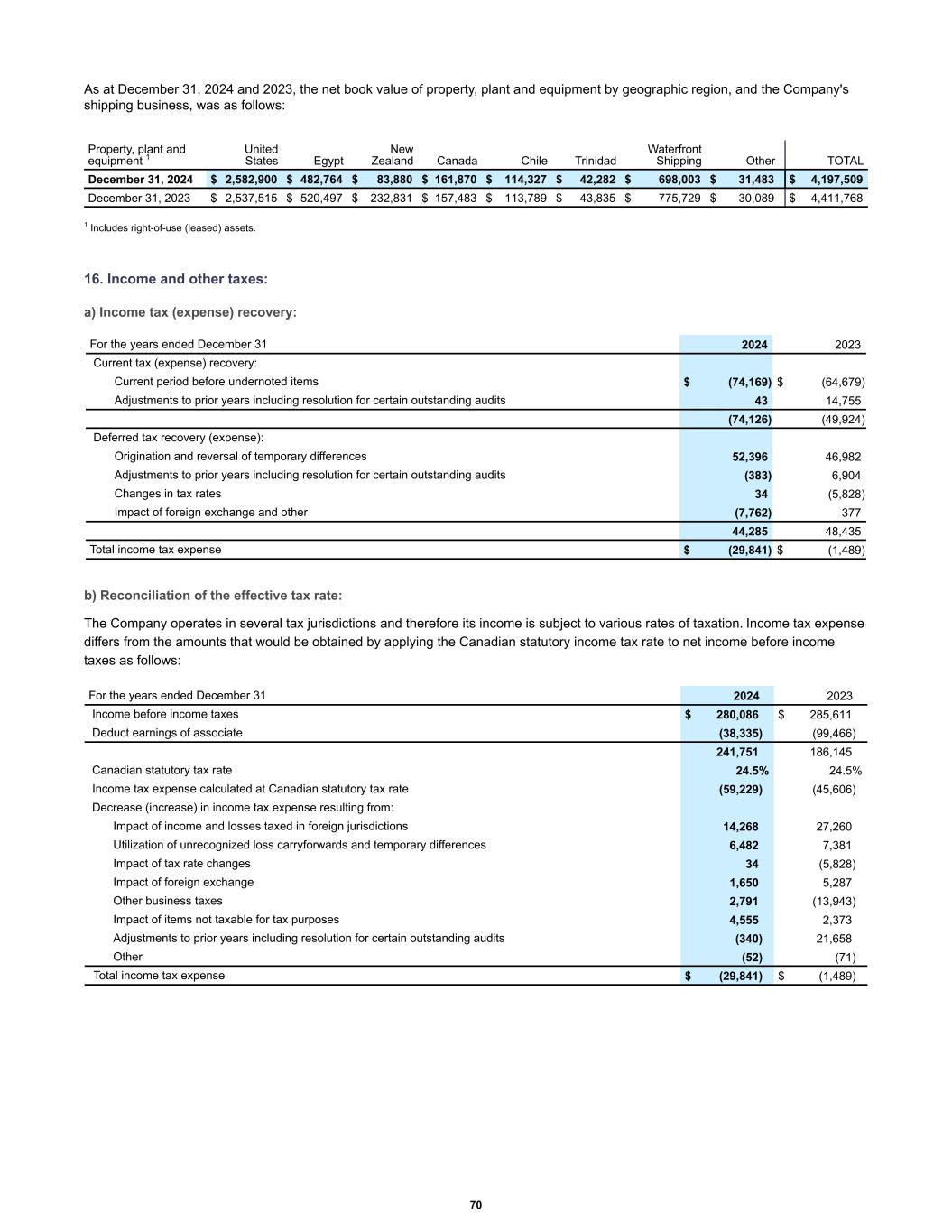 As at December 31, 2024 and 2023, the net book value of property, plant and equipment by geographic region, and the Company's shipping business, was as follows: December 31, 2024 $ 2,582,900 $ 482,764 $ 83,880 $ 161,870 $ 114,327 $ 42,282 $ 698,003 $ 31,483 $ 4,197,509 December 31, 2023 $ 2,537,515 $ 520,497 $ 232,831 $ 157,483 $ 113,789 $ 43,835 $ 775,729 $ 30,089 $ 4,411,768 Property, plant and equipment 1 United States Egypt New Zealand Canada Chile Trinidad Waterfront Shipping Other TOTAL 1 Includes right-of-use (leased) assets. 16. Income and other taxes: a) Income tax (expense) recovery: Current tax (expense) recovery: Current period before undernoted items $ (74,169) $ (64,679) Adjustments to prior years including resolution for certain outstanding audits 43 14,755 (74,126) (49,924) Deferred tax recovery (expense): Origination and reversal of temporary differences 52,396 46,982 Adjustments to prior years including resolution for certain outstanding audits (383) 6,904 Changes in tax rates 34 (5,828) Impact of foreign exchange and other (7,762) 377 44,285 48,435 Total income tax expense $ (29,841) $ (1,489) For the years ended December 31 2024 2023 b) Reconciliation of the effective tax rate: The Company operates in several tax jurisdictions and therefore its income is subject to various rates of taxation. Income tax expense differs from the amounts that would be obtained by applying the Canadian statutory income tax rate to net income before income taxes as follows: Income before income taxes $ 280,086 $ 285,611 Deduct earnings of associate (38,335) (99,466) 241,751 186,145 Canadian statutory tax rate 24.5% 24.5% Income tax expense calculated at Canadian statutory tax rate (59,229) (45,606) Decrease (increase) in income tax expense resulting from: Impact of income and losses taxed in foreign jurisdictions 14,268 27,260 Utilization of unrecognized loss carryforwards and temporary differences 6,482 7,381 Impact of tax rate changes 34 (5,828) Impact of foreign exchange 1,650 5,287 Other business taxes 2,791 (13,943) Impact of items not taxable for tax purposes 4,555 2,373 Adjustments to prior years including resolution for certain outstanding audits (340) 21,658 Other (52) (71) Total income tax expense $ (29,841) $ (1,489) For the years ended December 31 2024 2023 70