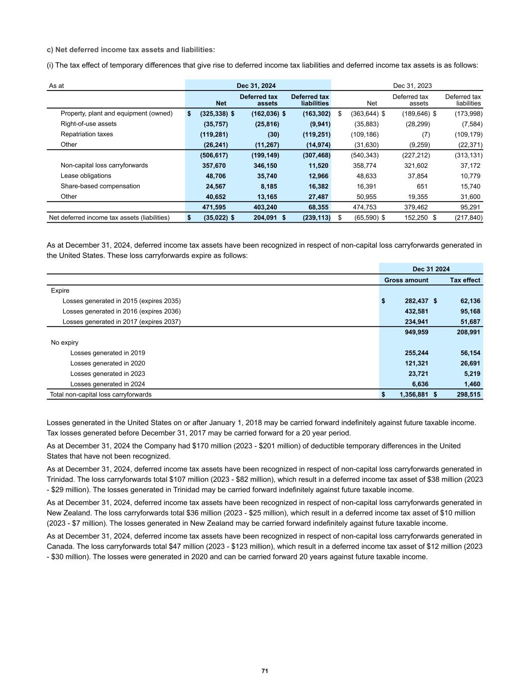c) Net deferred income tax assets and liabilities: (i) The tax effect of temporary differences that give rise to deferred income tax liabilities and deferred income tax assets is as follows: Net Deferred tax assets Deferred tax liabilities Net Deferred tax assets Deferred tax liabilities Property, plant and equipment (owned) $ (325,338) $ (162,036) $ (163,302) $ (363,644) $ (189,646) $ (173,998) Right-of-use assets (35,757) (25,816) (9,941) (35,883) (28,299) (7,584) Repatriation taxes (119,281) (30) (119,251) (109,186) (7) (109,179) Other (26,241) (11,267) (14,974) (31,630) (9,259) (22,371) (506,617) (199,149) (307,468) (540,343) (227,212) (313,131) Non-capital loss carryforwards 357,670 346,150 11,520 358,774 321,602 37,172 Lease obligations 48,706 35,740 12,966 48,633 37,854 10,779 Share-based compensation 24,567 8,185 16,382 16,391 651 15,740 Other 40,652 13,165 27,487 50,955 19,355 31,600 471,595 403,240 68,355 474,753 379,462 95,291 Net deferred income tax assets (liabilities) $ (35,022) $ 204,091 $ (239,113) $ (65,590) $ 152,250 $ (217,840) As at Dec 31, 2024 Dec 31, 2023 As at December 31, 2024, deferred income tax assets have been recognized in respect of non-capital loss carryforwards generated in the United States. These loss carryforwards expire as follows: Dec 31 2024 Gross amount Tax effect Expire Losses generated in 2015 (expires 2035) $ 282,437 $ 62,136 Losses generated in 2016 (expires 2036) 432,581 95,168 Losses generated in 2017 (expires 2037) 234,941 51,687 949,959 208,991 No expiry Losses generated in 2019 255,244 56,154 Losses generated in 2020 121,321 26,691 Losses generated in 2023 23,721 5,219 Losses generated in 2024 6,636 1,460 Total non-capital loss carryforwards $ 1,356,881 $ 298,515 Losses generated in the United States on or after January 1, 2018 may be carried forward indefinitely against future taxable income. Tax losses generated before December 31, 2017 may be carried forward for a 20 year period. As at December 31, 2024 the Company had $170 million (2023 - $201 million) of deductible temporary differences in the United States that have not been recognized. As at December 31, 2024, deferred income tax assets have been recognized in respect of non-capital loss carryforwards generated in Trinidad. The loss carryforwards total $107 million (2023 - $82 million), which result in a deferred income tax asset of $38 million (2023 - $29 million). The losses generated in Trinidad may be carried forward indefinitely against future taxable income. As at December 31, 2024, deferred income tax assets have been recognized in respect of non-capital loss carryforwards generated in New Zealand. The loss carryforwards total $36 million (2023 - $25 million), which result in a deferred income tax asset of $10 million (2023 - $7 million). The losses generated in New Zealand may be carried forward indefinitely against future taxable income. As at December 31, 2024, deferred income tax assets have been recognized in respect of non-capital loss carryforwards generated in Canada. The loss carryforwards total $47 million (2023 - $123 million), which result in a deferred income tax asset of $12 million (2023 - $30 million). The losses were generated in 2020 and can be carried forward 20 years against future taxable income. 71