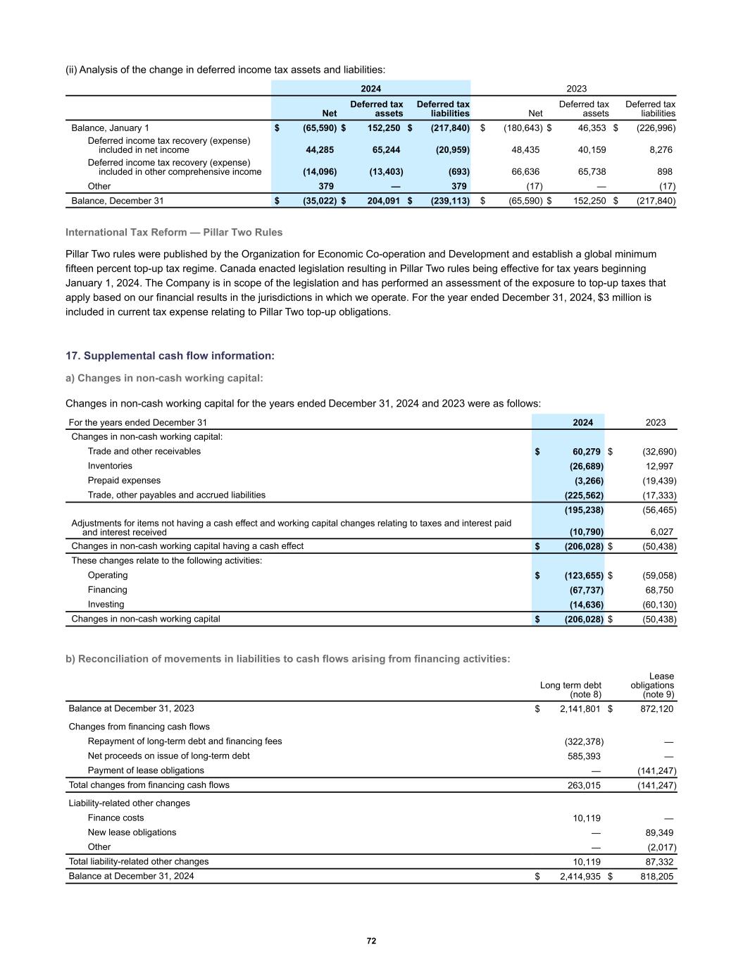 (ii) Analysis of the change in deferred income tax assets and liabilities: Net Deferred tax assets Deferred tax liabilities Net Deferred tax assets Deferred tax liabilities Balance, January 1 $ (65,590) $ 152,250 $ (217,840) $ (180,643) $ 46,353 $ (226,996) Deferred income tax recovery (expense) included in net income 44,285 65,244 (20,959) 48,435 40,159 8,276 Deferred income tax recovery (expense) included in other comprehensive income (14,096) (13,403) (693) 66,636 65,738 898 Other 379 — 379 (17) — (17) Balance, December 31 $ (35,022) $ 204,091 $ (239,113) $ (65,590) $ 152,250 $ (217,840) 2024 2023 International Tax Reform — Pillar Two Rules Pillar Two rules were published by the Organization for Economic Co-operation and Development and establish a global minimum fifteen percent top-up tax regime. Canada enacted legislation resulting in Pillar Two rules being effective for tax years beginning January 1, 2024. The Company is in scope of the legislation and has performed an assessment of the exposure to top-up taxes that apply based on our financial results in the jurisdictions in which we operate. For the year ended December 31, 2024, $3 million is included in current tax expense relating to Pillar Two top-up obligations. 17. Supplemental cash flow information: a) Changes in non-cash working capital: Changes in non-cash working capital for the years ended December 31, 2024 and 2023 were as follows: Changes in non-cash working capital: Trade and other receivables $ 60,279 $ (32,690) Inventories (26,689) 12,997 Prepaid expenses (3,266) (19,439) Trade, other payables and accrued liabilities (225,562) (17,333) (195,238) (56,465) Adjustments for items not having a cash effect and working capital changes relating to taxes and interest paid and interest received (10,790) 6,027 Changes in non-cash working capital having a cash effect $ (206,028) $ (50,438) These changes relate to the following activities: Operating $ (123,655) $ (59,058) Financing (67,737) 68,750 Investing (14,636) (60,130) Changes in non-cash working capital $ (206,028) $ (50,438) For the years ended December 31 2024 2023 b) Reconciliation of movements in liabilities to cash flows arising from financing activities: Long term debt (note 8) Lease obligations (note 9) Balance at December 31, 2023 $ 2,141,801 $ 872,120 Changes from financing cash flows Repayment of long-term debt and financing fees (322,378) — Net proceeds on issue of long-term debt 585,393 — Payment of lease obligations — (141,247) Total changes from financing cash flows 263,015 (141,247) Liability-related other changes Finance costs 10,119 — New lease obligations — 89,349 Other — (2,017) Total liability-related other changes 10,119 87,332 Balance at December 31, 2024 $ 2,414,935 $ 818,205 72