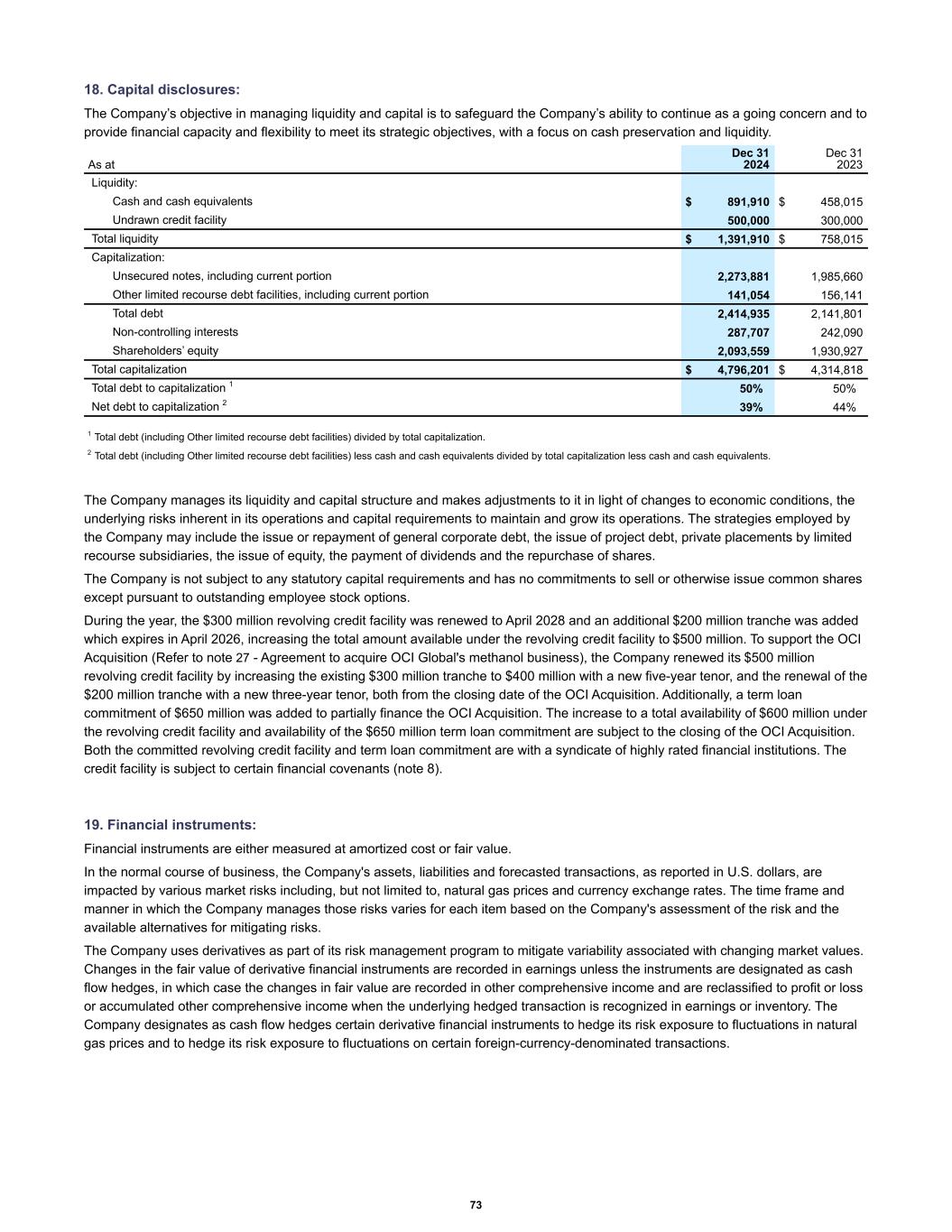 18. Capital disclosures: The Company’s objective in managing liquidity and capital is to safeguard the Company’s ability to continue as a going concern and to provide financial capacity and flexibility to meet its strategic objectives, with a focus on cash preservation and liquidity. Liquidity: Cash and cash equivalents $ 891,910 $ 458,015 Undrawn credit facility 500,000 300,000 Total liquidity $ 1,391,910 $ 758,015 Capitalization: Unsecured notes, including current portion 2,273,881 1,985,660 Other limited recourse debt facilities, including current portion 141,054 156,141 Total debt 2,414,935 2,141,801 Non-controlling interests 287,707 242,090 Shareholders’ equity 2,093,559 1,930,927 Total capitalization $ 4,796,201 $ 4,314,818 Total debt to capitalization 1 50 % 50 % Net debt to capitalization 2 39 % 44 % As at Dec 31 2024 Dec 31 2023 1 Total debt (including Other limited recourse debt facilities) divided by total capitalization. 2 Total debt (including Other limited recourse debt facilities) less cash and cash equivalents divided by total capitalization less cash and cash equivalents. The Company manages its liquidity and capital structure and makes adjustments to it in light of changes to economic conditions, the underlying risks inherent in its operations and capital requirements to maintain and grow its operations. The strategies employed by the Company may include the issue or repayment of general corporate debt, the issue of project debt, private placements by limited recourse subsidiaries, the issue of equity, the payment of dividends and the repurchase of shares. The Company is not subject to any statutory capital requirements and has no commitments to sell or otherwise issue common shares except pursuant to outstanding employee stock options. During the year, the $300 million revolving credit facility was renewed to April 2028 and an additional $200 million tranche was added which expires in April 2026, increasing the total amount available under the revolving credit facility to $500 million. To support the OCI Acquisition (Refer to note 27 - Agreement to acquire OCI Global's methanol business), the Company renewed its $500 million revolving credit facility by increasing the existing $300 million tranche to $400 million with a new five-year tenor, and the renewal of the $200 million tranche with a new three-year tenor, both from the closing date of the OCI Acquisition. Additionally, a term loan commitment of $650 million was added to partially finance the OCI Acquisition. The increase to a total availability of $600 million under the revolving credit facility and availability of the $650 million term loan commitment are subject to the closing of the OCI Acquisition. Both the committed revolving credit facility and term loan commitment are with a syndicate of highly rated financial institutions. The credit facility is subject to certain financial covenants (note 8). 19. Financial instruments: Financial instruments are either measured at amortized cost or fair value. In the normal course of business, the Company's assets, liabilities and forecasted transactions, as reported in U.S. dollars, are impacted by various market risks including, but not limited to, natural gas prices and currency exchange rates. The time frame and manner in which the Company manages those risks varies for each item based on the Company's assessment of the risk and the available alternatives for mitigating risks. The Company uses derivatives as part of its risk management program to mitigate variability associated with changing market values. Changes in the fair value of derivative financial instruments are recorded in earnings unless the instruments are designated as cash flow hedges, in which case the changes in fair value are recorded in other comprehensive income and are reclassified to profit or loss or accumulated other comprehensive income when the underlying hedged transaction is recognized in earnings or inventory. The Company designates as cash flow hedges certain derivative financial instruments to hedge its risk exposure to fluctuations in natural gas prices and to hedge its risk exposure to fluctuations on certain foreign-currency-denominated transactions. 73