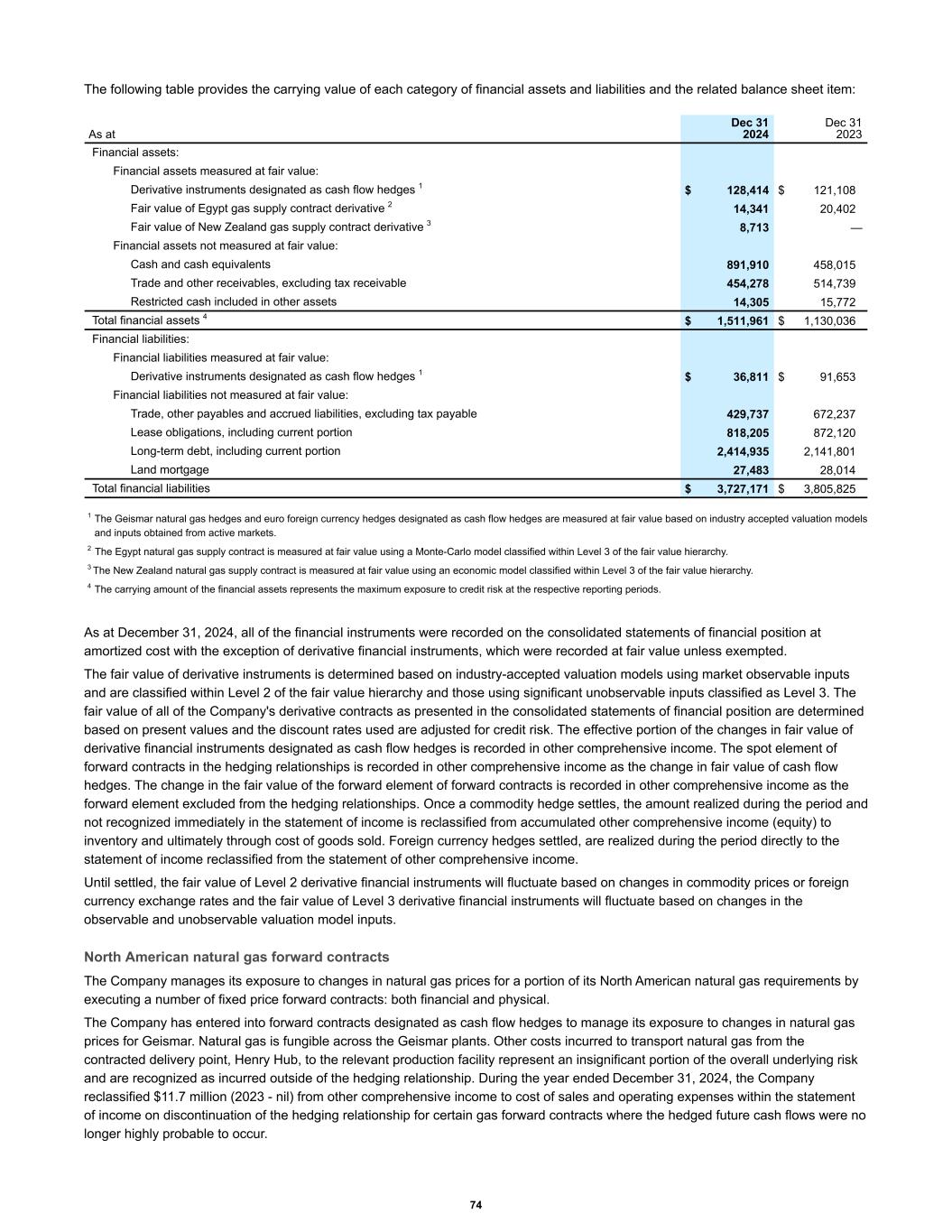 The following table provides the carrying value of each category of financial assets and liabilities and the related balance sheet item: Financial assets: Financial assets measured at fair value: Derivative instruments designated as cash flow hedges 1 $ 128,414 $ 121,108 Fair value of Egypt gas supply contract derivative 2 14,341 20,402 Fair value of New Zealand gas supply contract derivative 3 8,713 — Financial assets not measured at fair value: Cash and cash equivalents 891,910 458,015 Trade and other receivables, excluding tax receivable 454,278 514,739 Restricted cash included in other assets 14,305 15,772 Total financial assets 4 $ 1,511,961 $ 1,130,036 Financial liabilities: Financial liabilities measured at fair value: Derivative instruments designated as cash flow hedges 1 $ 36,811 $ 91,653 Financial liabilities not measured at fair value: Trade, other payables and accrued liabilities, excluding tax payable 429,737 672,237 Lease obligations, including current portion 818,205 872,120 Long-term debt, including current portion 2,414,935 2,141,801 Land mortgage 27,483 28,014 Total financial liabilities $ 3,727,171 $ 3,805,825 As at Dec 31 2024 Dec 31 2023 1 The Geismar natural gas hedges and euro foreign currency hedges designated as cash flow hedges are measured at fair value based on industry accepted valuation models and inputs obtained from active markets. 2 The Egypt natural gas supply contract is measured at fair value using a Monte-Carlo model classified within Level 3 of the fair value hierarchy. 3 The New Zealand natural gas supply contract is measured at fair value using an economic model classified within Level 3 of the fair value hierarchy. 4 The carrying amount of the financial assets represents the maximum exposure to credit risk at the respective reporting periods. As at December 31, 2024, all of the financial instruments were recorded on the consolidated statements of financial position at amortized cost with the exception of derivative financial instruments, which were recorded at fair value unless exempted. The fair value of derivative instruments is determined based on industry-accepted valuation models using market observable inputs and are classified within Level 2 of the fair value hierarchy and those using significant unobservable inputs classified as Level 3. The fair value of all of the Company's derivative contracts as presented in the consolidated statements of financial position are determined based on present values and the discount rates used are adjusted for credit risk. The effective portion of the changes in fair value of derivative financial instruments designated as cash flow hedges is recorded in other comprehensive income. The spot element of forward contracts in the hedging relationships is recorded in other comprehensive income as the change in fair value of cash flow hedges. The change in the fair value of the forward element of forward contracts is recorded in other comprehensive income as the forward element excluded from the hedging relationships. Once a commodity hedge settles, the amount realized during the period and not recognized immediately in the statement of income is reclassified from accumulated other comprehensive income (equity) to inventory and ultimately through cost of goods sold. Foreign currency hedges settled, are realized during the period directly to the statement of income reclassified from the statement of other comprehensive income. Until settled, the fair value of Level 2 derivative financial instruments will fluctuate based on changes in commodity prices or foreign currency exchange rates and the fair value of Level 3 derivative financial instruments will fluctuate based on changes in the observable and unobservable valuation model inputs. North American natural gas forward contracts The Company manages its exposure to changes in natural gas prices for a portion of its North American natural gas requirements by executing a number of fixed price forward contracts: both financial and physical. The Company has entered into forward contracts designated as cash flow hedges to manage its exposure to changes in natural gas prices for Geismar. Natural gas is fungible across the Geismar plants. Other costs incurred to transport natural gas from the contracted delivery point, Henry Hub, to the relevant production facility represent an insignificant portion of the overall underlying risk and are recognized as incurred outside of the hedging relationship. During the year ended December 31, 2024, the Company reclassified $11.7 million (2023 - nil) from other comprehensive income to cost of sales and operating expenses within the statement of income on discontinuation of the hedging relationship for certain gas forward contracts where the hedged future cash flows were no longer highly probable to occur. 74