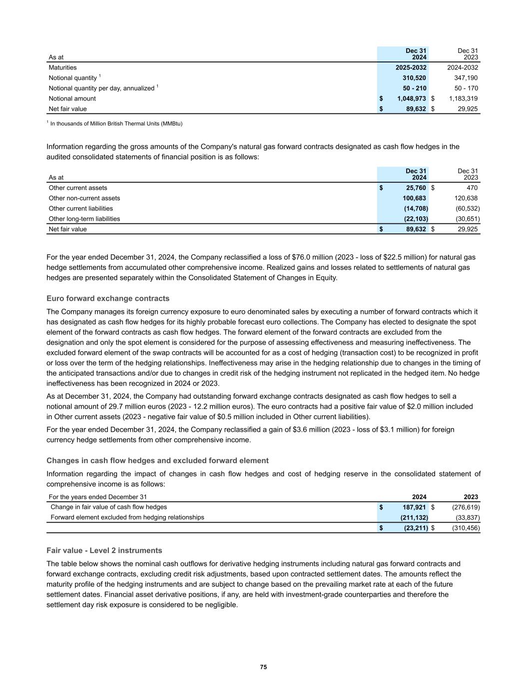 As at Dec 31 2024 Dec 31 2023 Maturities 2025-2032 2024-2032 Notional quantity 1 310,520 347,190 Notional quantity per day, annualized 1 50 - 210 50 - 170 Notional amount $ 1,048,973 $ 1,183,319 Net fair value $ 89,632 $ 29,925 1 In thousands of Million British Thermal Units (MMBtu) Information regarding the gross amounts of the Company's natural gas forward contracts designated as cash flow hedges in the audited consolidated statements of financial position is as follows: As at Dec 31 2024 Dec 31 2023 Other current assets $ 25,760 $ 470 Other non-current assets 100,683 120,638 Other current liabilities (14,708) (60,532) Other long-term liabilities (22,103) (30,651) Net fair value $ 89,632 $ 29,925 For the year ended December 31, 2024, the Company reclassified a loss of $76.0 million (2023 - loss of $22.5 million) for natural gas hedge settlements from accumulated other comprehensive income. Realized gains and losses related to settlements of natural gas hedges are presented separately within the Consolidated Statement of Changes in Equity. Euro forward exchange contracts The Company manages its foreign currency exposure to euro denominated sales by executing a number of forward contracts which it has designated as cash flow hedges for its highly probable forecast euro collections. The Company has elected to designate the spot element of the forward contracts as cash flow hedges. The forward element of the forward contracts are excluded from the designation and only the spot element is considered for the purpose of assessing effectiveness and measuring ineffectiveness. The excluded forward element of the swap contracts will be accounted for as a cost of hedging (transaction cost) to be recognized in profit or loss over the term of the hedging relationships. Ineffectiveness may arise in the hedging relationship due to changes in the timing of the anticipated transactions and/or due to changes in credit risk of the hedging instrument not replicated in the hedged item. No hedge ineffectiveness has been recognized in 2024 or 2023. As at December 31, 2024, the Company had outstanding forward exchange contracts designated as cash flow hedges to sell a notional amount of 29.7 million euros (2023 - 12.2 million euros). The euro contracts had a positive fair value of $2.0 million included in Other current assets (2023 - negative fair value of $0.5 million included in Other current liabilities). For the year ended December 31, 2024, the Company reclassified a gain of $3.6 million (2023 - loss of $3.1 million) for foreign currency hedge settlements from other comprehensive income. Changes in cash flow hedges and excluded forward element Information regarding the impact of changes in cash flow hedges and cost of hedging reserve in the consolidated statement of comprehensive income is as follows: Change in fair value of cash flow hedges $ 187,921 $ (276,619) Forward element excluded from hedging relationships (211,132) (33,837) $ (23,211) $ (310,456) For the years ended December 31 2024 2023 Fair value - Level 2 instruments The table below shows the nominal cash outflows for derivative hedging instruments including natural gas forward contracts and forward exchange contracts, excluding credit risk adjustments, based upon contracted settlement dates. The amounts reflect the maturity profile of the hedging instruments and are subject to change based on the prevailing market rate at each of the future settlement dates. Financial asset derivative positions, if any, are held with investment-grade counterparties and therefore the settlement day risk exposure is considered to be negligible. 75