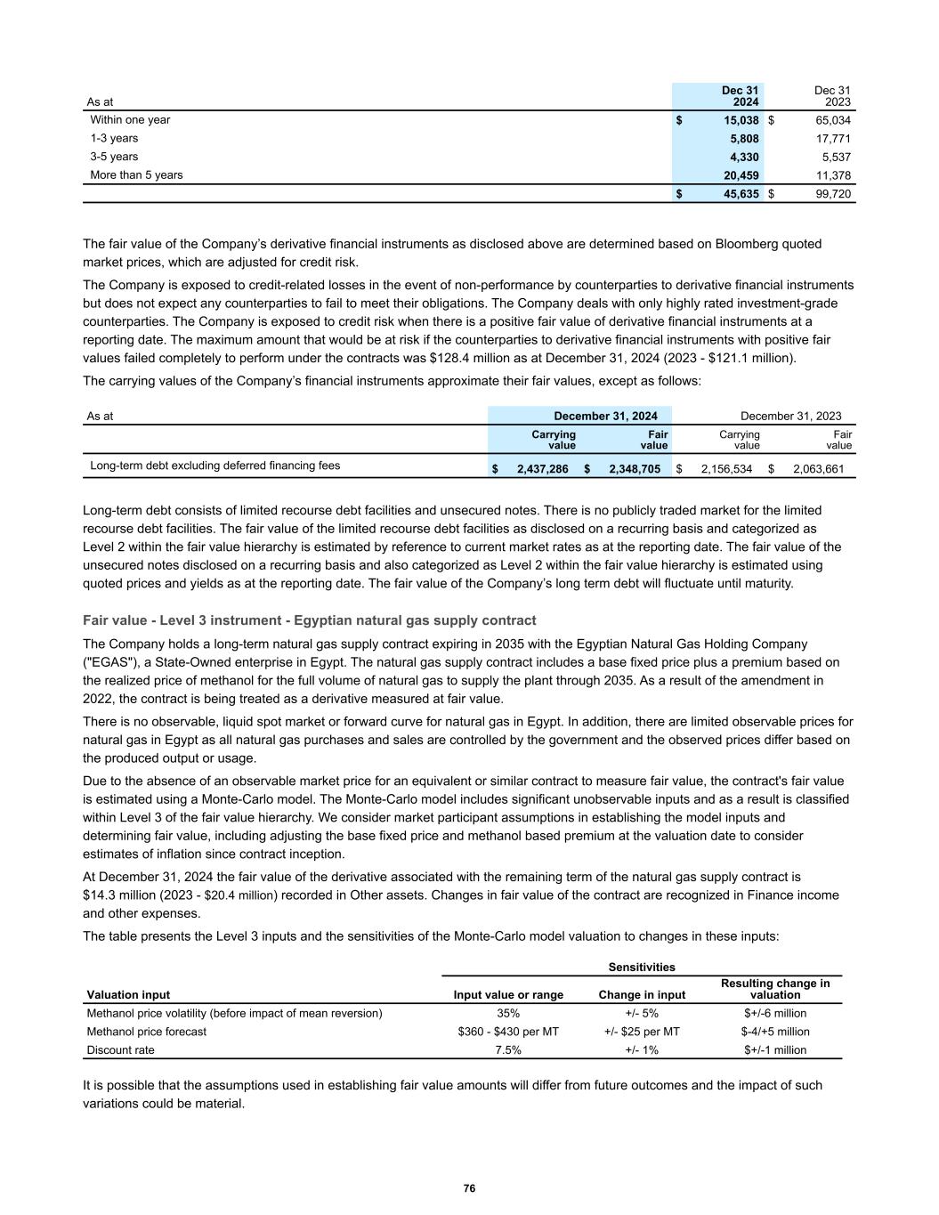 Within one year $ 15,038 $ 65,034 1-3 years 5,808 17,771 3-5 years 4,330 5,537 More than 5 years 20,459 11,378 $ 45,635 $ 99,720 As at Dec 31 2024 Dec 31 2023 The fair value of the Company’s derivative financial instruments as disclosed above are determined based on Bloomberg quoted market prices, which are adjusted for credit risk. The Company is exposed to credit-related losses in the event of non-performance by counterparties to derivative financial instruments but does not expect any counterparties to fail to meet their obligations. The Company deals with only highly rated investment-grade counterparties. The Company is exposed to credit risk when there is a positive fair value of derivative financial instruments at a reporting date. The maximum amount that would be at risk if the counterparties to derivative financial instruments with positive fair values failed completely to perform under the contracts was $128.4 million as at December 31, 2024 (2023 - $121.1 million). The carrying values of the Company’s financial instruments approximate their fair values, except as follows: Carrying value Fair value Carrying value Fair value Long-term debt excluding deferred financing fees $ 2,437,286 $ 2,348,705 $ 2,156,534 $ 2,063,661 As at December 31, 2024 December 31, 2023 Long-term debt consists of limited recourse debt facilities and unsecured notes. There is no publicly traded market for the limited recourse debt facilities. The fair value of the limited recourse debt facilities as disclosed on a recurring basis and categorized as Level 2 within the fair value hierarchy is estimated by reference to current market rates as at the reporting date. The fair value of the unsecured notes disclosed on a recurring basis and also categorized as Level 2 within the fair value hierarchy is estimated using quoted prices and yields as at the reporting date. The fair value of the Company’s long term debt will fluctuate until maturity. Fair value - Level 3 instrument - Egyptian natural gas supply contract The Company holds a long-term natural gas supply contract expiring in 2035 with the Egyptian Natural Gas Holding Company ("EGAS"), a State-Owned enterprise in Egypt. The natural gas supply contract includes a base fixed price plus a premium based on the realized price of methanol for the full volume of natural gas to supply the plant through 2035. As a result of the amendment in 2022, the contract is being treated as a derivative measured at fair value. There is no observable, liquid spot market or forward curve for natural gas in Egypt. In addition, there are limited observable prices for natural gas in Egypt as all natural gas purchases and sales are controlled by the government and the observed prices differ based on the produced output or usage. Due to the absence of an observable market price for an equivalent or similar contract to measure fair value, the contract's fair value is estimated using a Monte-Carlo model. The Monte-Carlo model includes significant unobservable inputs and as a result is classified within Level 3 of the fair value hierarchy. We consider market participant assumptions in establishing the model inputs and determining fair value, including adjusting the base fixed price and methanol based premium at the valuation date to consider estimates of inflation since contract inception. At December 31, 2024 the fair value of the derivative associated with the remaining term of the natural gas supply contract is $14.3 million (2023 - $20.4 million) recorded in Other assets. Changes in fair value of the contract are recognized in Finance income and other expenses. The table presents the Level 3 inputs and the sensitivities of the Monte-Carlo model valuation to changes in these inputs: Sensitivities Valuation input Input value or range Change in input Resulting change in valuation Methanol price volatility (before impact of mean reversion) 35% +/- 5% $+/-6 million Methanol price forecast $360 - $430 per MT +/- $25 per MT $-4/+5 million Discount rate 7.5% +/- 1% $+/-1 million It is possible that the assumptions used in establishing fair value amounts will differ from future outcomes and the impact of such variations could be material. 76