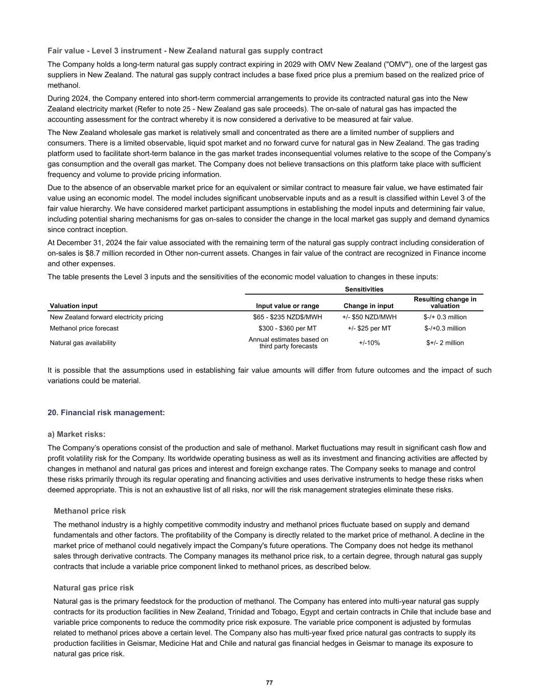 Fair value - Level 3 instrument - New Zealand natural gas supply contract The Company holds a long-term natural gas supply contract expiring in 2029 with OMV New Zealand ("OMV"), one of the largest gas suppliers in New Zealand. The natural gas supply contract includes a base fixed price plus a premium based on the realized price of methanol. During 2024, the Company entered into short-term commercial arrangements to provide its contracted natural gas into the New Zealand electricity market (Refer to note 25 - New Zealand gas sale proceeds). The on-sale of natural gas has impacted the accounting assessment for the contract whereby it is now considered a derivative to be measured at fair value. The New Zealand wholesale gas market is relatively small and concentrated as there are a limited number of suppliers and consumers. There is a limited observable, liquid spot market and no forward curve for natural gas in New Zealand. The gas trading platform used to facilitate short-term balance in the gas market trades inconsequential volumes relative to the scope of the Company’s gas consumption and the overall gas market. The Company does not believe transactions on this platform take place with sufficient frequency and volume to provide pricing information. Due to the absence of an observable market price for an equivalent or similar contract to measure fair value, we have estimated fair value using an economic model. The model includes significant unobservable inputs and as a result is classified within Level 3 of the fair value hierarchy. We have considered market participant assumptions in establishing the model inputs and determining fair value, including potential sharing mechanisms for gas on-sales to consider the change in the local market gas supply and demand dynamics since contract inception. At December 31, 2024 the fair value associated with the remaining term of the natural gas supply contract including consideration of on-sales is $8.7 million recorded in Other non-current assets. Changes in fair value of the contract are recognized in Finance income and other expenses. The table presents the Level 3 inputs and the sensitivities of the economic model valuation to changes in these inputs: Sensitivities Valuation input Input value or range Change in input Resulting change in valuation New Zealand forward electricity pricing $65 - $235 NZD$/MWH +/- $50 NZD/MWH $-/+ 0.3 million Methanol price forecast $300 - $360 per MT +/- $25 per MT $-/+0.3 million Natural gas availability Annual estimates based on third party forecasts +/-10% $+/- 2 million It is possible that the assumptions used in establishing fair value amounts will differ from future outcomes and the impact of such variations could be material. 20. Financial risk management: a) Market risks: The Company’s operations consist of the production and sale of methanol. Market fluctuations may result in significant cash flow and profit volatility risk for the Company. Its worldwide operating business as well as its investment and financing activities are affected by changes in methanol and natural gas prices and interest and foreign exchange rates. The Company seeks to manage and control these risks primarily through its regular operating and financing activities and uses derivative instruments to hedge these risks when deemed appropriate. This is not an exhaustive list of all risks, nor will the risk management strategies eliminate these risks. Methanol price risk The methanol industry is a highly competitive commodity industry and methanol prices fluctuate based on supply and demand fundamentals and other factors. The profitability of the Company is directly related to the market price of methanol. A decline in the market price of methanol could negatively impact the Company's future operations. The Company does not hedge its methanol sales through derivative contracts. The Company manages its methanol price risk, to a certain degree, through natural gas supply contracts that include a variable price component linked to methanol prices, as described below. Natural gas price risk Natural gas is the primary feedstock for the production of methanol. The Company has entered into multi-year natural gas supply contracts for its production facilities in New Zealand, Trinidad and Tobago, Egypt and certain contracts in Chile that include base and variable price components to reduce the commodity price risk exposure. The variable price component is adjusted by formulas related to methanol prices above a certain level. The Company also has multi-year fixed price natural gas contracts to supply its production facilities in Geismar, Medicine Hat and Chile and natural gas financial hedges in Geismar to manage its exposure to natural gas price risk. 77