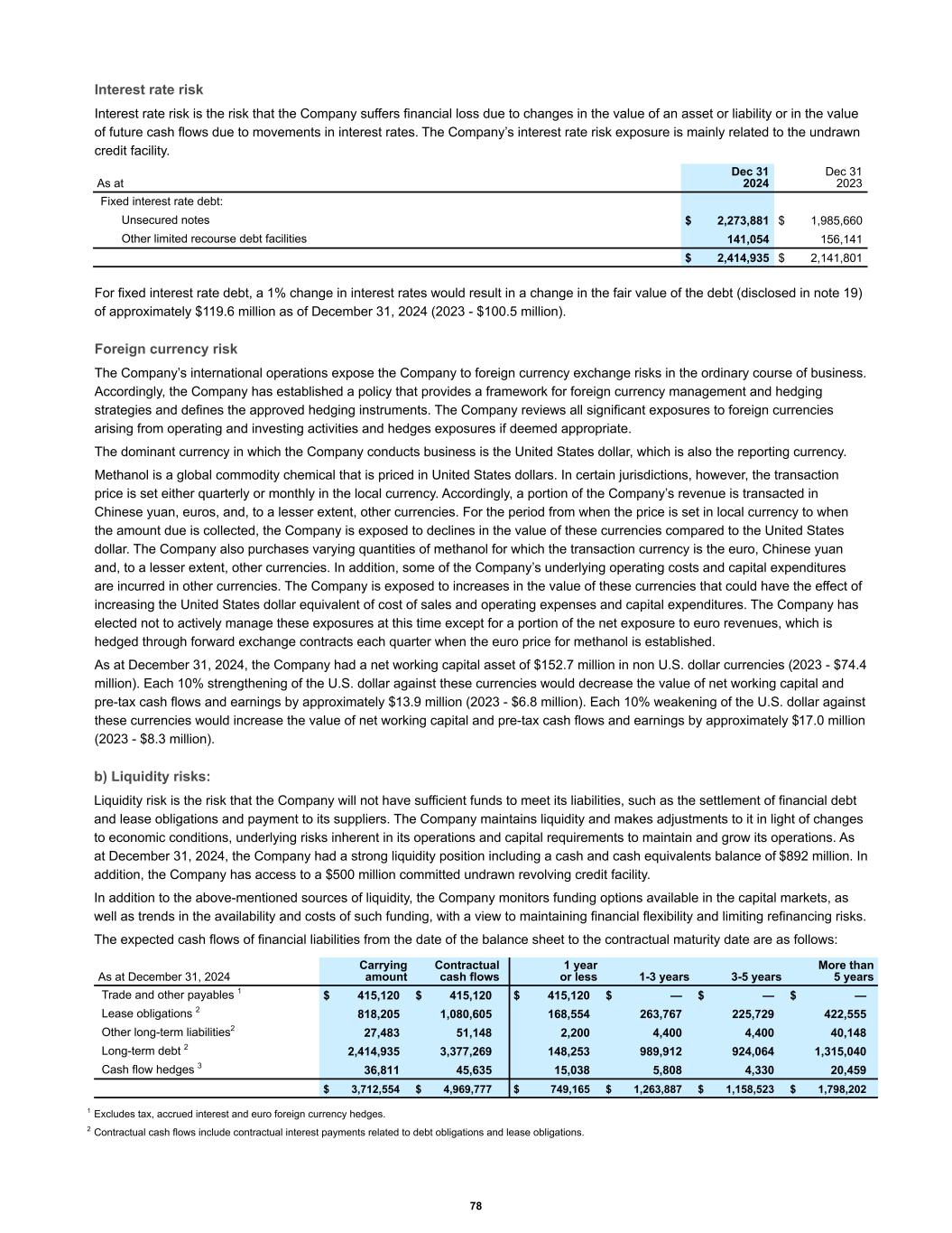 Interest rate risk Interest rate risk is the risk that the Company suffers financial loss due to changes in the value of an asset or liability or in the value of future cash flows due to movements in interest rates. The Company’s interest rate risk exposure is mainly related to the undrawn credit facility. Fixed interest rate debt: Unsecured notes $ 2,273,881 $ 1,985,660 Other limited recourse debt facilities 141,054 156,141 $ 2,414,935 $ 2,141,801 As at Dec 31 2024 Dec 31 2023 For fixed interest rate debt, a 1% change in interest rates would result in a change in the fair value of the debt (disclosed in note 19) of approximately $119.6 million as of December 31, 2024 (2023 - $100.5 million). Foreign currency risk The Company’s international operations expose the Company to foreign currency exchange risks in the ordinary course of business. Accordingly, the Company has established a policy that provides a framework for foreign currency management and hedging strategies and defines the approved hedging instruments. The Company reviews all significant exposures to foreign currencies arising from operating and investing activities and hedges exposures if deemed appropriate. The dominant currency in which the Company conducts business is the United States dollar, which is also the reporting currency. Methanol is a global commodity chemical that is priced in United States dollars. In certain jurisdictions, however, the transaction price is set either quarterly or monthly in the local currency. Accordingly, a portion of the Company’s revenue is transacted in Chinese yuan, euros, and, to a lesser extent, other currencies. For the period from when the price is set in local currency to when the amount due is collected, the Company is exposed to declines in the value of these currencies compared to the United States dollar. The Company also purchases varying quantities of methanol for which the transaction currency is the euro, Chinese yuan and, to a lesser extent, other currencies. In addition, some of the Company’s underlying operating costs and capital expenditures are incurred in other currencies. The Company is exposed to increases in the value of these currencies that could have the effect of increasing the United States dollar equivalent of cost of sales and operating expenses and capital expenditures. The Company has elected not to actively manage these exposures at this time except for a portion of the net exposure to euro revenues, which is hedged through forward exchange contracts each quarter when the euro price for methanol is established. As at December 31, 2024, the Company had a net working capital asset of $152.7 million in non U.S. dollar currencies (2023 - $74.4 million). Each 10% strengthening of the U.S. dollar against these currencies would decrease the value of net working capital and pre-tax cash flows and earnings by approximately $13.9 million (2023 - $6.8 million). Each 10% weakening of the U.S. dollar against these currencies would increase the value of net working capital and pre-tax cash flows and earnings by approximately $17.0 million (2023 - $8.3 million). b) Liquidity risks: Liquidity risk is the risk that the Company will not have sufficient funds to meet its liabilities, such as the settlement of financial debt and lease obligations and payment to its suppliers. The Company maintains liquidity and makes adjustments to it in light of changes to economic conditions, underlying risks inherent in its operations and capital requirements to maintain and grow its operations. As at December 31, 2024, the Company had a strong liquidity position including a cash and cash equivalents balance of $892 million. In addition, the Company has access to a $500 million committed undrawn revolving credit facility. In addition to the above-mentioned sources of liquidity, the Company monitors funding options available in the capital markets, as well as trends in the availability and costs of such funding, with a view to maintaining financial flexibility and limiting refinancing risks. The expected cash flows of financial liabilities from the date of the balance sheet to the contractual maturity date are as follows: Trade and other payables 1 $ 415,120 $ 415,120 $ 415,120 $ — $ — $ — Lease obligations 2 818,205 1,080,605 168,554 263,767 225,729 422,555 Other long-term liabilities2 27,483 51,148 2,200 4,400 4,400 40,148 Long-term debt 2 2,414,935 3,377,269 148,253 989,912 924,064 1,315,040 Cash flow hedges 3 36,811 45,635 15,038 5,808 4,330 20,459 $ 3,712,554 $ 4,969,777 $ 749,165 $ 1,263,887 $ 1,158,523 $ 1,798,202 As at December 31, 2024 Carrying amount Contractual cash flows 1 year or less 1-3 years 3-5 years More than 5 years 1 Excludes tax, accrued interest and euro foreign currency hedges. 2 Contractual cash flows include contractual interest payments related to debt obligations and lease obligations. 78