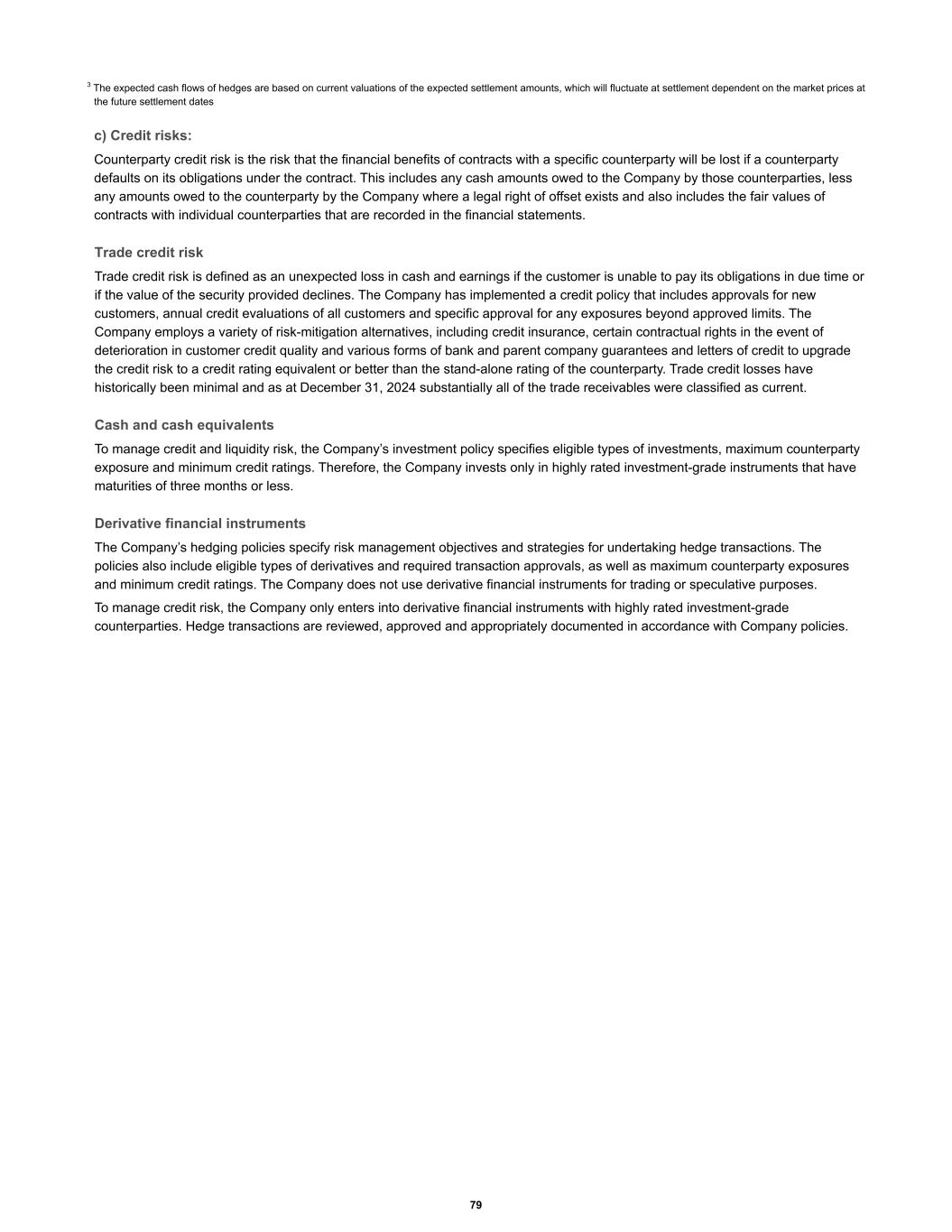 3 The expected cash flows of hedges are based on current valuations of the expected settlement amounts, which will fluctuate at settlement dependent on the market prices at the future settlement dates c) Credit risks: Counterparty credit risk is the risk that the financial benefits of contracts with a specific counterparty will be lost if a counterparty defaults on its obligations under the contract. This includes any cash amounts owed to the Company by those counterparties, less any amounts owed to the counterparty by the Company where a legal right of offset exists and also includes the fair values of contracts with individual counterparties that are recorded in the financial statements. Trade credit risk Trade credit risk is defined as an unexpected loss in cash and earnings if the customer is unable to pay its obligations in due time or if the value of the security provided declines. The Company has implemented a credit policy that includes approvals for new customers, annual credit evaluations of all customers and specific approval for any exposures beyond approved limits. The Company employs a variety of risk-mitigation alternatives, including credit insurance, certain contractual rights in the event of deterioration in customer credit quality and various forms of bank and parent company guarantees and letters of credit to upgrade the credit risk to a credit rating equivalent or better than the stand-alone rating of the counterparty. Trade credit losses have historically been minimal and as at December 31, 2024 substantially all of the trade receivables were classified as current. Cash and cash equivalents To manage credit and liquidity risk, the Company’s investment policy specifies eligible types of investments, maximum counterparty exposure and minimum credit ratings. Therefore, the Company invests only in highly rated investment-grade instruments that have maturities of three months or less. Derivative financial instruments The Company’s hedging policies specify risk management objectives and strategies for undertaking hedge transactions. The policies also include eligible types of derivatives and required transaction approvals, as well as maximum counterparty exposures and minimum credit ratings. The Company does not use derivative financial instruments for trading or speculative purposes. To manage credit risk, the Company only enters into derivative financial instruments with highly rated investment-grade counterparties. Hedge transactions are reviewed, approved and appropriately documented in accordance with Company policies. 79
