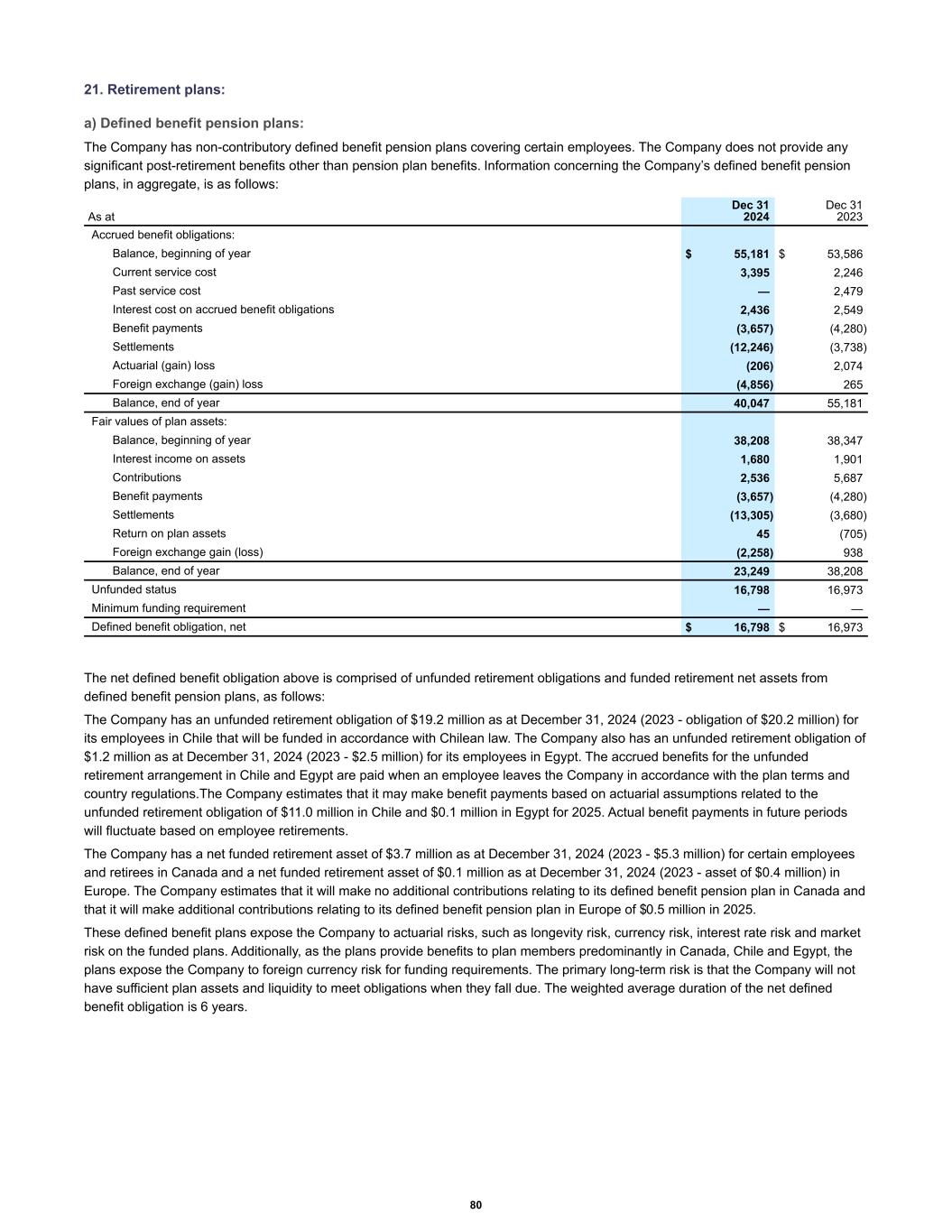 21. Retirement plans: a) Defined benefit pension plans: The Company has non-contributory defined benefit pension plans covering certain employees. The Company does not provide any significant post-retirement benefits other than pension plan benefits. Information concerning the Company’s defined benefit pension plans, in aggregate, is as follows: Accrued benefit obligations: Balance, beginning of year $ 55,181 $ 53,586 Current service cost 3,395 2,246 Past service cost — 2,479 Interest cost on accrued benefit obligations 2,436 2,549 Benefit payments (3,657) (4,280) Settlements (12,246) (3,738) Actuarial (gain) loss (206) 2,074 Foreign exchange (gain) loss (4,856) 265 Balance, end of year 40,047 55,181 Fair values of plan assets: Balance, beginning of year 38,208 38,347 Interest income on assets 1,680 1,901 Contributions 2,536 5,687 Benefit payments (3,657) (4,280) Settlements (13,305) (3,680) Return on plan assets 45 (705) Foreign exchange gain (loss) (2,258) 938 Balance, end of year 23,249 38,208 Unfunded status 16,798 16,973 Minimum funding requirement — — Defined benefit obligation, net $ 16,798 $ 16,973 As at Dec 31 2024 Dec 31 2023 The net defined benefit obligation above is comprised of unfunded retirement obligations and funded retirement net assets from defined benefit pension plans, as follows: The Company has an unfunded retirement obligation of $19.2 million as at December 31, 2024 (2023 - obligation of $20.2 million) for its employees in Chile that will be funded in accordance with Chilean law. The Company also has an unfunded retirement obligation of $1.2 million as at December 31, 2024 (2023 - $2.5 million) for its employees in Egypt. The accrued benefits for the unfunded retirement arrangement in Chile and Egypt are paid when an employee leaves the Company in accordance with the plan terms and country regulations.The Company estimates that it may make benefit payments based on actuarial assumptions related to the unfunded retirement obligation of $11.0 million in Chile and $0.1 million in Egypt for 2025. Actual benefit payments in future periods will fluctuate based on employee retirements. The Company has a net funded retirement asset of $3.7 million as at December 31, 2024 (2023 - $5.3 million) for certain employees and retirees in Canada and a net funded retirement asset of $0.1 million as at December 31, 2024 (2023 - asset of $0.4 million) in Europe. The Company estimates that it will make no additional contributions relating to its defined benefit pension plan in Canada and that it will make additional contributions relating to its defined benefit pension plan in Europe of $0.5 million in 2025. These defined benefit plans expose the Company to actuarial risks, such as longevity risk, currency risk, interest rate risk and market risk on the funded plans. Additionally, as the plans provide benefits to plan members predominantly in Canada, Chile and Egypt, the plans expose the Company to foreign currency risk for funding requirements. The primary long-term risk is that the Company will not have sufficient plan assets and liquidity to meet obligations when they fall due. The weighted average duration of the net defined benefit obligation is 6 years. 80