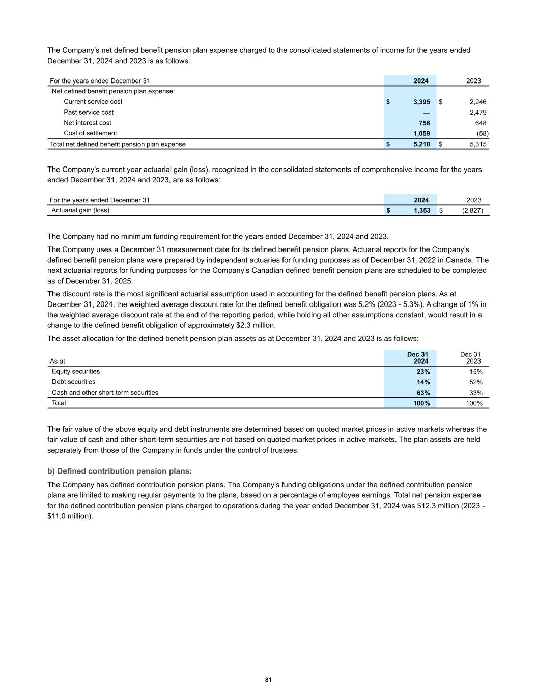 The Company’s net defined benefit pension plan expense charged to the consolidated statements of income for the years ended December 31, 2024 and 2023 is as follows: Net defined benefit pension plan expense: Current service cost $ 3,395 $ 2,246 Past service cost — 2,479 Net interest cost 756 648 Cost of settlement 1,059 (58) Total net defined benefit pension plan expense $ 5,210 $ 5,315 For the years ended December 31 2024 2023 The Company’s current year actuarial gain (loss), recognized in the consolidated statements of comprehensive income for the years ended December 31, 2024 and 2023, are as follows: For the years ended December 31 2024 2023 Actuarial gain (loss) $ 1,353 $ (2,827) The Company had no minimum funding requirement for the years ended December 31, 2024 and 2023. The Company uses a December 31 measurement date for its defined benefit pension plans. Actuarial reports for the Company’s defined benefit pension plans were prepared by independent actuaries for funding purposes as of December 31, 2022 in Canada. The next actuarial reports for funding purposes for the Company’s Canadian defined benefit pension plans are scheduled to be completed as of December 31, 2025. The discount rate is the most significant actuarial assumption used in accounting for the defined benefit pension plans. As at December 31, 2024, the weighted average discount rate for the defined benefit obligation was 5.2% (2023 - 5.3%). A change of 1% in the weighted average discount rate at the end of the reporting period, while holding all other assumptions constant, would result in a change to the defined benefit obligation of approximately $2.3 million. The asset allocation for the defined benefit pension plan assets as at December 31, 2024 and 2023 is as follows: Equity securities 23 % 15 % Debt securities 14 % 52 % Cash and other short-term securities 63 % 33 % Total 100 % 100 % As at Dec 31 2024 Dec 31 2023 The fair value of the above equity and debt instruments are determined based on quoted market prices in active markets whereas the fair value of cash and other short-term securities are not based on quoted market prices in active markets. The plan assets are held separately from those of the Company in funds under the control of trustees. b) Defined contribution pension plans: The Company has defined contribution pension plans. The Company’s funding obligations under the defined contribution pension plans are limited to making regular payments to the plans, based on a percentage of employee earnings. Total net pension expense for the defined contribution pension plans charged to operations during the year ended December 31, 2024 was $12.3 million (2023 - $11.0 million). 81