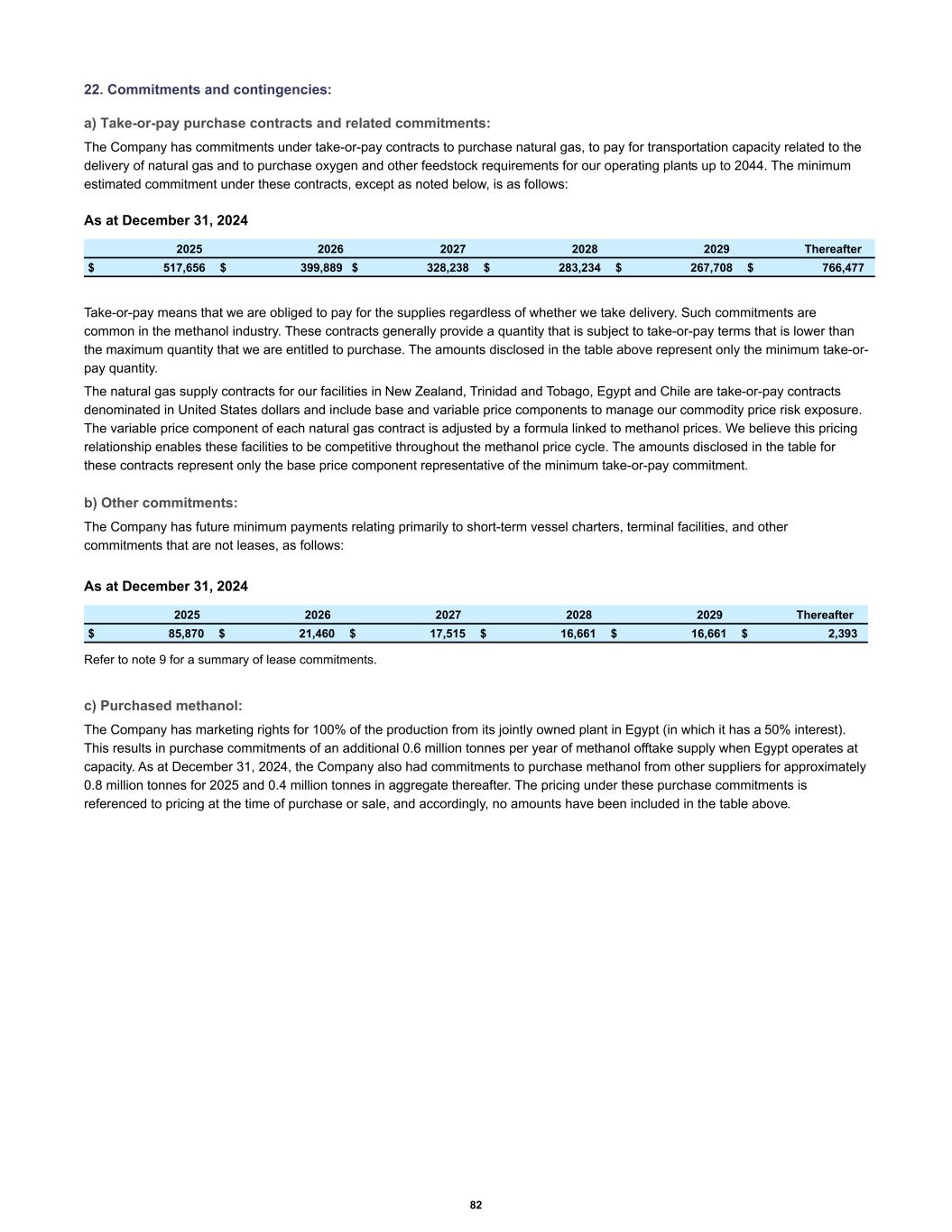 22. Commitments and contingencies: a) Take-or-pay purchase contracts and related commitments: The Company has commitments under take-or-pay contracts to purchase natural gas, to pay for transportation capacity related to the delivery of natural gas and to purchase oxygen and other feedstock requirements for our operating plants up to 2044. The minimum estimated commitment under these contracts, except as noted below, is as follows: As at December 31, 2024 2025 2026 2027 2028 2029 Thereafter $ 517,656 $ 399,889 $ 328,238 $ 283,234 $ 267,708 $ 766,477 Take-or-pay means that we are obliged to pay for the supplies regardless of whether we take delivery. Such commitments are common in the methanol industry. These contracts generally provide a quantity that is subject to take-or-pay terms that is lower than the maximum quantity that we are entitled to purchase. The amounts disclosed in the table above represent only the minimum take-or- pay quantity. The natural gas supply contracts for our facilities in New Zealand, Trinidad and Tobago, Egypt and Chile are take-or-pay contracts denominated in United States dollars and include base and variable price components to manage our commodity price risk exposure. The variable price component of each natural gas contract is adjusted by a formula linked to methanol prices. We believe this pricing relationship enables these facilities to be competitive throughout the methanol price cycle. The amounts disclosed in the table for these contracts represent only the base price component representative of the minimum take-or-pay commitment. b) Other commitments: The Company has future minimum payments relating primarily to short-term vessel charters, terminal facilities, and other commitments that are not leases, as follows: As at December 31, 2024 2025 2026 2027 2028 2029 Thereafter $ 85,870 $ 21,460 $ 17,515 $ 16,661 $ 16,661 $ 2,393 Refer to note 9 for a summary of lease commitments. c) Purchased methanol: The Company has marketing rights for 100% of the production from its jointly owned plant in Egypt (in which it has a 50% interest). This results in purchase commitments of an additional 0.6 million tonnes per year of methanol offtake supply when Egypt operates at capacity. As at December 31, 2024, the Company also had commitments to purchase methanol from other suppliers for approximately 0.8 million tonnes for 2025 and 0.4 million tonnes in aggregate thereafter. The pricing under these purchase commitments is referenced to pricing at the time of purchase or sale, and accordingly, no amounts have been included in the table above. 82