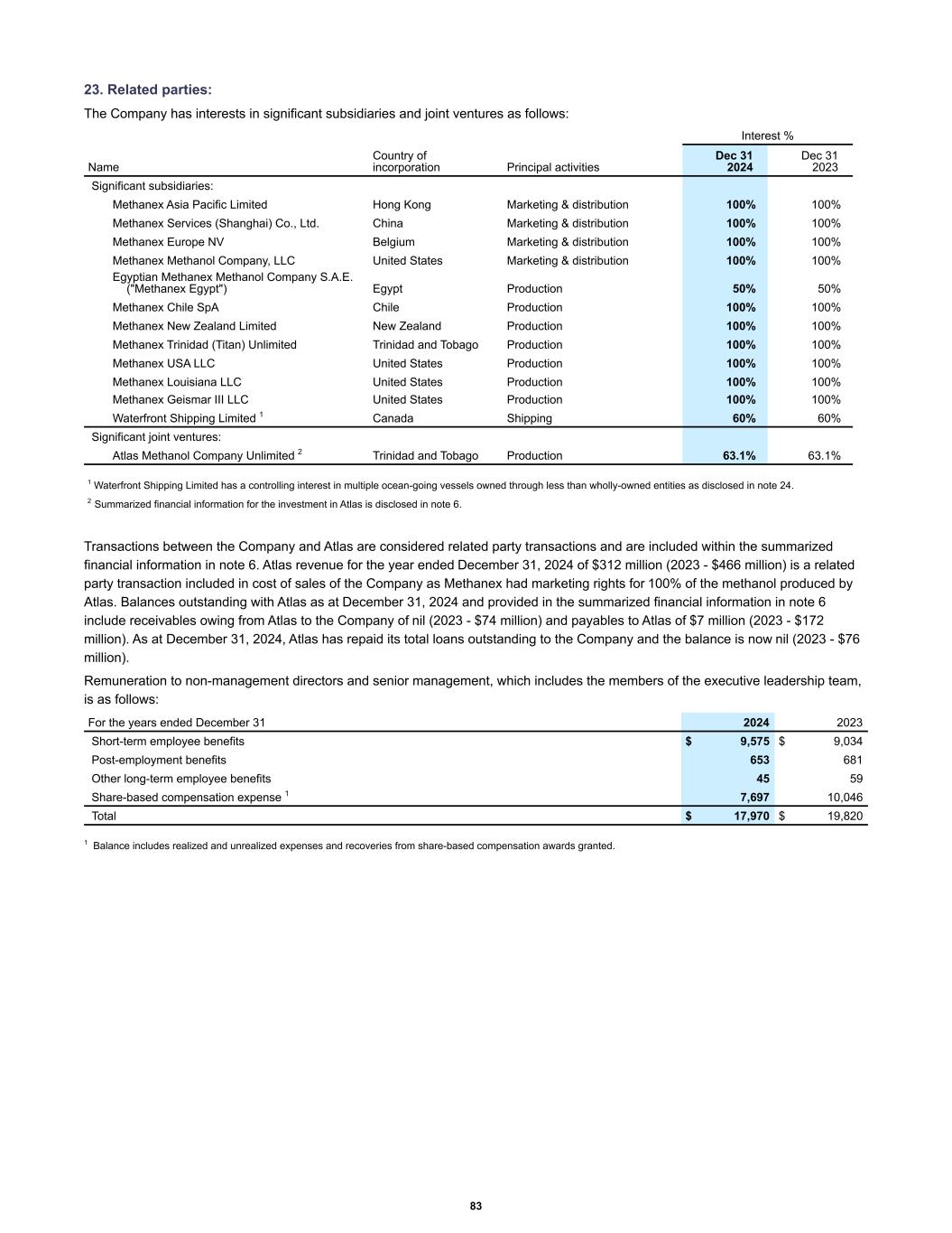 23. Related parties: The Company has interests in significant subsidiaries and joint ventures as follows: Dec 31 2024 Dec 31 2023 Significant subsidiaries: Methanex Asia Pacific Limited Hong Kong Marketing & distribution 100 % 100 % Methanex Services (Shanghai) Co., Ltd. China Marketing & distribution 100 % 100 % Methanex Europe NV Belgium Marketing & distribution 100 % 100 % Methanex Methanol Company, LLC United States Marketing & distribution 100 % 100 % Egyptian Methanex Methanol Company S.A.E. ("Methanex Egypt") Egypt Production 50 % 50 % Methanex Chile SpA Chile Production 100 % 100 % Methanex New Zealand Limited New Zealand Production 100 % 100 % Methanex Trinidad (Titan) Unlimited Trinidad and Tobago Production 100 % 100 % Methanex USA LLC United States Production 100 % 100 % Methanex Louisiana LLC United States Production 100 % 100 % Methanex Geismar III LLC United States Production 100 % 100 % Waterfront Shipping Limited 1 Canada Shipping 60 % 60 % Significant joint ventures: Atlas Methanol Company Unlimited 2 Trinidad and Tobago Production 63.1 % 63.1 % Name Country of incorporation Principal activities Interest % 1 Waterfront Shipping Limited has a controlling interest in multiple ocean-going vessels owned through less than wholly-owned entities as disclosed in note 24. 2 Summarized financial information for the investment in Atlas is disclosed in note 6. Transactions between the Company and Atlas are considered related party transactions and are included within the summarized financial information in note 6. Atlas revenue for the year ended December 31, 2024 of $312 million (2023 - $466 million) is a related party transaction included in cost of sales of the Company as Methanex had marketing rights for 100% of the methanol produced by Atlas. Balances outstanding with Atlas as at December 31, 2024 and provided in the summarized financial information in note 6 include receivables owing from Atlas to the Company of nil (2023 - $74 million) and payables to Atlas of $7 million (2023 - $172 million). As at December 31, 2024, Atlas has repaid its total loans outstanding to the Company and the balance is now nil (2023 - $76 million). Remuneration to non-management directors and senior management, which includes the members of the executive leadership team, is as follows: Short-term employee benefits $ 9,575 $ 9,034 Post-employment benefits 653 681 Other long-term employee benefits 45 59 Share-based compensation expense 1 7,697 10,046 Total $ 17,970 $ 19,820 For the years ended December 31 2024 2023 1 Balance includes realized and unrealized expenses and recoveries from share-based compensation awards granted. 83