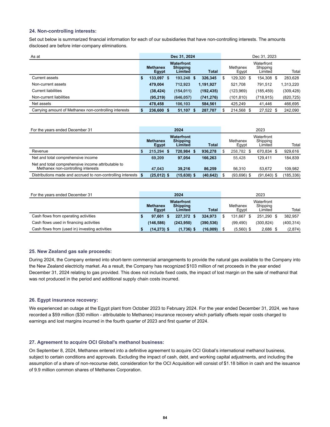 24. Non-controlling interests: Set out below is summarized financial information for each of our subsidiaries that have non-controlling interests. The amounts disclosed are before inter-company eliminations. Methanex Egypt Waterfront Shipping Limited Total Methanex Egypt Waterfront Shipping Limited Total Current assets $ 133,097 $ 193,248 $ 326,345 $ 129,320 $ 154,308 $ 283,628 Non-current assets 479,004 712,923 1,191,927 521,708 791,512 1,313,220 Current liabilities (38,424) (154,011) (192,435) (123,969) (185,459) (309,428) Non-current liabilities (95,219) (646,057) (741,276) (101,810) (718,915) (820,725) Net assets 478,458 106,103 584,561 425,249 41,446 466,695 Carrying amount of Methanex non-controlling interests $ 236,600 $ 51,107 $ 287,707 $ 214,568 $ 27,522 $ 242,090 As at Dec 31, 2024 Dec 31, 2023 Methanex Egypt Waterfront Shipping Limited Total Methanex Egypt Waterfront Shipping Limited Total Revenue $ 215,294 $ 720,984 $ 936,278 $ 258,782 $ 670,834 $ 929,616 Net and total comprehensive income 69,209 97,054 166,263 55,428 129,411 184,839 Net and total comprehensive income attributable to Methanex non-controlling interests 47,043 39,216 86,259 56,310 53,672 109,982 Distributions made and accrued to non-controlling interests $ (25,012) $ (15,630) $ (40,642) $ (93,696) $ (91,640) $ (185,336) For the years ended December 31 2024 2023 Methanex Egypt Waterfront Shipping Limited Total Methanex Egypt Waterfront Shipping Limited Total Cash flows from operating activities $ 97,601 $ 227,372 $ 324,973 $ 131,667 $ 251,290 $ 382,957 Cash flows used in financing activities (146,586) (243,950) (390,536) (99,490) (300,824) (400,314) Cash flows from (used in) investing activities $ (14,273) $ (1,736) $ (16,009) $ (5,560) $ 2,686 $ (2,874) For the years ended December 31 2024 2023 25. New Zealand gas sale proceeds: During 2024, the Company entered into short-term commercial arrangements to provide the natural gas available to the Company into the New Zealand electricity market. As a result, the Company has recognized $103 million of net proceeds in the year ended December 31, 2024 relating to gas provided. This does not include fixed costs, the impact of lost margin on the sale of methanol that was not produced in the period and additional supply chain costs incurred. 26. Egypt insurance recovery: We experienced an outage at the Egypt plant from October 2023 to February 2024. For the year ended December 31, 2024, we have recorded a $59 million ($30 million - attributable to Methanex) insurance recovery which partially offsets repair costs charged to earnings and lost margins incurred in the fourth quarter of 2023 and first quarter of 2024. 27. Agreement to acquire OCI Global's methanol business: On September 8, 2024, Methanex entered into a definitive agreement to acquire OCI Global’s international methanol business, subject to certain conditions and approvals. Excluding the impact of cash, debt, and working capital adjustments, and including the assumption of a share of non-recourse debt, consideration for the OCI Acquisition will consist of $1.18 billion in cash and the issuance of 9.9 million common shares of Methanex Corporation. 84
