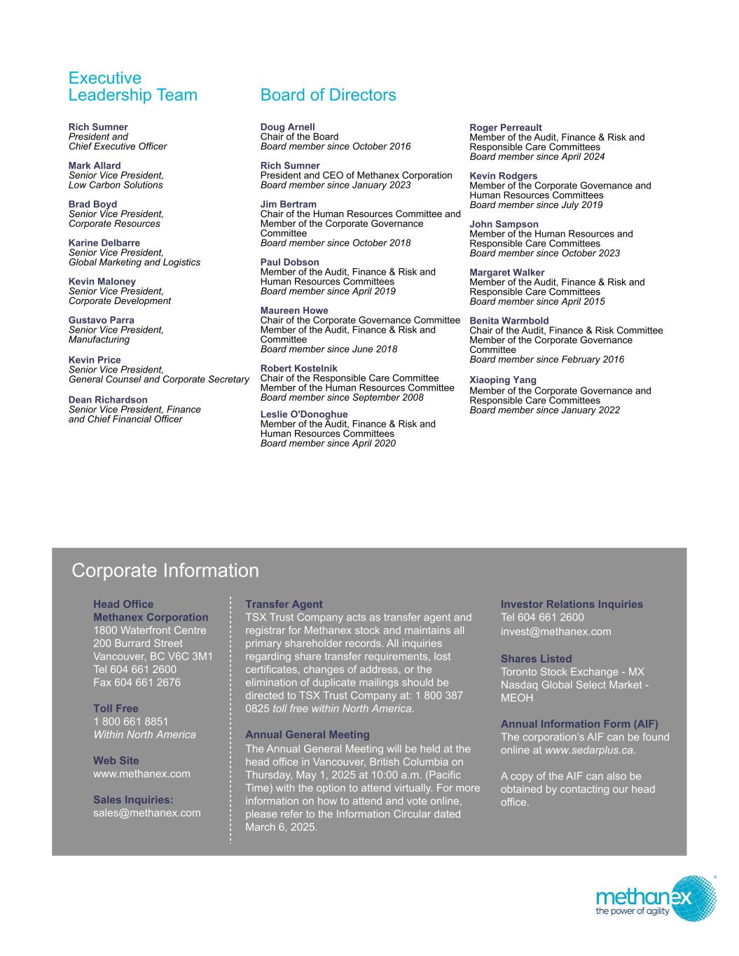 Executive Leadership Team Rich Sumner President and Chief Executive Officer Mark Allard Senior Vice President, Low Carbon Solutions Brad Boyd Senior Vice President, Corporate Resources Karine Delbarre Senior Vice President, Global Marketing and Logistics Kevin Maloney Senior Vice President, Corporate Development Gustavo Parra Senior Vice President, Manufacturing Kevin Price Senior Vice President, General Counsel and Corporate Secretary Dean Richardson Senior Vice President, Finance and Chief Financial Officer Board of Directors Doug Arnell Chair of the Board Board member since October 2016 Rich Sumner President and CEO of Methanex Corporation Board member since January 2023 Jim Bertram Chair of the Human Resources Committee and Member of the Corporate Governance Committee Board member since October 2018 Paul Dobson Member of the Audit, Finance & Risk and Human Resources Committees Board member since April 2019 Maureen Howe Chair of the Corporate Governance Committee Member of the Audit, Finance & Risk and Committee Board member since June 2018 Robert Kostelnik Chair of the Responsible Care Committee Member of the Human Resources Committee Board member since September 2008 Leslie O'Donoghue Member of the Audit, Finance & Risk and Human Resources Committees Board member since April 2020 Roger Perreault Member of the Audit, Finance & Risk and Responsible Care Committees Board member since April 2024 Kevin Rodgers Member of the Corporate Governance and Human Resources Committees Board member since July 2019 John Sampson Member of the Human Resources and Responsible Care Committees Board member since October 2023 Margaret Walker Member of the Audit, Finance & Risk and Responsible Care Committees Board member since April 2015 Benita Warmbold Chair of the Audit, Finance & Risk Committee Member of the Corporate Governance Committee Board member since February 2016 Xiaoping Yang Member of the Corporate Governance and Responsible Care Committees Board member since January 2022 Corporate Information Head Office Methanex Corporation 1800 Waterfront Centre 200 Burrard Street Vancouver, BC V6C 3M1 Tel 604 661 2600 Fax 604 661 2676 Toll Free 1 800 661 8851 Within North America Web Site www.methanex.com Sales Inquiries: sales@methanex.com Transfer Agent TSX Trust Company acts as transfer agent and registrar for Methanex stock and maintains all primary shareholder records. All inquiries regarding share transfer requirements, lost certificates, changes of address, or the elimination of duplicate mailings should be directed to TSX Trust Company at: 1 800 387 0825 toll free within North America. Annual General Meeting The Annual General Meeting will be held at the head office in Vancouver, British Columbia on Thursday, May 1, 2025 at 10:00 a.m. (Pacific Time) with the option to attend virtually. For more information on how to attend and vote online, please refer to the Information Circular dated March 6, 2025. Investor Relations Inquiries Tel 604 661 2600 invest@methanex.com Shares Listed Toronto Stock Exchange - MX Nasdaq Global Select Market - MEOH Annual Information Form (AIF) The corporation’s AIF can be found online at www.sedarplus.ca. A copy of the AIF can also be obtained by contacting our head office.