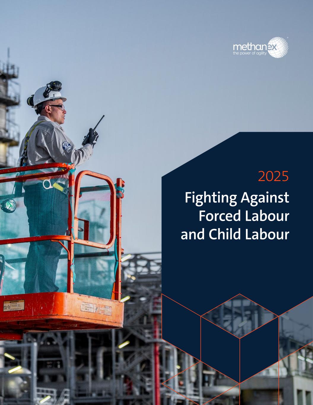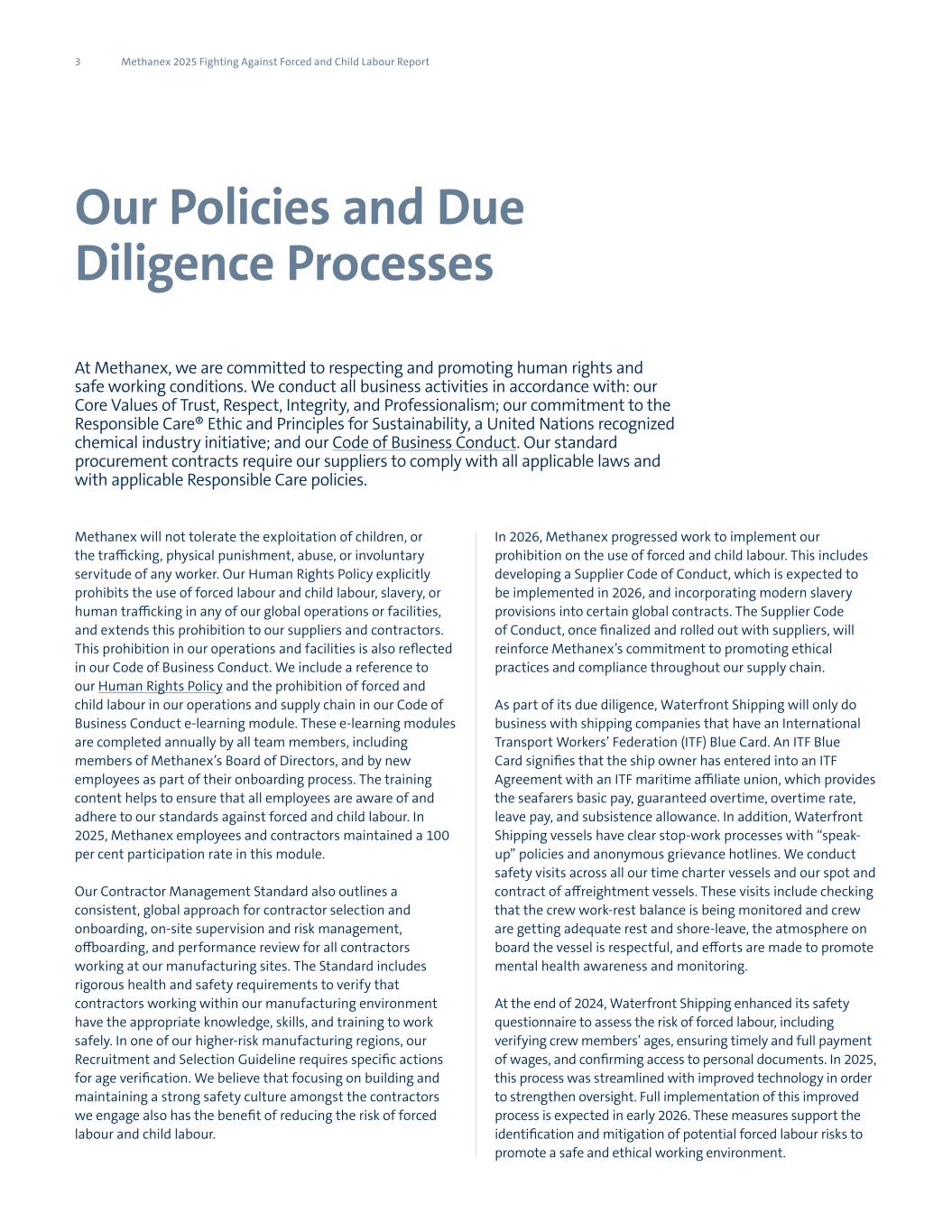 3 Methanex 2025 Fighting Against Forced and Child Labour Report Our Policies and Due Diligence Processes At Methanex, we are committed to respecting and promoting human rights and safe working conditions. We conduct all business activities in accordance with: our Core Values of Trust, Respect, Integrity, and Professionalism; our commitment to the Responsible Care® Ethic and Principles for Sustainability, a United Nations recognized chemical industry initiative; and our Code of Business Conduct. Our standard procurement contracts require our suppliers to comply with all applicable laws and with applicable Responsible Care policies. Methanex will not tolerate the exploitation of children, or the trafficking, physical punishment, abuse, or involuntary servitude of any worker. Our Human Rights Policy explicitly prohibits the use of forced labour and child labour, slavery, or human trafficking in any of our global operations or facilities, and extends this prohibition to our suppliers and contractors. This prohibition in our operations and facilities is also reflected in our Code of Business Conduct. We include a reference to our Human Rights Policy and the prohibition of forced and child labour in our operations and supply chain in our Code of Business Conduct e-learning module. These e-learning modules are completed annually by all team members, including members of Methanex’s Board of Directors, and by new employees as part of their onboarding process. The training content helps to ensure that all employees are aware of and adhere to our standards against forced and child labour. In 2025, Methanex employees and contractors maintained a 100 per cent participation rate in this module. Our Contractor Management Standard also outlines a consistent, global approach for contractor selection and onboarding, on-site supervision and risk management, offboarding, and performance review for all contractors working at our manufacturing sites. The Standard includes rigorous health and safety requirements to verify that contractors working within our manufacturing environment have the appropriate knowledge, skills, and training to work safely. In one of our higher-risk manufacturing regions, our Recruitment and Selection Guideline requires specific actions for age verification. We believe that focusing on building and maintaining a strong safety culture amongst the contractors we engage also has the benefit of reducing the risk of forced labour and child labour. In 2026, Methanex progressed work to implement our prohibition on the use of forced and child labour. This includes developing a Supplier Code of Conduct, which is expected to be implemented in 2026, and incorporating modern slavery provisions into certain global contracts. The Supplier Code of Conduct, once finalized and rolled out with suppliers, will reinforce Methanex’s commitment to promoting ethical practices and compliance throughout our supply chain. As part of its due diligence, Waterfront Shipping will only do business with shipping companies that have an International Transport Workers’ Federation (ITF) Blue Card. An ITF Blue Card signifies that the ship owner has entered into an ITF Agreement with an ITF maritime affiliate union, which provides the seafarers basic pay, guaranteed overtime, overtime rate, leave pay, and subsistence allowance. In addition, Waterfront Shipping vessels have clear stop-work processes with “speak- up” policies and anonymous grievance hotlines. We conduct safety visits across all our time charter vessels and our spot and contract of affreightment vessels. These visits include checking that the crew work-rest balance is being monitored and crew are getting adequate rest and shore-leave, the atmosphere on board the vessel is respectful, and efforts are made to promote mental health awareness and monitoring. At the end of 2024, Waterfront Shipping enhanced its safety questionnaire to assess the risk of forced labour, including verifying crew members’ ages, ensuring timely and full payment of wages, and confirming access to personal documents. In 2025, this process was streamlined with improved technology in order to strengthen oversight. Full implementation of this improved process is expected in early 2026. These measures support the identification and mitigation of potential forced labour risks to promote a safe and ethical working environment.