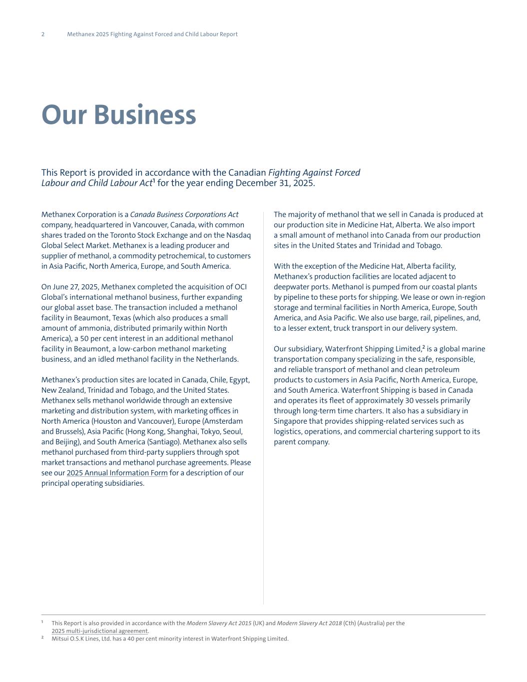 2 Methanex 2025 Fighting Against Forced and Child Labour Report Our Business This Report is provided in accordance with the Canadian Fighting Against Forced Labour and Child Labour Act¹ for the year ending December 31, 2025. Methanex Corporation is a Canada Business Corporations Act company, headquartered in Vancouver, Canada, with common shares traded on the Toronto Stock Exchange and on the Nasdaq Global Select Market. Methanex is a leading producer and supplier of methanol, a commodity petrochemical, to customers in Asia Pacific, North America, Europe, and South America. On June 27, 2025, Methanex completed the acquisition of OCI Global’s international methanol business, further expanding our global asset base. The transaction included a methanol facility in Beaumont, Texas (which also produces a small amount of ammonia, distributed primarily within North America), a 50 per cent interest in an additional methanol facility in Beaumont, a low-carbon methanol marketing business, and an idled methanol facility in the Netherlands. Methanex’s production sites are located in Canada, Chile, Egypt, New Zealand, Trinidad and Tobago, and the United States. Methanex sells methanol worldwide through an extensive marketing and distribution system, with marketing offices in North America (Houston and Vancouver), Europe (Amsterdam and Brussels), Asia Pacific (Hong Kong, Shanghai, Tokyo, Seoul, and Beijing), and South America (Santiago). Methanex also sells methanol purchased from third-party suppliers through spot market transactions and methanol purchase agreements. Please see our 2025 Annual Information Form for a description of our principal operating subsidiaries. The majority of methanol that we sell in Canada is produced at our production site in Medicine Hat, Alberta. We also import a small amount of methanol into Canada from our production sites in the United States and Trinidad and Tobago. With the exception of the Medicine Hat, Alberta facility, Methanex’s production facilities are located adjacent to deepwater ports. Methanol is pumped from our coastal plants by pipeline to these ports for shipping. We lease or own in-region storage and terminal facilities in North America, Europe, South America, and Asia Pacific. We also use barge, rail, pipelines, and, to a lesser extent, truck transport in our delivery system. Our subsidiary, Waterfront Shipping Limited,² is a global marine transportation company specializing in the safe, responsible, and reliable transport of methanol and clean petroleum products to customers in Asia Pacific, North America, Europe, and South America. Waterfront Shipping is based in Canada and operates its fleet of approximately 30 vessels primarily through long-term time charters. It also has a subsidiary in Singapore that provides shipping-related services such as logistics, operations, and commercial chartering support to its parent company. ¹  This Report is also provided in accordance with the Modern Slavery Act 2015 (UK) and Modern Slavery Act 2018 (Cth) (Australia) per the 2025 multi-jurisdictional agreement. ²  Mitsui O.S.K Lines, Ltd. has a 40 per cent minority interest in Waterfront Shipping Limited.
