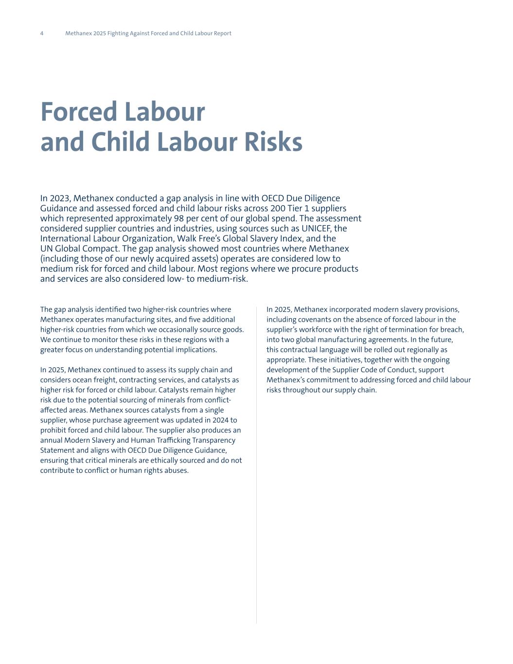 4 Methanex 2025 Fighting Against Forced and Child Labour Report Forced Labour and Child Labour Risks In 2023, Methanex conducted a gap analysis in line with OECD Due Diligence Guidance and assessed forced and child labour risks across 200 Tier 1 suppliers which represented approximately 98 per cent of our global spend. The assessment considered supplier countries and industries, using sources such as UNICEF, the International Labour Organization, Walk Free’s Global Slavery Index, and the UN Global Compact. The gap analysis showed most countries where Methanex (including those of our newly acquired assets) operates are considered low to medium risk for forced and child labour. Most regions where we procure products and services are also considered low- to medium-risk. The gap analysis identified two higher-risk countries where Methanex operates manufacturing sites, and five additional higher-risk countries from which we occasionally source goods. We continue to monitor these risks in these regions with a greater focus on understanding potential implications. In 2025, Methanex continued to assess its supply chain and considers ocean freight, contracting services, and catalysts as higher risk for forced or child labour. Catalysts remain higher risk due to the potential sourcing of minerals from conflict- affected areas. Methanex sources catalysts from a single supplier, whose purchase agreement was updated in 2024 to prohibit forced and child labour. The supplier also produces an annual Modern Slavery and Human Trafficking Transparency Statement and aligns with OECD Due Diligence Guidance, ensuring that critical minerals are ethically sourced and do not contribute to conflict or human rights abuses. In 2025, Methanex incorporated modern slavery provisions, including covenants on the absence of forced labour in the supplier’s workforce with the right of termination for breach, into two global manufacturing agreements. In the future, this contractual language will be rolled out regionally as appropriate. These initiatives, together with the ongoing development of the Supplier Code of Conduct, support Methanex’s commitment to addressing forced and child labour risks throughout our supply chain.