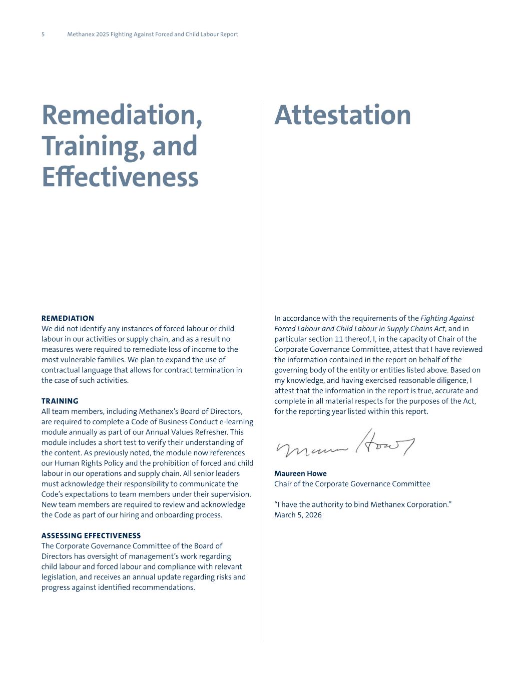 5 Methanex 2025 Fighting Against Forced and Child Labour Report Remediation, Training, and Effectiveness Attestation REMEDIATION We did not identify any instances of forced labour or child labour in our activities or supply chain, and as a result no measures were required to remediate loss of income to the most vulnerable families. We plan to expand the use of contractual language that allows for contract termination in the case of such activities. TRAINING All team members, including Methanex’s Board of Directors, are required to complete a Code of Business Conduct e-learning module annually as part of our Annual Values Refresher. This module includes a short test to verify their understanding of the content. As previously noted, the module now references our Human Rights Policy and the prohibition of forced and child labour in our operations and supply chain. All senior leaders must acknowledge their responsibility to communicate the Code’s expectations to team members under their supervision. New team members are required to review and acknowledge the Code as part of our hiring and onboarding process. ASSESSING EFFECTIVENESS The Corporate Governance Committee of the Board of Directors has oversight of management’s work regarding child labour and forced labour and compliance with relevant legislation, and receives an annual update regarding risks and progress against identified recommendations. In accordance with the requirements of the Fighting Against Forced Labour and Child Labour in Supply Chains Act, and in particular section 11 thereof, I, in the capacity of Chair of the Corporate Governance Committee, attest that I have reviewed the information contained in the report on behalf of the governing body of the entity or entities listed above. Based on my knowledge, and having exercised reasonable diligence, I attest that the information in the report is true, accurate and complete in all material respects for the purposes of the Act, for the reporting year listed within this report. Maureen Howe Chair of the Corporate Governance Committee “I have the authority to bind Methanex Corporation.” March 5, 2026