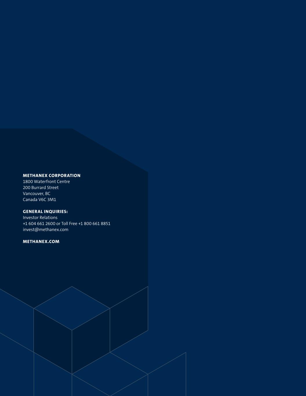 METHANEX CORPORATION 1800 Waterfront Centre 200 Burrard Street Vancouver, BC Canada V6C 3M1 GENERAL INQUIRIES: Investor Relations +1 604 661 2600 or Toll Free +1 800 661 8851 invest@methanex.com METHANEX.COM