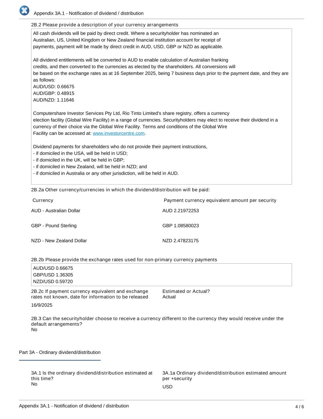 Appendix 3A.1 - Notification of dividend / distribution Appendix 3A.1 - Notification of dividend / distribution 4 / 6 2B.2 Please provide a description of your currency arrangements All cash dividends will be paid by direct credit. Where a securityholder has nominated an Australian, US, United Kingdom or New Zealand financial institution account for receipt of payments, payment will be made by direct credit in AUD, USD, GBP or NZD as applicable. All dividend entitlements will be converted to AUD to enable calculation of Australian franking credits, and then converted to the currencies as elected by the shareholders. All conversions will be based on the exchange rates as at 16 September 2025, being 7 business days prior to the payment date, and they are as follows: AUD/USD: 0.66675 AUD/GBP: 0.48915 AUD/NZD: 1.11646 Computershare Investor Services Pty Ltd, Rio Tinto Limited's share registry, offers a currency election facility (Global Wire Facility) in a range of currencies. Securityholders may elect to receive their dividend in a currency of their choice via the Global Wire Facility. Terms and conditions of the Global Wire Facility can be accessed at: .www.investorcentre.com Dividend payments for shareholders who do not provide their payment instructions, - if domiciled in the USA, will be held in USD; - if domiciled in the UK, will be held in GBP; - if domiciled in New Zealand, will be held in NZD; and - if domiciled in Australia or any other jurisdiction, will be held in AUD. 2B.2a Other currency/currencies in which the dividend/distribution will be paid: Currency Payment currency equivalent amount per security AUD - Australian Dollar AUD 2.21972253 GBP - Pound Sterling GBP 1.08580023 NZD - New Zealand Dollar NZD 2.47823175 2B.2b Please provide the exchange rates used for non-primary currency payments AUD/USD 0.66675 GBP/USD 1.36305 NZD/USD 0.59720 2B.2c If payment currency equivalent and exchange rates not known, date for information to be released 16/9/2025 Estimated or Actual? 2B.3 Can the securityholder choose to receive a currency different to the currency they would receive under the default arrangements? Part 3A - Ordinary dividend/distribution 3A.1 Is the ordinary dividend/distribution estimated at this time? 3A.1a Ordinary dividend/distribution estimated amount per +security USD No No Actual