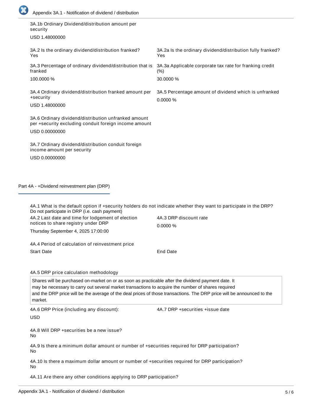 Appendix 3A.1 - Notification of dividend / distribution Appendix 3A.1 - Notification of dividend / distribution 5 / 6 3A.1b Ordinary Dividend/distribution amount per security USD 1.48000000 3A.2 Is the ordinary dividend/distribution franked? 3A.2a Is the ordinary dividend/distribution fully franked? 3A.3 Percentage of ordinary dividend/distribution that is franked 100.0000 % 3A.3a Applicable corporate tax rate for franking credit (%) 30.0000 % 3A.4 Ordinary dividend/distribution franked amount per +security USD 1.48000000 3A.5 Percentage amount of dividend which is unfranked 0.0000 % 3A.6 Ordinary dividend/distribution unfranked amount per +security excluding conduit foreign income amount USD 0.00000000 3A.7 Ordinary dividend/distribution conduit foreign income amount per security USD 0.00000000 Part 4A - +Dividend reinvestment plan (DRP) 4A.1 What is the default option if +security holders do not indicate whether they want to participate in the DRP? 4A.2 Last date and time for lodgement of election notices to share registry under DRP Thursday September 4, 2025 17:00:00 4A.3 DRP discount rate 0.0000 % 4A.4 Period of calculation of reinvestment price Start Date   End Date   4A.5 DRP price calculation methodology Shares will be purchased on-market on or as soon as practicable after the dividend payment date. It may be necessary to carry out several market transactions to acquire the number of shares required and the DRP price will be the average of the deal prices of those transactions. The DRP price will be announced to the market. 4A.6 DRP Price (including any discount): USD 4A.7 DRP +securities +issue date   4A.8 Will DRP +securities be a new issue? 4A.9 Is there a minimum dollar amount or number of +securities required for DRP participation? 4A.10 Is there a maximum dollar amount or number of +securities required for DRP participation? 4A.11 Are there any other conditions applying to DRP participation? No No No Do not participate in DRP (i.e. cash payment) YesYes