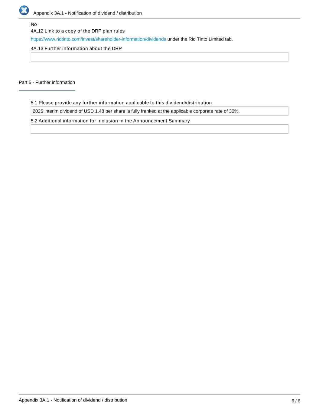 Appendix 3A.1 - Notification of dividend / distribution Appendix 3A.1 - Notification of dividend / distribution 6 / 6 4A.12 Link to a copy of the DRP plan rules under the Rio Tinto Limited tab.https://www.riotinto.com/invest/shareholder-information/dividends 4A.13 Further information about the DRP Part 5 - Further information 5.1 Please provide any further information applicable to this dividend/distribution 2025 interim dividend of USD 1.48 per share is fully franked at the applicable corporate rate of 30%. 5.2 Additional information for inclusion in the Announcement Summary No