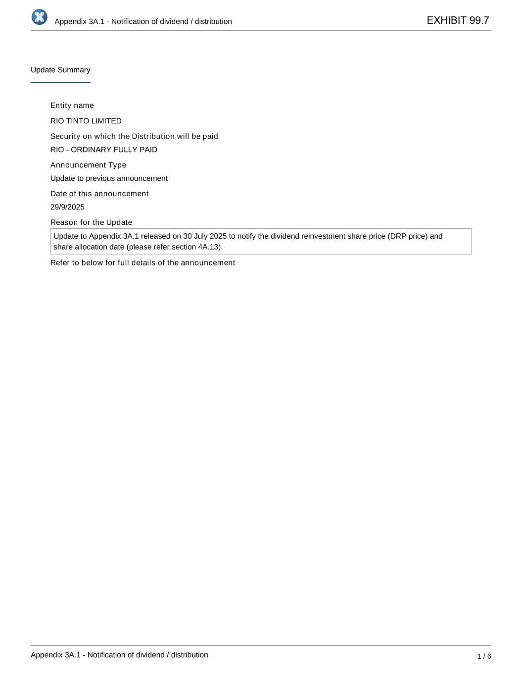 Appendix 3A.1 - Notification of dividend / distribution Appendix 3A.1 - Notification of dividend / distribution 1 / 6 Update Summary Entity name RIO TINTO LIMITED Security on which the Distribution will be paid RIO - ORDINARY FULLY PAID Announcement Type Update to previous announcement Date of this announcement 29/9/2025 Reason for the Update Update to Appendix 3A.1 released on 30 July 2025 to notify the dividend reinvestment share price (DRP price) and share allocation date (please refer section 4A.13). Refer to below for full details of the announcement EXHIBIT 99.7