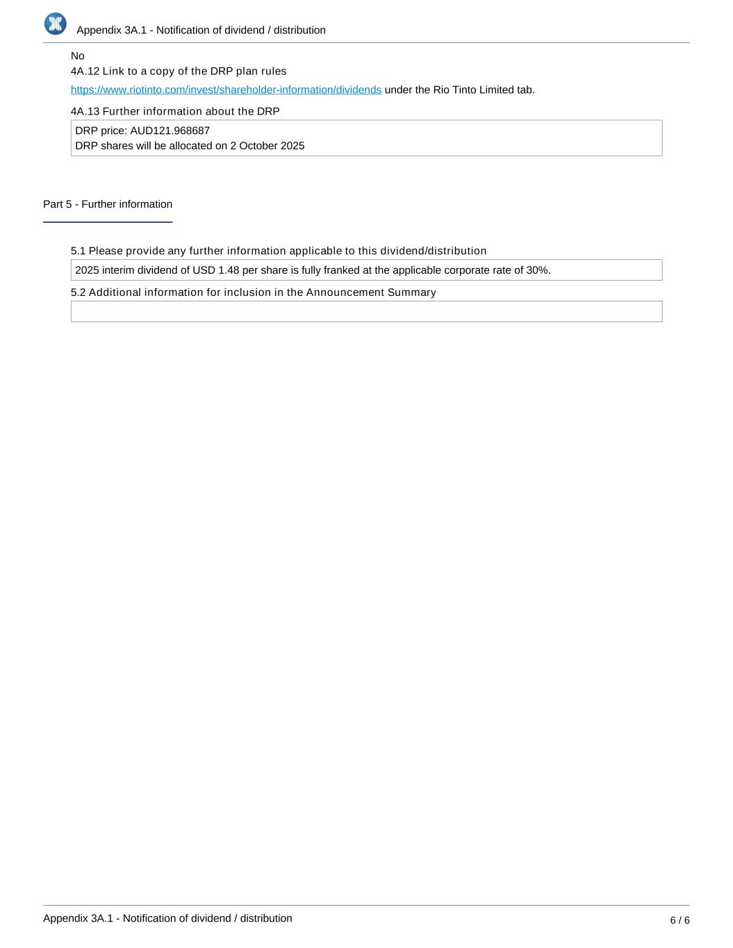 Appendix 3A.1 - Notification of dividend / distribution Appendix 3A.1 - Notification of dividend / distribution 6 / 6 4A.12 Link to a copy of the DRP plan rules under the Rio Tinto Limited tab.https://www.riotinto.com/invest/shareholder-information/dividends 4A.13 Further information about the DRP DRP price: AUD121.968687 DRP shares will be allocated on 2 October 2025 Part 5 - Further information 5.1 Please provide any further information applicable to this dividend/distribution 2025 interim dividend of USD 1.48 per share is fully franked at the applicable corporate rate of 30%. 5.2 Additional information for inclusion in the Announcement Summary No