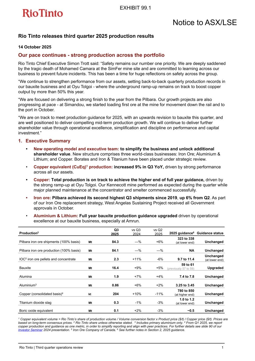 Rio Tinto releases third quarter 2025 production results 14 October 2025 Our pace continues - strong production across the portfolio Rio Tinto Chief Executive Simon Trott said: “Safety remains our number one priority. We are deeply saddened by the tragic death of Mohamed Camara at the SimFer mine site and are committed to learning across our business to prevent future incidents. This has been a time for huge reflections on safety across the group. “We continue to strengthen performance from our assets, setting back-to-back quarterly production records in our bauxite business and at Oyu Tolgoi - where the underground ramp-up remains on track to boost copper output by more than 50% this year. “We are focused on delivering a strong finish to the year from the Pilbara. Our growth projects are also progressing at pace - at Simandou, we started loading first ore at the mine for movement down the rail and to the port in October. “We are on track to meet production guidance for 2025, with an upwards revision to bauxite this quarter, and are well positioned to deliver compelling mid-term production growth. We will continue to deliver further shareholder value through operational excellence, simplification and discipline on performance and capital investment.” 1. Executive Summary • New operating model and executive team: to simplify the business and unlock additional shareholder value. New structure comprises three world-class businesses: Iron Ore; Aluminium & Lithium; and Copper. Borates and Iron & Titanium have been placed under strategic review. • Copper equivalent (CuEq)1 production: increased 9% in Q3 YoY, driven by strong performance across all our assets. • Copper: Total production is on track to achieve the higher end of full year guidance, driven by the strong ramp-up at Oyu Tolgoi. Our Kennecott mine performed as expected during the quarter while major planned maintenance at the concentrator and smelter commenced successfully. • Iron ore: Pilbara achieved its second highest Q3 shipments since 2019, up 6% from Q2. As part of our Iron Ore replacement strategy, West Angelas Sustaining Project received all Government approvals in October. • Aluminium & Lithium: Full year bauxite production guidance upgraded driven by operational excellence at our bauxite business, especially at Amrun. Production2 Q3 2025 vs Q3 2024 vs Q2 2025 2025 guidance6 Guidance status Pilbara iron ore shipments (100% basis) Mt 84.3 — % +6 % 323 to 338 (at lower end) Unchanged Pilbara iron ore production (100% basis) Mt 84.1 — % — % NA Unchanged IOC5 iron ore pellets and concentrate Mt 2.3 +11 % -6 % 9.7 to 11.4 Unchanged (at lower end) Bauxite Mt 16.4 +9 % +5 % 59 to 61 (previously 57 to 59) Upgraded Alumina Mt 1.9 +7 % +4 % 7.4 to 7.8 Unchanged Aluminium3 Mt 0.86 +6 % +2 % 3.25 to 3.45 Unchanged Copper (consolidated basis)4 kt 204 +10 % -11 % 780 to 850 (at higher end) Unchanged Titanium dioxide slag Mt 0.3 -1 % -3 % 1.0 to 1.2 (at lower end) Unchanged Boric oxide equivalent Mt 0.1 +2 % -3 % ~0.5 Unchanged 1 Copper equivalent volume = Rio Tinto’s share of production volume / Volume conversion factor x Product price ($/t) / Copper price ($/t). Prices are based on long-term consensus prices. 2 Rio Tinto share unless otherwise stated. 3 Includes primary aluminium only. 4 From Q1 2025, we report copper production and guidance as one metric, in order to simplify reporting and align with peer practices. For further details see slide 90 of our Investor Seminar 2024 presentation. 5 Iron Ore Company of Canada. 6 See further notes in Section 2, 2025 guidance. Notice to ASX/LSE Rio Tinto | Third quarter operations review 1 EXHIBIT 99.1
