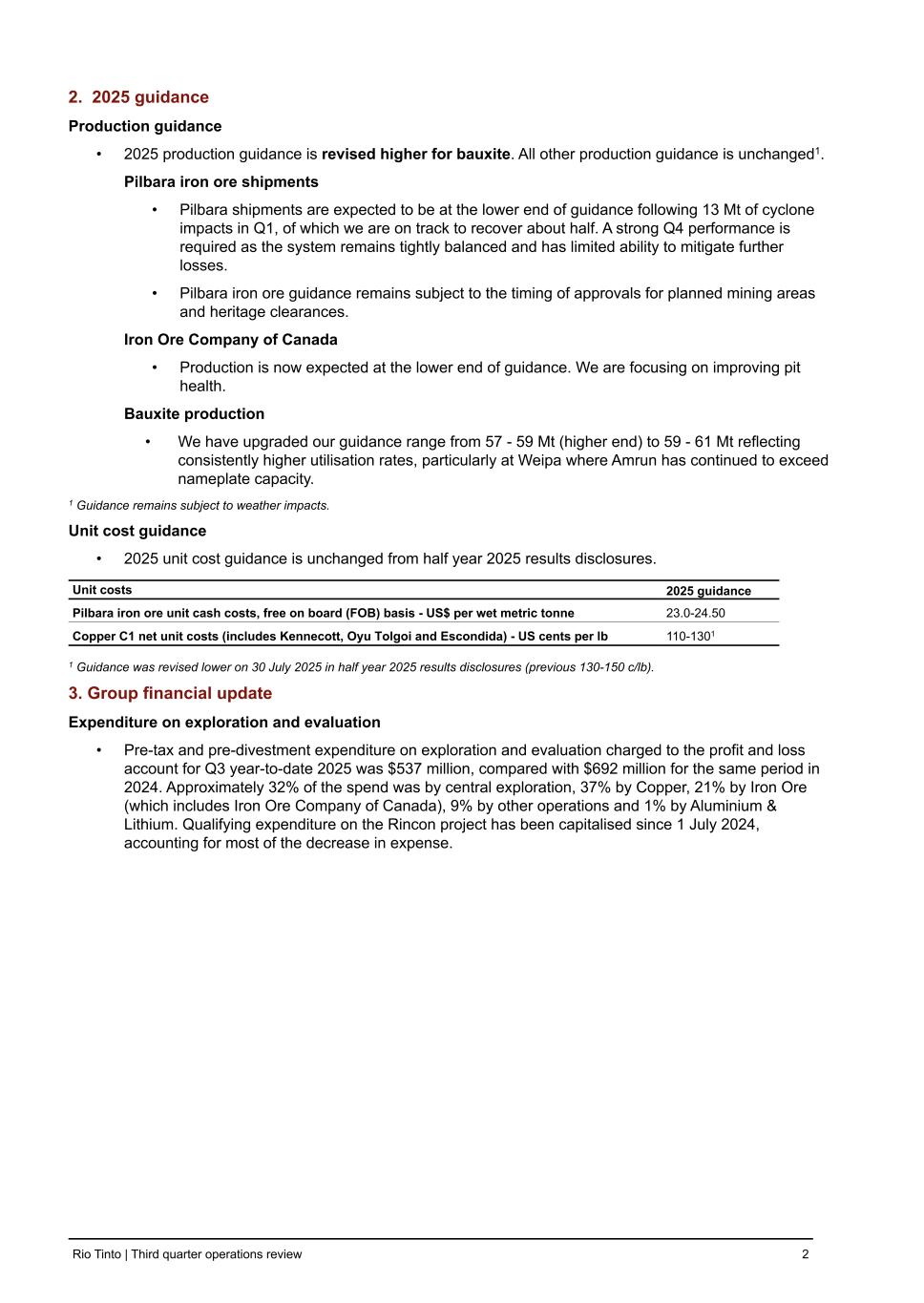 2. 2025 guidance Production guidance • 2025 production guidance is revised higher for bauxite. All other production guidance is unchanged1. Pilbara iron ore shipments • Pilbara shipments are expected to be at the lower end of guidance following 13 Mt of cyclone impacts in Q1, of which we are on track to recover about half. A strong Q4 performance is required as the system remains tightly balanced and has limited ability to mitigate further losses. • Pilbara iron ore guidance remains subject to the timing of approvals for planned mining areas and heritage clearances. Iron Ore Company of Canada • Production is now expected at the lower end of guidance. We are focusing on improving pit health. Bauxite production • We have upgraded our guidance range from 57 - 59 Mt (higher end) to 59 - 61 Mt reflecting consistently higher utilisation rates, particularly at Weipa where Amrun has continued to exceed nameplate capacity. 1 Guidance remains subject to weather impacts. Unit cost guidance • 2025 unit cost guidance is unchanged from half year 2025 results disclosures. Unit costs 2025 guidance Pilbara iron ore unit cash costs, free on board (FOB) basis - US$ per wet metric tonne 23.0-24.50 Copper C1 net unit costs (includes Kennecott, Oyu Tolgoi and Escondida) - US cents per lb 110-1301 1 Guidance was revised lower on 30 July 2025 in half year 2025 results disclosures (previous 130-150 c/lb). 3. Group financial update Expenditure on exploration and evaluation • Pre-tax and pre-divestment expenditure on exploration and evaluation charged to the profit and loss account for Q3 year-to-date 2025 was $537 million, compared with $692 million for the same period in 2024. Approximately 32% of the spend was by central exploration, 37% by Copper, 21% by Iron Ore (which includes Iron Ore Company of Canada), 9% by other operations and 1% by Aluminium & Lithium. Qualifying expenditure on the Rincon project has been capitalised since 1 July 2024, accounting for most of the decrease in expense. Rio Tinto | Third quarter operations review 2