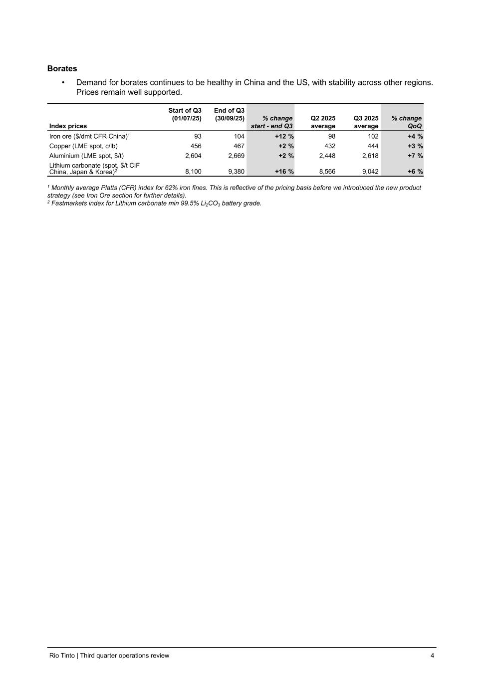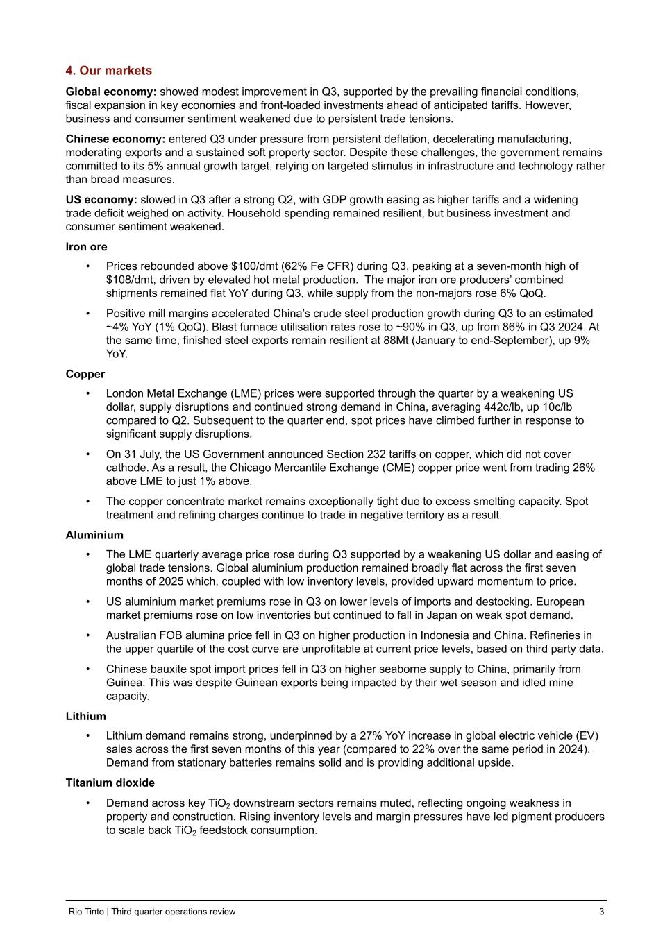 4. Our markets Global economy: showed modest improvement in Q3, supported by the prevailing financial conditions, fiscal expansion in key economies and front-loaded investments ahead of anticipated tariffs. However, business and consumer sentiment weakened due to persistent trade tensions. Chinese economy: entered Q3 under pressure from persistent deflation, decelerating manufacturing, moderating exports and a sustained soft property sector. Despite these challenges, the government remains committed to its 5% annual growth target, relying on targeted stimulus in infrastructure and technology rather than broad measures. US economy: slowed in Q3 after a strong Q2, with GDP growth easing as higher tariffs and a widening trade deficit weighed on activity. Household spending remained resilient, but business investment and consumer sentiment weakened. Iron ore • Prices rebounded above $100/dmt (62% Fe CFR) during Q3, peaking at a seven-month high of $108/dmt, driven by elevated hot metal production. The major iron ore producers’ combined shipments remained flat YoY during Q3, while supply from the non-majors rose 6% QoQ. • Positive mill margins accelerated China’s crude steel production growth during Q3 to an estimated ~4% YoY (1% QoQ). Blast furnace utilisation rates rose to ~90% in Q3, up from 86% in Q3 2024. At the same time, finished steel exports remain resilient at 88Mt (January to end-September), up 9% YoY. Copper • London Metal Exchange (LME) prices were supported through the quarter by a weakening US dollar, supply disruptions and continued strong demand in China, averaging 442c/lb, up 10c/lb compared to Q2. Subsequent to the quarter end, spot prices have climbed further in response to significant supply disruptions. • On 31 July, the US Government announced Section 232 tariffs on copper, which did not cover cathode. As a result, the Chicago Mercantile Exchange (CME) copper price went from trading 26% above LME to just 1% above. • The copper concentrate market remains exceptionally tight due to excess smelting capacity. Spot treatment and refining charges continue to trade in negative territory as a result. Aluminium • The LME quarterly average price rose during Q3 supported by a weakening US dollar and easing of global trade tensions. Global aluminium production remained broadly flat across the first seven months of 2025 which, coupled with low inventory levels, provided upward momentum to price. • US aluminium market premiums rose in Q3 on lower levels of imports and destocking. European market premiums rose on low inventories but continued to fall in Japan on weak spot demand. • Australian FOB alumina price fell in Q3 on higher production in Indonesia and China. Refineries in the upper quartile of the cost curve are unprofitable at current price levels, based on third party data. • Chinese bauxite spot import prices fell in Q3 on higher seaborne supply to China, primarily from Guinea. This was despite Guinean exports being impacted by their wet season and idled mine capacity. Lithium • Lithium demand remains strong, underpinned by a 27% YoY increase in global electric vehicle (EV) sales across the first seven months of this year (compared to 22% over the same period in 2024). Demand from stationary batteries remains solid and is providing additional upside. Titanium dioxide • Demand across key TiO2 downstream sectors remains muted, reflecting ongoing weakness in property and construction. Rising inventory levels and margin pressures have led pigment producers to scale back TiO2 feedstock consumption. Rio Tinto | Third quarter operations review 3