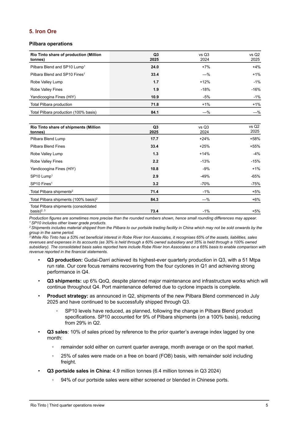 5. Iron Ore Pilbara operations Rio Tinto share of production (Million tonnes) Q3 2025 vs Q3 2024 vs Q2 2025 Pilbara Blend and SP10 Lump1 24.0 +7 % +4 % Pilbara Blend and SP10 Fines1 33.4 — % +1 % Robe Valley Lump 1.7 +12 % -1 % Robe Valley Fines 1.9 -18 % -16 % Yandicoogina Fines (HIY) 10.9 -5 % -1 % Total Pilbara production 71.8 +1 % +1 % Total Pilbara production (100% basis) 84.1 — % — % Rio Tinto share of shipments (Million tonnes) Q3 2025 vs Q3 2024 vs Q2 2025 Pilbara Blend Lump 17.7 +24 % +58 % Pilbara Blend Fines 33.4 +25 % +55 % Robe Valley Lump 1.3 +14 % -4 % Robe Valley Fines 2.2 -13 % -15 % Yandicoogina Fines (HIY) 10.8 -9 % +1 % SP10 Lump1 2.9 -49 % -65 % SP10 Fines1 3.2 -70 % -75 % Total Pilbara shipments2 71.4 -1 % +5 % Total Pilbara shipments (100% basis)2 84.3 — % +6 % Total Pilbara shipments (consolidated basis)2, 3 73.4 -1 % +5 % Production figures are sometimes more precise than the rounded numbers shown, hence small rounding differences may appear. 1 SP10 includes other lower grade products. 2 Shipments includes material shipped from the Pilbara to our portside trading facility in China which may not be sold onwards by the group in the same period. 3 While Rio Tinto has a 53% net beneficial interest in Robe River Iron Associates, it recognises 65% of the assets, liabilities, sales revenues and expenses in its accounts (as 30% is held through a 60% owned subsidiary and 35% is held through a 100% owned subsidiary). The consolidated basis sales reported here include Robe River Iron Associates on a 65% basis to enable comparison with revenue reported in the financial statements. • Q3 production: Gudai-Darri achieved its highest-ever quarterly production in Q3, with a 51 Mtpa run rate. Our core focus remains recovering from the four cyclones in Q1 and achieving strong performance in Q4. • Q3 shipments: up 6% QoQ, despite planned major maintenance and infrastructure works which will continue throughout Q4. Port maintenance deferred due to cyclone impacts is complete. • Product strategy: as announced in Q2, shipments of the new Pilbara Blend commenced in July 2025 and have continued to be successfully shipped through Q3. ◦ SP10 levels have reduced, as planned, following the change in Pilbara Blend product specifications. SP10 accounted for 9% of Pilbara shipments (on a 100% basis), reducing from 29% in Q2. • Q3 sales: 10% of sales priced by reference to the prior quarter’s average index lagged by one month: ◦ remainder sold either on current quarter average, month average or on the spot market. ◦ 25% of sales were made on a free on board (FOB) basis, with remainder sold including freight. • Q3 portside sales in China: 4.9 million tonnes (6.4 million tonnes in Q3 2024) ◦ 94% of our portside sales were either screened or blended in Chinese ports. Rio Tinto | Third quarter operations review 5