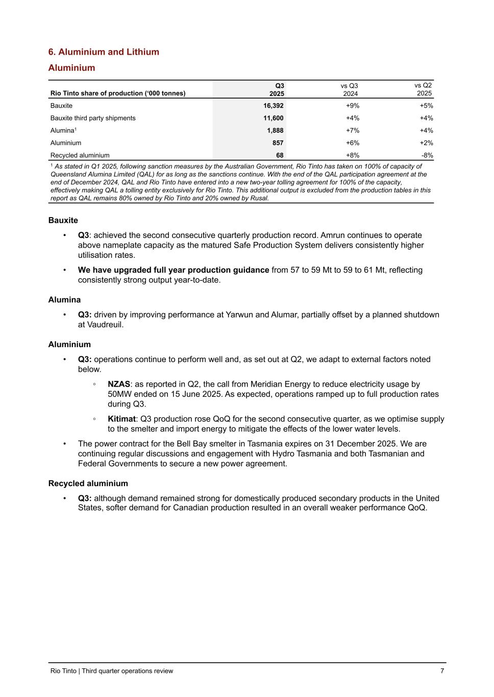 6. Aluminium and Lithium Aluminium Rio Tinto share of production (‘000 tonnes) Q3 2025 vs Q3 2024 vs Q2 2025 Bauxite 16,392 +9 % +5 % Bauxite third party shipments 11,600 +4 % +4 % Alumina1 1,888 +7 % +4 % Aluminium 857 +6 % +2 % Recycled aluminium 68 +8 % -8 % 1 As stated in Q1 2025, following sanction measures by the Australian Government, Rio Tinto has taken on 100% of capacity of Queensland Alumina Limited (QAL) for as long as the sanctions continue. With the end of the QAL participation agreement at the end of December 2024, QAL and Rio Tinto have entered into a new two-year tolling agreement for 100% of the capacity, effectively making QAL a tolling entity exclusively for Rio Tinto. This additional output is excluded from the production tables in this report as QAL remains 80% owned by Rio Tinto and 20% owned by Rusal. Bauxite • Q3: achieved the second consecutive quarterly production record. Amrun continues to operate above nameplate capacity as the matured Safe Production System delivers consistently higher utilisation rates. • We have upgraded full year production guidance from 57 to 59 Mt to 59 to 61 Mt, reflecting consistently strong output year-to-date. Alumina • Q3: driven by improving performance at Yarwun and Alumar, partially offset by a planned shutdown at Vaudreuil. Aluminium • Q3: operations continue to perform well and, as set out at Q2, we adapt to external factors noted below. ◦ NZAS: as reported in Q2, the call from Meridian Energy to reduce electricity usage by 50MW ended on 15 June 2025. As expected, operations ramped up to full production rates during Q3. ◦ Kitimat: Q3 production rose QoQ for the second consecutive quarter, as we optimise supply to the smelter and import energy to mitigate the effects of the lower water levels. • The power contract for the Bell Bay smelter in Tasmania expires on 31 December 2025. We are continuing regular discussions and engagement with Hydro Tasmania and both Tasmanian and Federal Governments to secure a new power agreement. Recycled aluminium • Q3: although demand remained strong for domestically produced secondary products in the United States, softer demand for Canadian production resulted in an overall weaker performance QoQ. Rio Tinto | Third quarter operations review 7