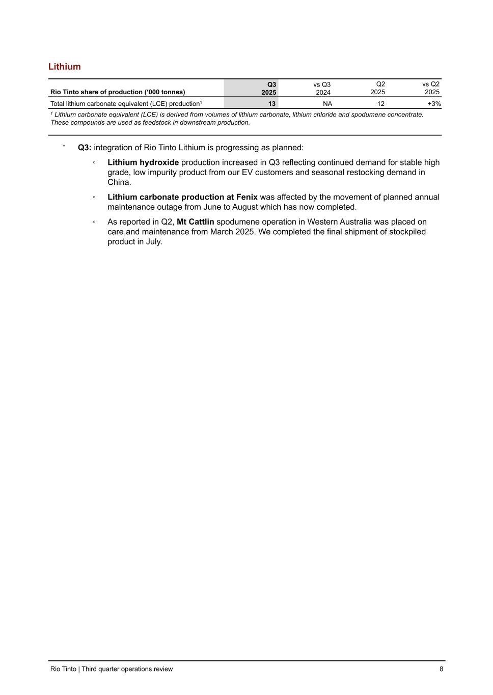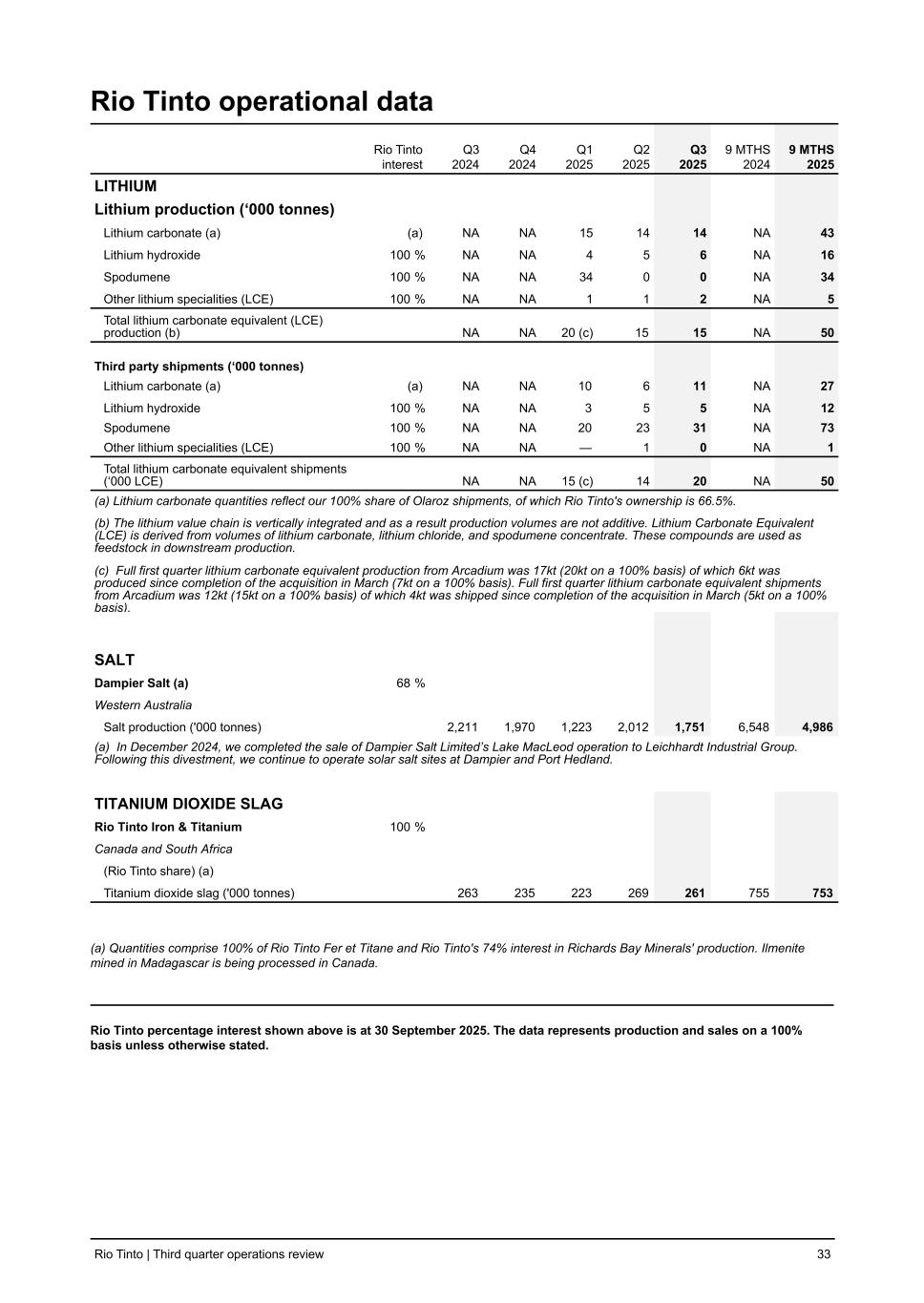 Rio Tinto operational data Rio Tinto interest Q3 2024 Q4 2024 Q1 2025 Q2 2025 Q3 2025 9 MTHS 2024 9 MTHS 2025 LITHIUM Lithium production (‘000 tonnes) Lithium carbonate (a) (a) NA NA 15 14 14 NA 43 Lithium hydroxide 100 % NA NA 4 5 6 NA 16 Spodumene 100 % NA NA 34 0 0 NA 34 Other lithium specialities (LCE) 100 % NA NA 1 1 2 NA 5 Total lithium carbonate equivalent (LCE) production (b) NA NA 20 (c) 15 15 NA 50 Third party shipments (‘000 tonnes) Lithium carbonate (a) (a) NA NA 10 6 11 NA 27 Lithium hydroxide 100 % NA NA 3 5 5 NA 12 Spodumene 100 % NA NA 20 23 31 NA 73 Other lithium specialities (LCE) 100 % NA NA — 1 0 NA 1 Total lithium carbonate equivalent shipments (‘000 LCE) NA NA 15 (c) 14 20 NA 50 (a) Lithium carbonate quantities reflect our 100% share of Olaroz shipments, of which Rio Tinto's ownership is 66.5%. (b) The lithium value chain is vertically integrated and as a result production volumes are not additive. Lithium Carbonate Equivalent (LCE) is derived from volumes of lithium carbonate, lithium chloride, and spodumene concentrate. These compounds are used as feedstock in downstream production. (c) Full first quarter lithium carbonate equivalent production from Arcadium was 17kt (20kt on a 100% basis) of which 6kt was produced since completion of the acquisition in March (7kt on a 100% basis). Full first quarter lithium carbonate equivalent shipments from Arcadium was 12kt (15kt on a 100% basis) of which 4kt was shipped since completion of the acquisition in March (5kt on a 100% basis). SALT Dampier Salt (a) 68 % Western Australia Salt production ('000 tonnes) 2,211 1,970 1,223 2,012 1,751 6,548 4,986 (a) In December 2024, we completed the sale of Dampier Salt Limited’s Lake MacLeod operation to Leichhardt Industrial Group. Following this divestment, we continue to operate solar salt sites at Dampier and Port Hedland. TITANIUM DIOXIDE SLAG Rio Tinto Iron & Titanium 100 % Canada and South Africa (Rio Tinto share) (a) Titanium dioxide slag ('000 tonnes) 263 235 223 269 261 755 753 (a) Quantities comprise 100% of Rio Tinto Fer et Titane and Rio Tinto's 74% interest in Richards Bay Minerals' production. Ilmenite mined in Madagascar is being processed in Canada. Rio Tinto percentage interest shown above is at 30 September 2025. The data represents production and sales on a 100% basis unless otherwise stated. Rio Tinto | Third quarter operations review 33