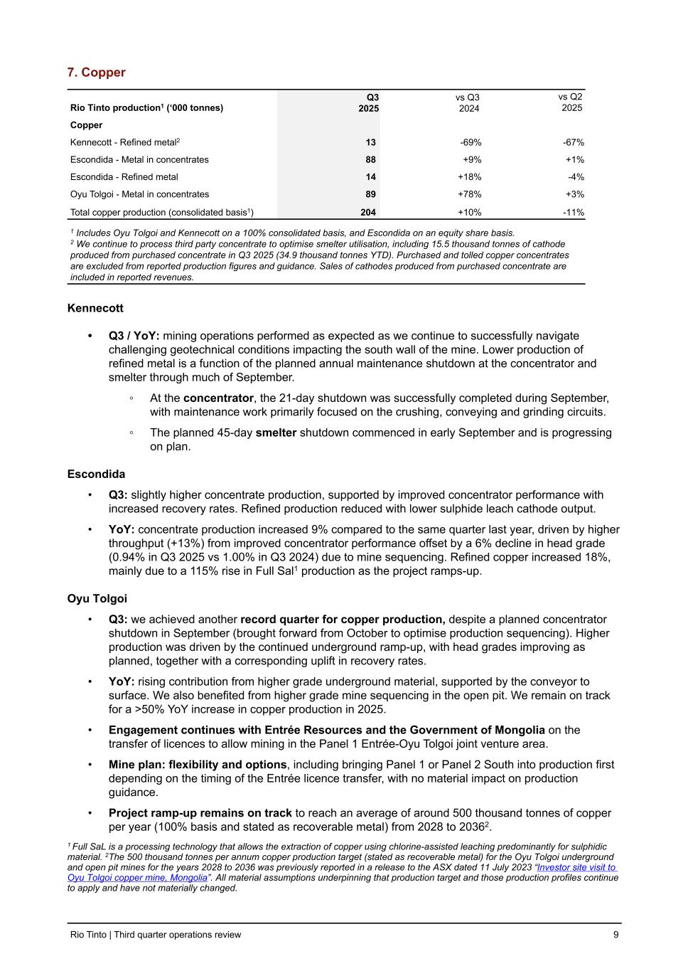 7. Copper Rio Tinto production1 (‘000 tonnes) Q3 2025 vs Q3 2024 vs Q2 2025 Copper Kennecott - Refined metal2 13 -69 % -67 % Escondida - Metal in concentrates 88 +9 % +1 % Escondida - Refined metal 14 +18 % -4 % Oyu Tolgoi - Metal in concentrates 89 +78 % +3 % Total copper production (consolidated basis1) 204 +10 % -11 % 1 Includes Oyu Tolgoi and Kennecott on a 100% consolidated basis, and Escondida on an equity share basis. 2 We continue to process third party concentrate to optimise smelter utilisation, including 15.5 thousand tonnes of cathode produced from purchased concentrate in Q3 2025 (34.9 thousand tonnes YTD). Purchased and tolled copper concentrates are excluded from reported production figures and guidance. Sales of cathodes produced from purchased concentrate are included in reported revenues. Kennecott • Q3 / YoY: mining operations performed as expected as we continue to successfully navigate challenging geotechnical conditions impacting the south wall of the mine. Lower production of refined metal is a function of the planned annual maintenance shutdown at the concentrator and smelter through much of September. ◦ At the concentrator, the 21-day shutdown was successfully completed during September, with maintenance work primarily focused on the crushing, conveying and grinding circuits. ◦ The planned 45-day smelter shutdown commenced in early September and is progressing on plan. Escondida • Q3: slightly higher concentrate production, supported by improved concentrator performance with increased recovery rates. Refined production reduced with lower sulphide leach cathode output. • YoY: concentrate production increased 9% compared to the same quarter last year, driven by higher throughput (+13%) from improved concentrator performance offset by a 6% decline in head grade (0.94% in Q3 2025 vs 1.00% in Q3 2024) due to mine sequencing. Refined copper increased 18%, mainly due to a 115% rise in Full Sal1 production as the project ramps-up. Oyu Tolgoi • Q3: we achieved another record quarter for copper production, despite a planned concentrator shutdown in September (brought forward from October to optimise production sequencing). Higher production was driven by the continued underground ramp-up, with head grades improving as planned, together with a corresponding uplift in recovery rates. • YoY: rising contribution from higher grade underground material, supported by the conveyor to surface. We also benefited from higher grade mine sequencing in the open pit. We remain on track for a >50% YoY increase in copper production in 2025. • Engagement continues with Entrée Resources and the Government of Mongolia on the transfer of licences to allow mining in the Panel 1 Entrée-Oyu Tolgoi joint venture area. • Mine plan: flexibility and options, including bringing Panel 1 or Panel 2 South into production first depending on the timing of the Entrée licence transfer, with no material impact on production guidance. • Project ramp-up remains on track to reach an average of around 500 thousand tonnes of copper per year (100% basis and stated as recoverable metal) from 2028 to 20362. 1 Full SaL is a processing technology that allows the extraction of copper using chlorine-assisted leaching predominantly for sulphidic material. 2The 500 thousand tonnes per annum copper production target (stated as recoverable metal) for the Oyu Tolgoi underground and open pit mines for the years 2028 to 2036 was previously reported in a release to the ASX dated 11 July 2023 “Investor site visit to Oyu Tolgoi copper mine, Mongolia”. All material assumptions underpinning that production target and those production profiles continue to apply and have not materially changed. Rio Tinto | Third quarter operations review 9