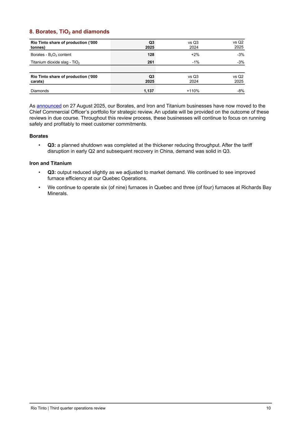 8. Borates, TiO2 and diamonds Rio Tinto share of production (’000 tonnes) Q3 2025 vs Q3 2024 vs Q2 2025 Borates - B2O3 content 128 +2 % -3 % Titanium dioxide slag - TiO2 261 -1 % -3 % Rio Tinto share of production (‘000 carats) Q3 2025 vs Q3 2024 vs Q2 2025 Diamonds 1,137 +110 % -8 % As announced on 27 August 2025, our Borates, and Iron and Titanium businesses have now moved to the Chief Commercial Officer’s portfolio for strategic review. An update will be provided on the outcome of these reviews in due course. Throughout this review process, these businesses will continue to focus on running safely and profitably to meet customer commitments. Borates • Q3: a planned shutdown was completed at the thickener reducing throughput. After the tariff disruption in early Q2 and subsequent recovery in China, demand was solid in Q3. Iron and Titanium • Q3: output reduced slightly as we adjusted to market demand. We continued to see improved furnace efficiency at our Quebec Operations. • We continue to operate six (of nine) furnaces in Quebec and three (of four) furnaces at Richards Bay Minerals. Rio Tinto | Third quarter operations review 10