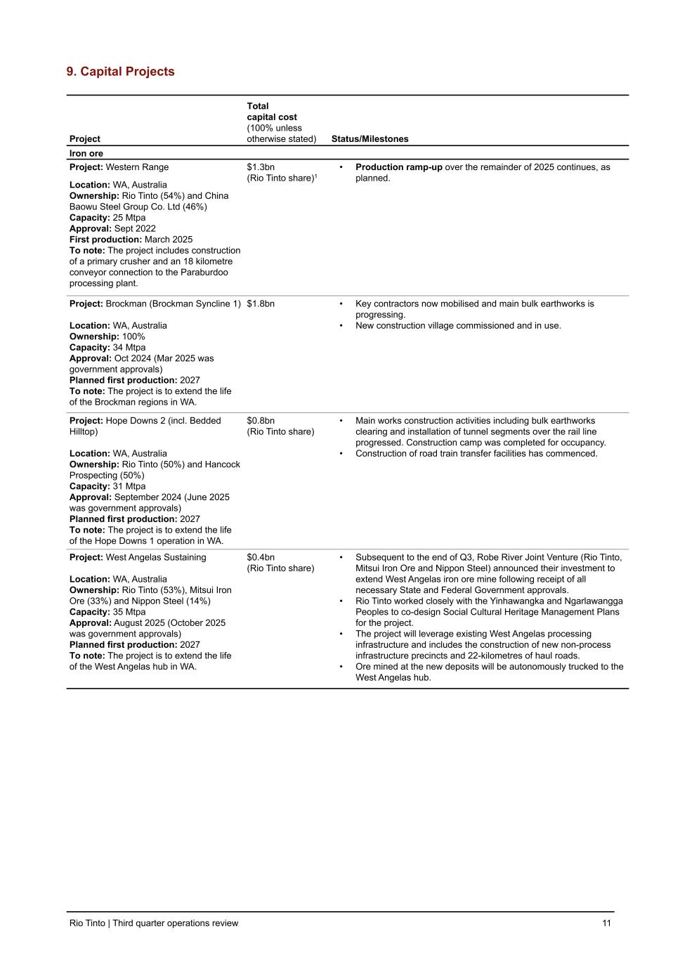 9. Capital Projects Project Total capital cost (100% unless otherwise stated) Status/Milestones Iron ore Project: Western Range Location: WA, Australia Ownership: Rio Tinto (54%) and China Baowu Steel Group Co. Ltd (46%) Capacity: 25 Mtpa Approval: Sept 2022 First production: March 2025 To note: The project includes construction of a primary crusher and an 18 kilometre conveyor connection to the Paraburdoo processing plant. $1.3bn (Rio Tinto share)1 • Production ramp-up over the remainder of 2025 continues, as planned. Project: Brockman (Brockman Syncline 1) Location: WA, Australia Ownership: 100% Capacity: 34 Mtpa Approval: Oct 2024 (Mar 2025 was government approvals) Planned first production: 2027 To note: The project is to extend the life of the Brockman regions in WA. $1.8bn • Key contractors now mobilised and main bulk earthworks is progressing. • New construction village commissioned and in use. Project: Hope Downs 2 (incl. Bedded Hilltop) Location: WA, Australia Ownership: Rio Tinto (50%) and Hancock Prospecting (50%) Capacity: 31 Mtpa Approval: September 2024 (June 2025 was government approvals) Planned first production: 2027 To note: The project is to extend the life of the Hope Downs 1 operation in WA. $0.8bn (Rio Tinto share) • Main works construction activities including bulk earthworks clearing and installation of tunnel segments over the rail line progressed. Construction camp was completed for occupancy. • Construction of road train transfer facilities has commenced. Project: West Angelas Sustaining Location: WA, Australia Ownership: Rio Tinto (53%), Mitsui Iron Ore (33%) and Nippon Steel (14%) Capacity: 35 Mtpa Approval: August 2025 (October 2025 was government approvals) Planned first production: 2027 To note: The project is to extend the life of the West Angelas hub in WA. $0.4bn (Rio Tinto share) • Subsequent to the end of Q3, Robe River Joint Venture (Rio Tinto, Mitsui Iron Ore and Nippon Steel) announced their investment to extend West Angelas iron ore mine following receipt of all necessary State and Federal Government approvals. • Rio Tinto worked closely with the Yinhawangka and Ngarlawangga Peoples to co-design Social Cultural Heritage Management Plans for the project. • The project will leverage existing West Angelas processing infrastructure and includes the construction of new non-process infrastructure precincts and 22-kilometres of haul roads. • Ore mined at the new deposits will be autonomously trucked to the West Angelas hub. Rio Tinto | Third quarter operations review 11