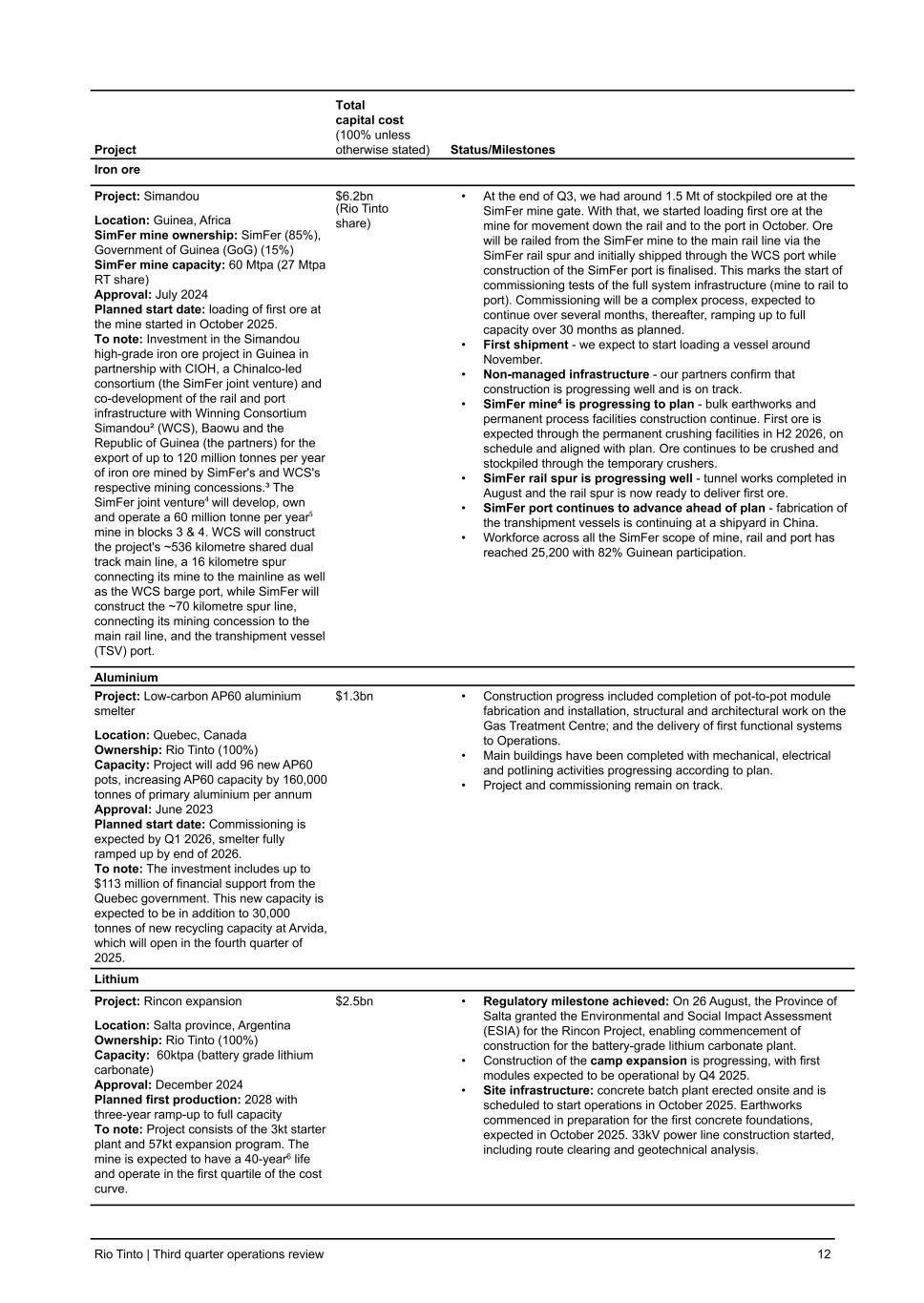 Project Total capital cost (100% unless otherwise stated) Status/Milestones Iron ore Project: Simandou Location: Guinea, Africa SimFer mine ownership: SimFer (85%), Government of Guinea (GoG) (15%) SimFer mine capacity: 60 Mtpa (27 Mtpa RT share) Approval: July 2024 Planned start date: loading of first ore at the mine started in October 2025. To note: Investment in the Simandou high-grade iron ore project in Guinea in partnership with CIOH, a Chinalco-led consortium (the SimFer joint venture) and co-development of the rail and port infrastructure with Winning Consortium Simandou² (WCS), Baowu and the Republic of Guinea (the partners) for the export of up to 120 million tonnes per year of iron ore mined by SimFer's and WCS's respective mining concessions.³ The SimFer joint venture⁴ will develop, own and operate a 60 million tonne per year⁵ mine in blocks 3 & 4. WCS will construct the project's ~536 kilometre shared dual track main line, a 16 kilometre spur connecting its mine to the mainline as well as the WCS barge port, while SimFer will construct the ~70 kilometre spur line, connecting its mining concession to the main rail line, and the transhipment vessel (TSV) port. $6.2bn (Rio Tinto share) • At the end of Q3, we had around 1.5 Mt of stockpiled ore at the SimFer mine gate. With that, we started loading first ore at the mine for movement down the rail and to the port in October. Ore will be railed from the SimFer mine to the main rail line via the SimFer rail spur and initially shipped through the WCS port while construction of the SimFer port is finalised. This marks the start of commissioning tests of the full system infrastructure (mine to rail to port). Commissioning will be a complex process, expected to continue over several months, thereafter, ramping up to full capacity over 30 months as planned. • First shipment - we expect to start loading a vessel around November. • Non-managed infrastructure - our partners confirm that construction is progressing well and is on track. • SimFer mine4 is progressing to plan - bulk earthworks and permanent process facilities construction continue. First ore is expected through the permanent crushing facilities in H2 2026, on schedule and aligned with plan. Ore continues to be crushed and stockpiled through the temporary crushers. • SimFer rail spur is progressing well - tunnel works completed in August and the rail spur is now ready to deliver first ore. • SimFer port continues to advance ahead of plan - fabrication of the transhipment vessels is continuing at a shipyard in China. • Workforce across all the SimFer scope of mine, rail and port has reached 25,200 with 82% Guinean participation. Aluminium Project: Low-carbon AP60 aluminium smelter Location: Quebec, Canada Ownership: Rio Tinto (100%) Capacity: Project will add 96 new AP60 pots, increasing AP60 capacity by 160,000 tonnes of primary aluminium per annum Approval: June 2023 Planned start date: Commissioning is expected by Q1 2026, smelter fully ramped up by end of 2026. To note: The investment includes up to $113 million of financial support from the Quebec government. This new capacity is expected to be in addition to 30,000 tonnes of new recycling capacity at Arvida, which will open in the fourth quarter of 2025. $1.3bn • Construction progress included completion of pot-to-pot module fabrication and installation, structural and architectural work on the Gas Treatment Centre; and the delivery of first functional systems to Operations. • Main buildings have been completed with mechanical, electrical and potlining activities progressing according to plan. • Project and commissioning remain on track. Lithium Project: Rincon expansion Location: Salta province, Argentina Ownership: Rio Tinto (100%) Capacity: 60ktpa (battery grade lithium carbonate) Approval: December 2024 Planned first production: 2028 with three-year ramp-up to full capacity To note: Project consists of the 3kt starter plant and 57kt expansion program. The mine is expected to have a 40-year6 life and operate in the first quartile of the cost curve. $2.5bn • Regulatory milestone achieved: On 26 August, the Province of Salta granted the Environmental and Social Impact Assessment (ESIA) for the Rincon Project, enabling commencement of construction for the battery-grade lithium carbonate plant. • Construction of the camp expansion is progressing, with first modules expected to be operational by Q4 2025. • Site infrastructure: concrete batch plant erected onsite and is scheduled to start operations in October 2025. Earthworks commenced in preparation for the first concrete foundations, expected in October 2025. 33kV power line construction started, including route clearing and geotechnical analysis. Rio Tinto | Third quarter operations review 12