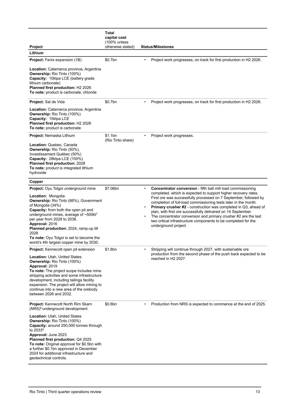 Project Total capital cost (100% unless otherwise stated) Status/Milestones Lithium Project: Fenix expansion (1B) Location: Catamarca province, Argentina Ownership: Rio Tinto (100%) Capacity: 10ktpa LCE (battery grade lithium carbonate) Planned first production: H2 2026 To note: product is carbonate, chloride $0.7bn • Project work progresses, on track for first production in H2 2026. Project: Sal de Vida Location: Catamarca province, Argentina Ownership: Rio Tinto (100%) Capacity: 15ktpa LCE Planned first production: H2 2026 To note: product is carbonate $0.7bn • Project work progresses, on track for first production in H2 2026. Project: Nemaska Lithium Location: Quebec, Canada Ownership: Rio Tinto (50%), Investissement Québec (50%) Capacity: 28ktpa LCE (100%) Planned first production: 2028 To note: product is integrated lithium hydroxide $1.1bn (Rio Tinto share) • Project work progresses. Copper Project: Oyu Tolgoi underground mine Location: Mongolia Ownership: Rio Tinto (66%), Government of Mongolia (34%) Capacity: from both the open pit and underground mines, average of ~500kt7 per year from 2028 to 2036. Approval: 2016 Planned production: 2024, ramp-up till 2028 To note: Oyu Tolgoi is set to become the world’s 4th largest copper mine by 2030. $7.06bn • Concentrator conversion - fifth ball mill load commissioning completed, which is expected to support higher recovery rates. First ore was successfully processed on 7 September, followed by completion of full-load commissioning tests later in the month. • Primary crusher #2 - construction was completed in Q3, ahead of plan, with first ore successfully delivered on 14 September. • The concentrator conversion and primary crusher #2 are the last two critical infrastructure components to be completed for the underground project. Project: Kennecott open pit extension Location: Utah, United States Ownership: Rio Tinto (100%) Approval: 2019 To note: The project scope includes mine stripping activities and some infrastructure development, including tailings facility expansion. The project will allow mining to continue into a new area of the orebody between 2026 and 2032. $1.8bn • Stripping will continue through 2027, with sustainable ore production from the second phase of the push back expected to be reached in H2 2027. Project: Kennecott North Rim Skarn (NRS)8 underground development Location: Utah, United States Ownership: Rio Tinto (100%) Capacity: around 250,000 tonnes through to 20339 Approval: June 2023 Planned first production: Q4 2025 To note: Original approval for $0.5bn with a further $0.1bn approved in December 2024 for additional infrastructure and geotechnical controls. $0.6bn • Production from NRS is expected to commence at the end of 2025. Rio Tinto | Third quarter operations review 13