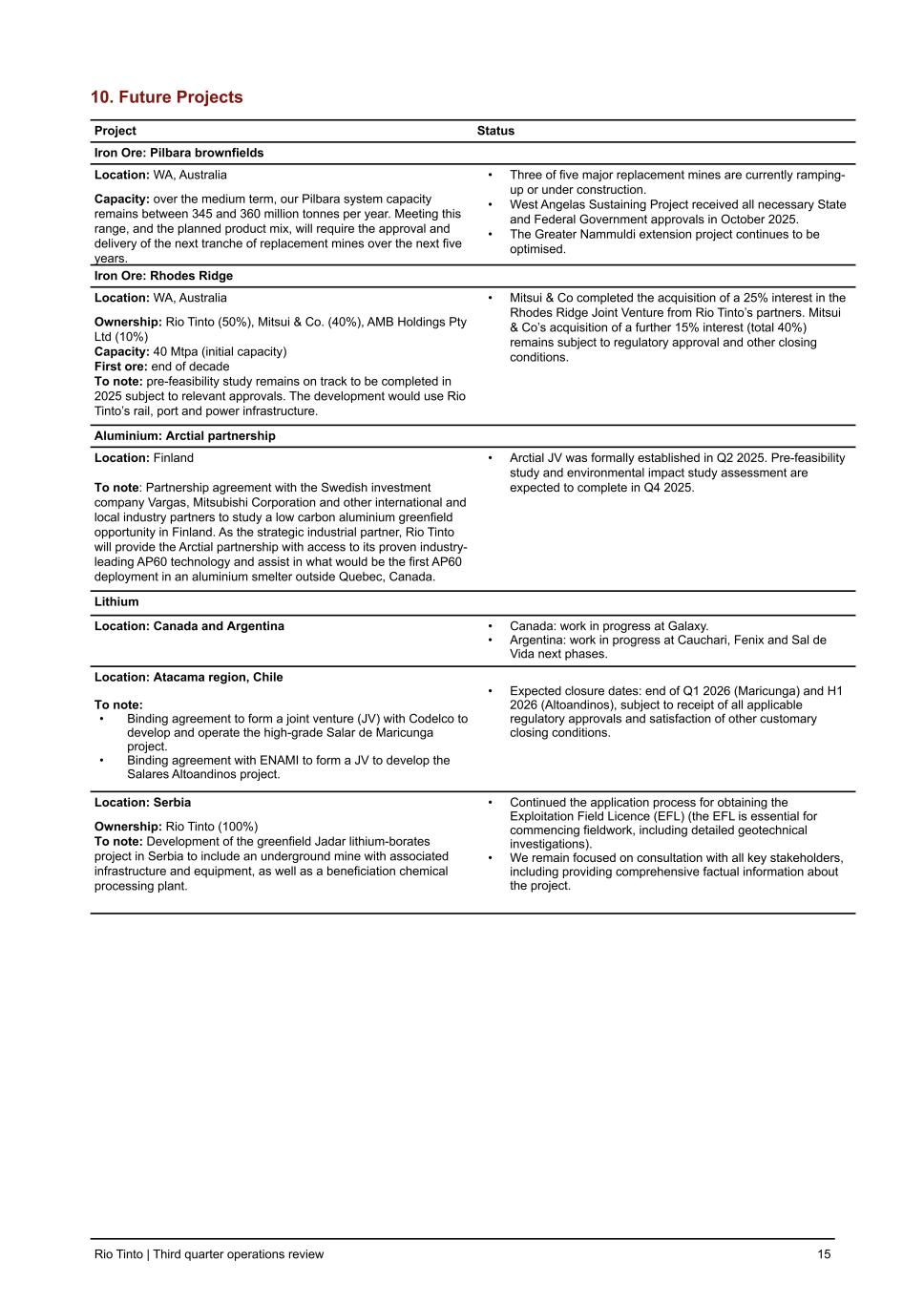 10. Future Projects Project Status Iron Ore: Pilbara brownfields Location: WA, Australia Capacity: over the medium term, our Pilbara system capacity remains between 345 and 360 million tonnes per year. Meeting this range, and the planned product mix, will require the approval and delivery of the next tranche of replacement mines over the next five years. • Three of five major replacement mines are currently ramping- up or under construction. • West Angelas Sustaining Project received all necessary State and Federal Government approvals in October 2025. • The Greater Nammuldi extension project continues to be optimised. Iron Ore: Rhodes Ridge Location: WA, Australia Ownership: Rio Tinto (50%), Mitsui & Co. (40%), AMB Holdings Pty Ltd (10%) Capacity: 40 Mtpa (initial capacity) First ore: end of decade To note: pre-feasibility study remains on track to be completed in 2025 subject to relevant approvals. The development would use Rio Tinto’s rail, port and power infrastructure. • Mitsui & Co completed the acquisition of a 25% interest in the Rhodes Ridge Joint Venture from Rio Tinto’s partners. Mitsui & Co’s acquisition of a further 15% interest (total 40%) remains subject to regulatory approval and other closing conditions. Aluminium: Arctial partnership Location: Finland To note: Partnership agreement with the Swedish investment company Vargas, Mitsubishi Corporation and other international and local industry partners to study a low carbon aluminium greenfield opportunity in Finland. As the strategic industrial partner, Rio Tinto will provide the Arctial partnership with access to its proven industry- leading AP60 technology and assist in what would be the first AP60 deployment in an aluminium smelter outside Quebec, Canada. • Arctial JV was formally established in Q2 2025. Pre-feasibility study and environmental impact study assessment are expected to complete in Q4 2025. Lithium Location: Canada and Argentina • Canada: work in progress at Galaxy. • Argentina: work in progress at Cauchari, Fenix and Sal de Vida next phases. Location: Atacama region, Chile To note: • Binding agreement to form a joint venture (JV) with Codelco to develop and operate the high-grade Salar de Maricunga project. • Binding agreement with ENAMI to form a JV to develop the Salares Altoandinos project. • Expected closure dates: end of Q1 2026 (Maricunga) and H1 2026 (Altoandinos), subject to receipt of all applicable regulatory approvals and satisfaction of other customary closing conditions. Location: Serbia Ownership: Rio Tinto (100%) To note: Development of the greenfield Jadar lithium-borates project in Serbia to include an underground mine with associated infrastructure and equipment, as well as a beneficiation chemical processing plant. • Continued the application process for obtaining the Exploitation Field Licence (EFL) (the EFL is essential for commencing fieldwork, including detailed geotechnical investigations). • We remain focused on consultation with all key stakeholders, including providing comprehensive factual information about the project. Rio Tinto | Third quarter operations review 15
