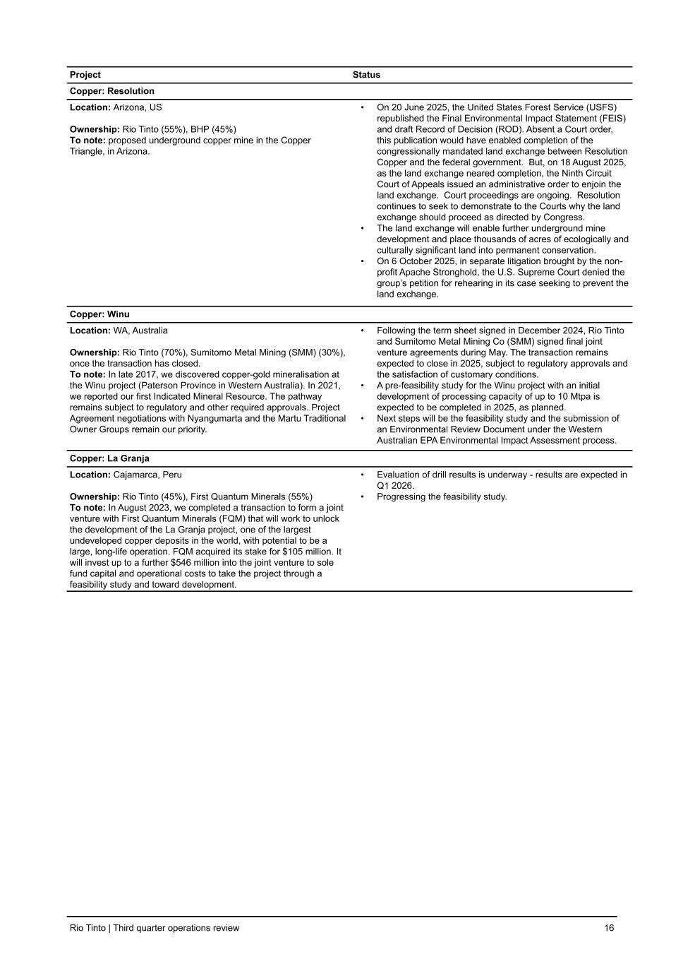 Project Status Copper: Resolution Location: Arizona, US Ownership: Rio Tinto (55%), BHP (45%) To note: proposed underground copper mine in the Copper Triangle, in Arizona. • On 20 June 2025, the United States Forest Service (USFS) republished the Final Environmental Impact Statement (FEIS) and draft Record of Decision (ROD). Absent a Court order, this publication would have enabled completion of the congressionally mandated land exchange between Resolution Copper and the federal government. But, on 18 August 2025, as the land exchange neared completion, the Ninth Circuit Court of Appeals issued an administrative order to enjoin the land exchange. Court proceedings are ongoing. Resolution continues to seek to demonstrate to the Courts why the land exchange should proceed as directed by Congress. • The land exchange will enable further underground mine development and place thousands of acres of ecologically and culturally significant land into permanent conservation. • On 6 October 2025, in separate litigation brought by the non- profit Apache Stronghold, the U.S. Supreme Court denied the group’s petition for rehearing in its case seeking to prevent the land exchange. Copper: Winu Location: WA, Australia Ownership: Rio Tinto (70%), Sumitomo Metal Mining (SMM) (30%), once the transaction has closed. To note: In late 2017, we discovered copper-gold mineralisation at the Winu project (Paterson Province in Western Australia). In 2021, we reported our first Indicated Mineral Resource. The pathway remains subject to regulatory and other required approvals. Project Agreement negotiations with Nyangumarta and the Martu Traditional Owner Groups remain our priority. • Following the term sheet signed in December 2024, Rio Tinto and Sumitomo Metal Mining Co (SMM) signed final joint venture agreements during May. The transaction remains expected to close in 2025, subject to regulatory approvals and the satisfaction of customary conditions. • A pre-feasibility study for the Winu project with an initial development of processing capacity of up to 10 Mtpa is expected to be completed in 2025, as planned. • Next steps will be the feasibility study and the submission of an Environmental Review Document under the Western Australian EPA Environmental Impact Assessment process. Copper: La Granja Location: Cajamarca, Peru Ownership: Rio Tinto (45%), First Quantum Minerals (55%) To note: In August 2023, we completed a transaction to form a joint venture with First Quantum Minerals (FQM) that will work to unlock the development of the La Granja project, one of the largest undeveloped copper deposits in the world, with potential to be a large, long-life operation. FQM acquired its stake for $105 million. It will invest up to a further $546 million into the joint venture to sole fund capital and operational costs to take the project through a feasibility study and toward development. • Evaluation of drill results is underway - results are expected in Q1 2026. • Progressing the feasibility study. Rio Tinto | Third quarter operations review 16
