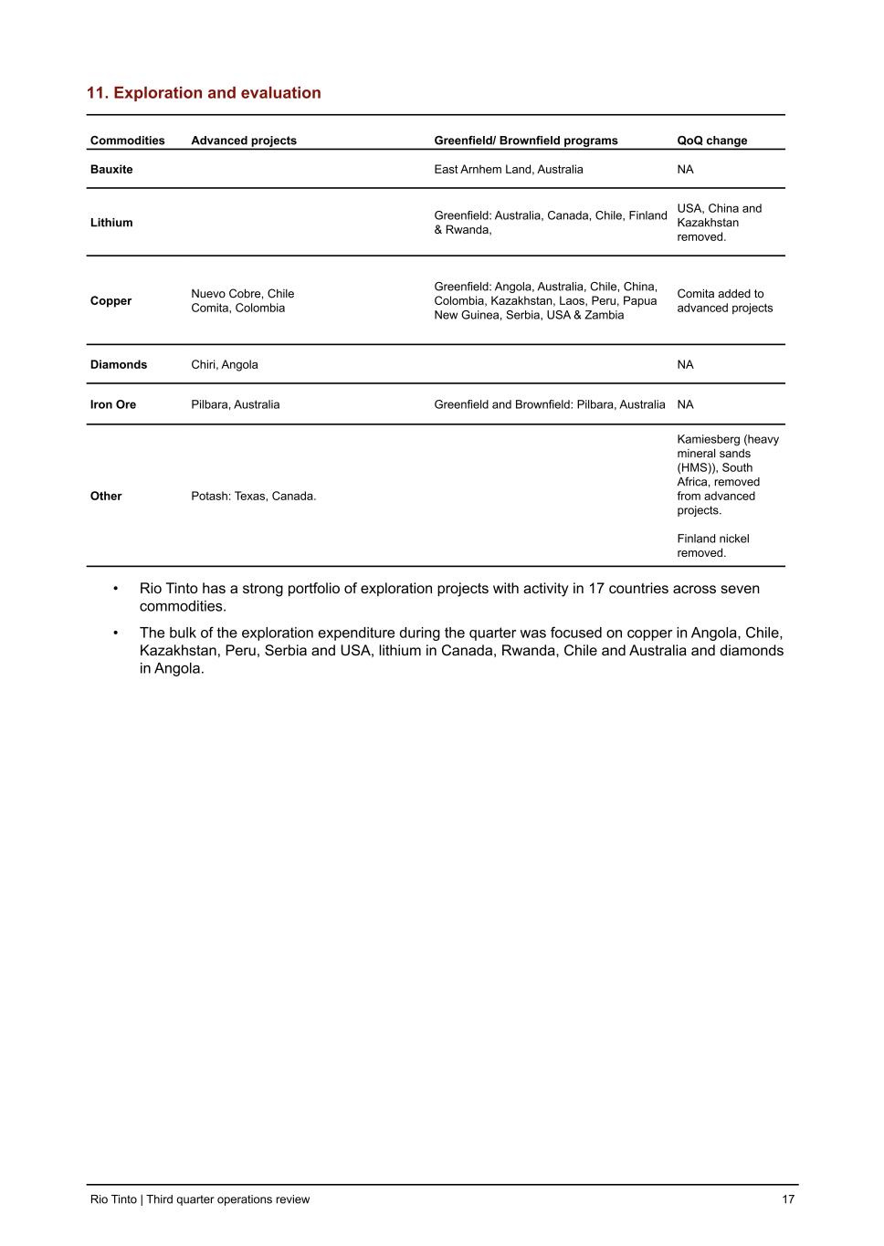 11. Exploration and evaluation Commodities Advanced projects Greenfield/ Brownfield programs QoQ change Bauxite East Arnhem Land, Australia NA Lithium Greenfield: Australia, Canada, Chile, Finland & Rwanda, USA, China and Kazakhstan removed. Copper Nuevo Cobre, Chile Comita, Colombia Greenfield: Angola, Australia, Chile, China, Colombia, Kazakhstan, Laos, Peru, Papua New Guinea, Serbia, USA & Zambia Comita added to advanced projects Diamonds Chiri, Angola NA Iron Ore Pilbara, Australia Greenfield and Brownfield: Pilbara, Australia NA Other Potash: Texas, Canada. Kamiesberg (heavy mineral sands (HMS)), South Africa, removed from advanced projects. Finland nickel removed. • Rio Tinto has a strong portfolio of exploration projects with activity in 17 countries across seven commodities. • The bulk of the exploration expenditure during the quarter was focused on copper in Angola, Chile, Kazakhstan, Peru, Serbia and USA, lithium in Canada, Rwanda, Chile and Australia and diamonds in Angola. Rio Tinto | Third quarter operations review 17