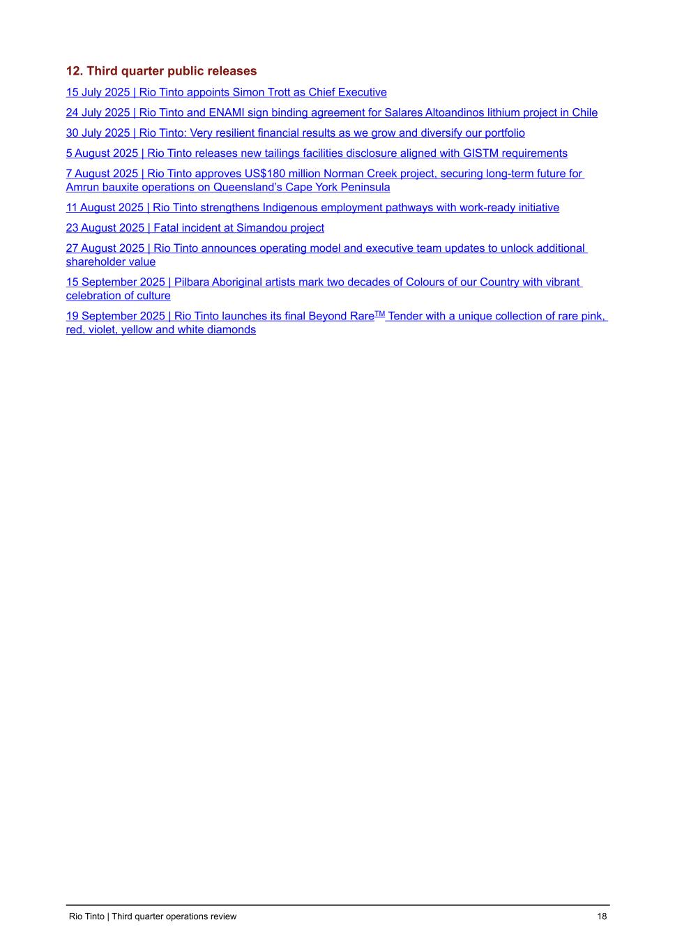 12. Third quarter public releases 15 July 2025 | Rio Tinto appoints Simon Trott as Chief Executive 24 July 2025 | Rio Tinto and ENAMI sign binding agreement for Salares Altoandinos lithium project in Chile 30 July 2025 | Rio Tinto: Very resilient financial results as we grow and diversify our portfolio 5 August 2025 | Rio Tinto releases new tailings facilities disclosure aligned with GISTM requirements 7 August 2025 | Rio Tinto approves US$180 million Norman Creek project, securing long-term future for Amrun bauxite operations on Queensland’s Cape York Peninsula 11 August 2025 | Rio Tinto strengthens Indigenous employment pathways with work-ready initiative 23 August 2025 | Fatal incident at Simandou project 27 August 2025 | Rio Tinto announces operating model and executive team updates to unlock additional shareholder value 15 September 2025 | Pilbara Aboriginal artists mark two decades of Colours of our Country with vibrant celebration of culture 19 September 2025 | Rio Tinto launches its final Beyond RareTM Tender with a unique collection of rare pink, red, violet, yellow and white diamonds Rio Tinto | Third quarter operations review 18