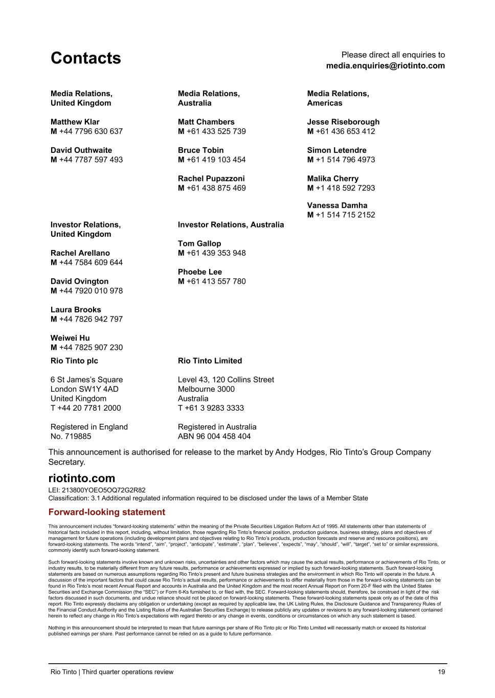 Contacts Please direct all enquiries to media.enquiries@riotinto.com Media Relations, United Kingdom Matthew Klar M +44 7796 630 637 David Outhwaite M +44 7787 597 493 Media Relations, Australia Matt Chambers M +61 433 525 739 Bruce Tobin M +61 419 103 454 Rachel Pupazzoni M +61 438 875 469 Media Relations, Americas Jesse Riseborough M +61 436 653 412 Simon Letendre M +1 514 796 4973 Malika Cherry M +1 418 592 7293 Vanessa Damha M +1 514 715 2152 Investor Relations, United Kingdom Rachel Arellano M +44 7584 609 644 David Ovington M +44 7920 010 978 Laura Brooks M +44 7826 942 797 Weiwei Hu M +44 7825 907 230 Investor Relations, Australia Tom Gallop M +61 439 353 948 Phoebe Lee M +61 413 557 780 Rio Tinto plc 6 St James’s Square London SW1Y 4AD United Kingdom T +44 20 7781 2000 Registered in England No. 719885 Rio Tinto Limited Level 43, 120 Collins Street Melbourne 3000 Australia T +61 3 9283 3333 Registered in Australia ABN 96 004 458 404 This announcement is authorised for release to the market by Andy Hodges, Rio Tinto’s Group Company Secretary. riotinto.com LEI: 213800YOEO5OQ72G2R82 Classification: 3.1 Additional regulated information required to be disclosed under the laws of a Member State Forward-looking statement This announcement includes “forward-looking statements” within the meaning of the Private Securities Litigation Reform Act of 1995. All statements other than statements of historical facts included in this report, including, without limitation, those regarding Rio Tinto’s financial position, production guidance, business strategy, plans and objectives of management for future operations (including development plans and objectives relating to Rio Tinto’s products, production forecasts and reserve and resource positions), are forward-looking statements. The words “intend”, “aim”, “project”, “anticipate”, “estimate”, “plan”, “believes”, “expects”, “may”, “should”, “will”, “target”, “set to” or similar expressions, commonly identify such forward-looking statement. Such forward-looking statements involve known and unknown risks, uncertainties and other factors which may cause the actual results, performance or achievements of Rio Tinto, or industry results, to be materially different from any future results, performance or achievements expressed or implied by such forward-looking statements. Such forward-looking statements are based on numerous assumptions regarding Rio Tinto’s present and future business strategies and the environment in which Rio Tinto will operate in the future. A discussion of the important factors that could cause Rio Tinto’s actual results, performance or achievements to differ materially from those in the forward-looking statements can be found in Rio Tinto’s most recent Annual Report and accounts in Australia and the United Kingdom and the most recent Annual Report on Form 20-F filed with the United States Securities and Exchange Commission (the “SEC”) or Form 6-Ks furnished to, or filed with, the SEC. Forward-looking statements should, therefore, be construed in light of the risk factors discussed in such documents, and undue reliance should not be placed on forward-looking statements. These forward-looking statements speak only as of the date of this report. Rio Tinto expressly disclaims any obligation or undertaking (except as required by applicable law, the UK Listing Rules, the Disclosure Guidance and Transparency Rules of the Financial Conduct Authority and the Listing Rules of the Australian Securities Exchange) to release publicly any updates or revisions to any forward-looking statement contained herein to reflect any change in Rio Tinto’s expectations with regard thereto or any change in events, conditions or circumstances on which any such statement is based. Nothing in this announcement should be interpreted to mean that future earnings per share of Rio Tinto plc or Rio Tinto Limited will necessarily match or exceed its historical published earnings per share. Past performance cannot be relied on as a guide to future performance. Rio Tinto | Third quarter operations review 19