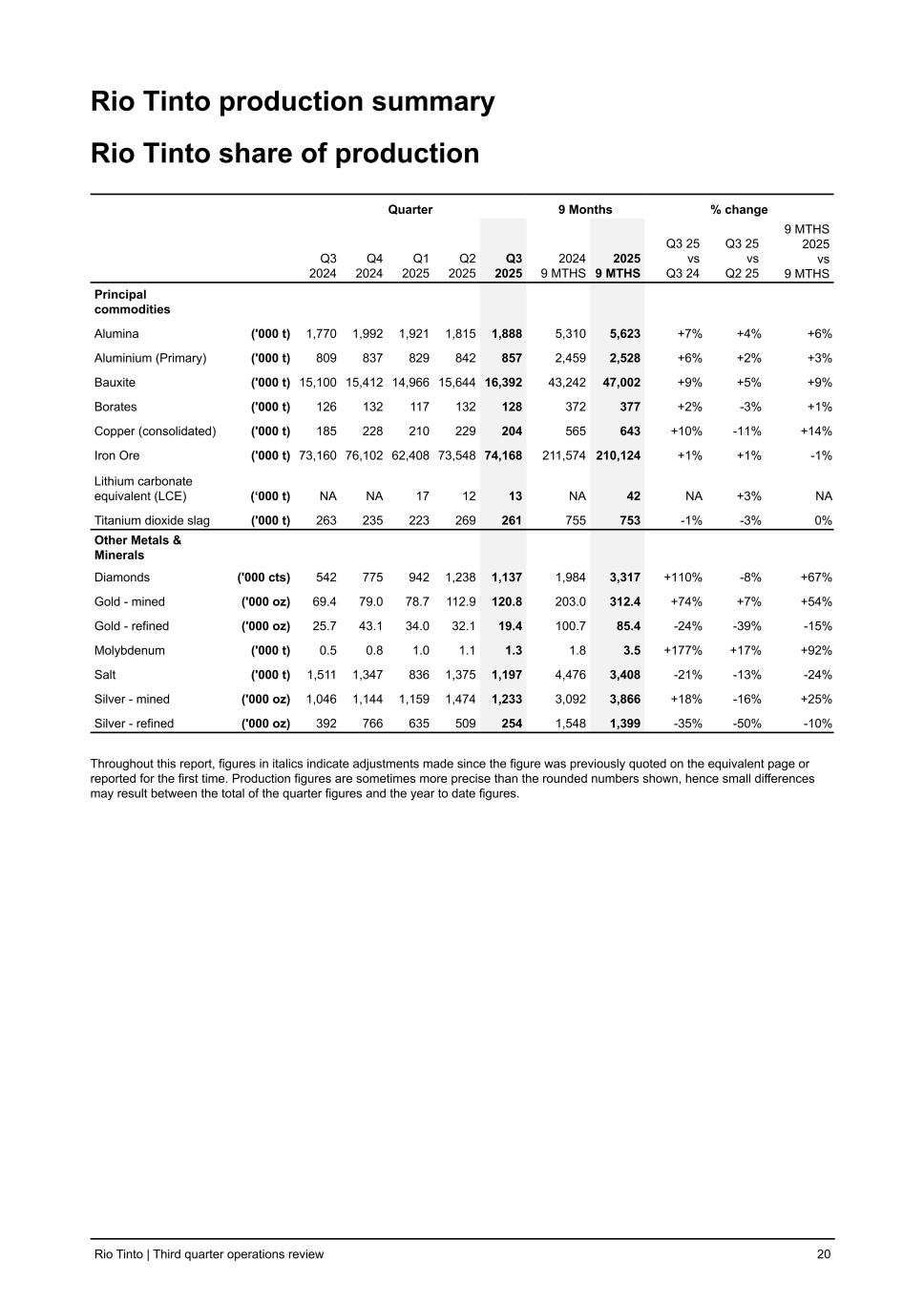 Rio Tinto production summary Rio Tinto share of production Quarter 9 Months % change Q3 2024 Q4 2024 Q1 2025 Q2 2025 Q3 2025 2024 9 MTHS 2025 9 MTHS Q3 25 vs Q3 24 Q3 25 vs Q2 25 9 MTHS 2025 vs 9 MTHS Principal commodities Alumina ('000 t) 1,770 1,992 1,921 1,815 1,888 5,310 5,623 +7 % +4 % +6 % Aluminium (Primary) ('000 t) 809 837 829 842 857 2,459 2,528 +6 % +2 % +3 % Bauxite ('000 t) 15,100 15,412 14,966 15,644 16,392 43,242 47,002 +9 % +5 % +9 % Borates ('000 t) 126 132 117 132 128 372 377 +2 % -3 % +1 % Copper (consolidated) ('000 t) 185 228 210 229 204 565 643 +10 % -11 % +14 % Iron Ore ('000 t) 73,160 76,102 62,408 73,548 74,168 211,574 210,124 +1 % +1 % -1 % Lithium carbonate equivalent (LCE) (‘000 t) NA NA 17 12 13 NA 42 NA +3 % NA Titanium dioxide slag ('000 t) 263 235 223 269 261 755 753 -1 % -3 % 0 % Other Metals & Minerals Diamonds ('000 cts) 542 775 942 1,238 1,137 1,984 3,317 +110 % -8 % +67 % Gold - mined ('000 oz) 69.4 79.0 78.7 112.9 120.8 203.0 312.4 +74 % +7 % +54 % Gold - refined ('000 oz) 25.7 43.1 34.0 32.1 19.4 100.7 85.4 -24 % -39 % -15 % Molybdenum ('000 t) 0.5 0.8 1.0 1.1 1.3 1.8 3.5 +177 % +17 % +92 % Salt ('000 t) 1,511 1,347 836 1,375 1,197 4,476 3,408 -21 % -13 % -24 % Silver - mined ('000 oz) 1,046 1,144 1,159 1,474 1,233 3,092 3,866 +18 % -16 % +25 % Silver - refined ('000 oz) 392 766 635 509 254 1,548 1,399 -35 % -50 % -10 % Throughout this report, figures in italics indicate adjustments made since the figure was previously quoted on the equivalent page or reported for the first time. Production figures are sometimes more precise than the rounded numbers shown, hence small differences may result between the total of the quarter figures and the year to date figures. Rio Tinto | Third quarter operations review 20