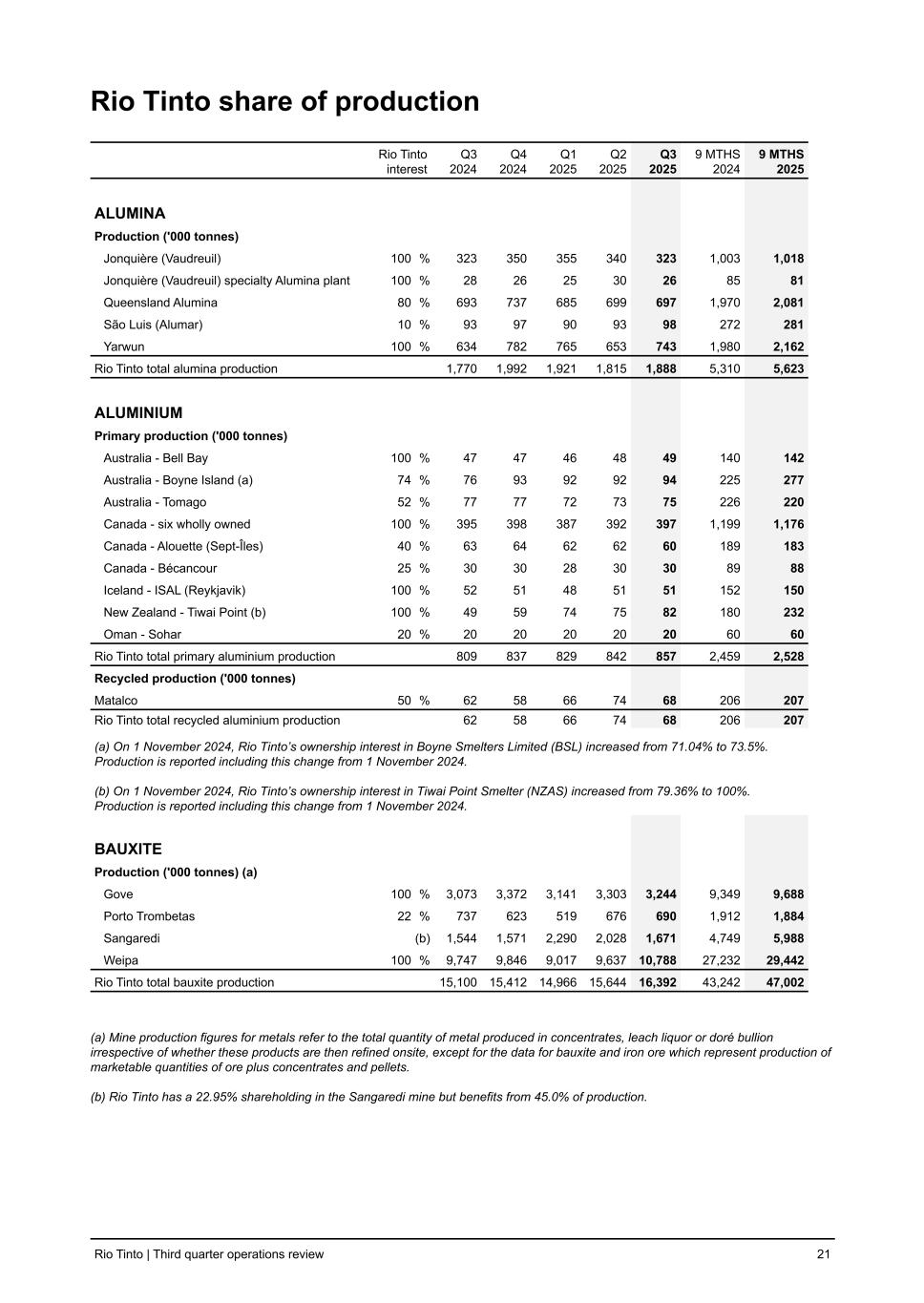 Rio Tinto share of production Rio Tinto interest Q3 2024 Q4 2024 Q1 2025 Q2 2025 Q3 2025 9 MTHS 2024 9 MTHS 2025 ALUMINA Production ('000 tonnes) Jonquière (Vaudreuil) 100 % 323 350 355 340 323 1,003 1,018 Jonquière (Vaudreuil) specialty Alumina plant 100 % 28 26 25 30 26 85 81 Queensland Alumina 80 % 693 737 685 699 697 1,970 2,081 São Luis (Alumar) 10 % 93 97 90 93 98 272 281 Yarwun 100 % 634 782 765 653 743 1,980 2,162 Rio Tinto total alumina production 1,770 1,992 1,921 1,815 1,888 5,310 5,623 ALUMINIUM Primary production ('000 tonnes) Australia - Bell Bay 100 % 47 47 46 48 49 140 142 Australia - Boyne Island (a) 74 % 76 93 92 92 94 225 277 Australia - Tomago 52 % 77 77 72 73 75 226 220 Canada - six wholly owned 100 % 395 398 387 392 397 1,199 1,176 Canada - Alouette (Sept-Îles) 40 % 63 64 62 62 60 189 183 Canada - Bécancour 25 % 30 30 28 30 30 89 88 Iceland - ISAL (Reykjavik) 100 % 52 51 48 51 51 152 150 New Zealand - Tiwai Point (b) 100 % 49 59 74 75 82 180 232 Oman - Sohar 20 % 20 20 20 20 20 60 60 Rio Tinto total primary aluminium production 809 837 829 842 857 2,459 2,528 Recycled production ('000 tonnes) Matalco 50 % 62 58 66 74 68 206 207 Rio Tinto total recycled aluminium production 62 58 66 74 68 206 207 (a) On 1 November 2024, Rio Tinto’s ownership interest in Boyne Smelters Limited (BSL) increased from 71.04% to 73.5%. Production is reported including this change from 1 November 2024. (b) On 1 November 2024, Rio Tinto’s ownership interest in Tiwai Point Smelter (NZAS) increased from 79.36% to 100%. Production is reported including this change from 1 November 2024. BAUXITE Production ('000 tonnes) (a) Gove 100 % 3,073 3,372 3,141 3,303 3,244 9,349 9,688 Porto Trombetas 22 % 737 623 519 676 690 1,912 1,884 Sangaredi (b) 1,544 1,571 2,290 2,028 1,671 4,749 5,988 Weipa 100 % 9,747 9,846 9,017 9,637 10,788 27,232 29,442 Rio Tinto total bauxite production 15,100 15,412 14,966 15,644 16,392 43,242 47,002 (a) Mine production figures for metals refer to the total quantity of metal produced in concentrates, leach liquor or doré bullion irrespective of whether these products are then refined onsite, except for the data for bauxite and iron ore which represent production of marketable quantities of ore plus concentrates and pellets. (b) Rio Tinto has a 22.95% shareholding in the Sangaredi mine but benefits from 45.0% of production. Rio Tinto | Third quarter operations review 21